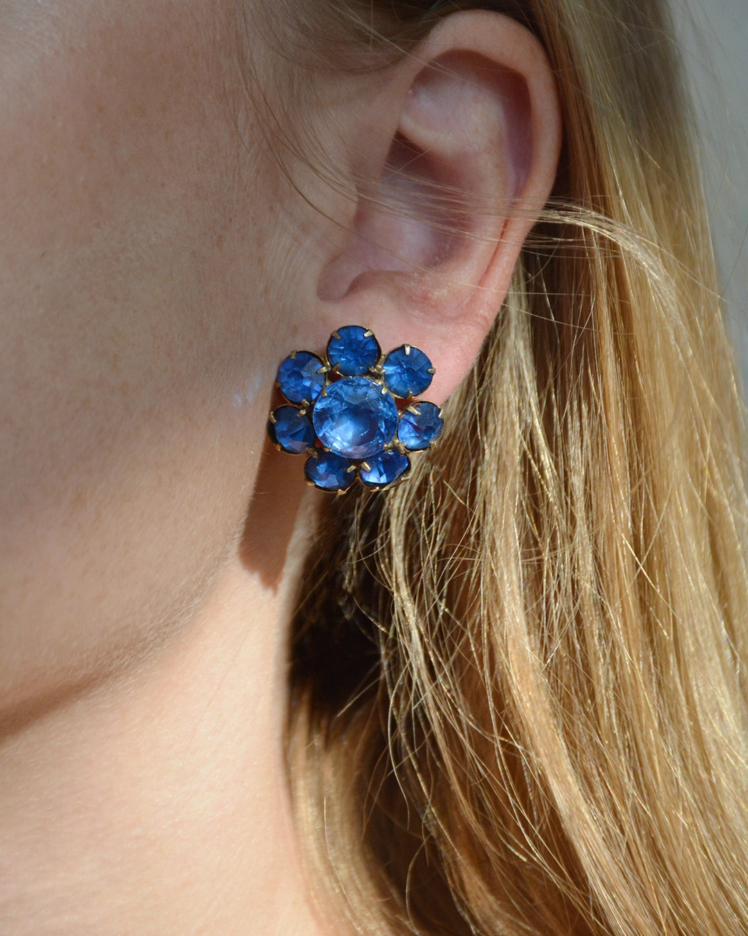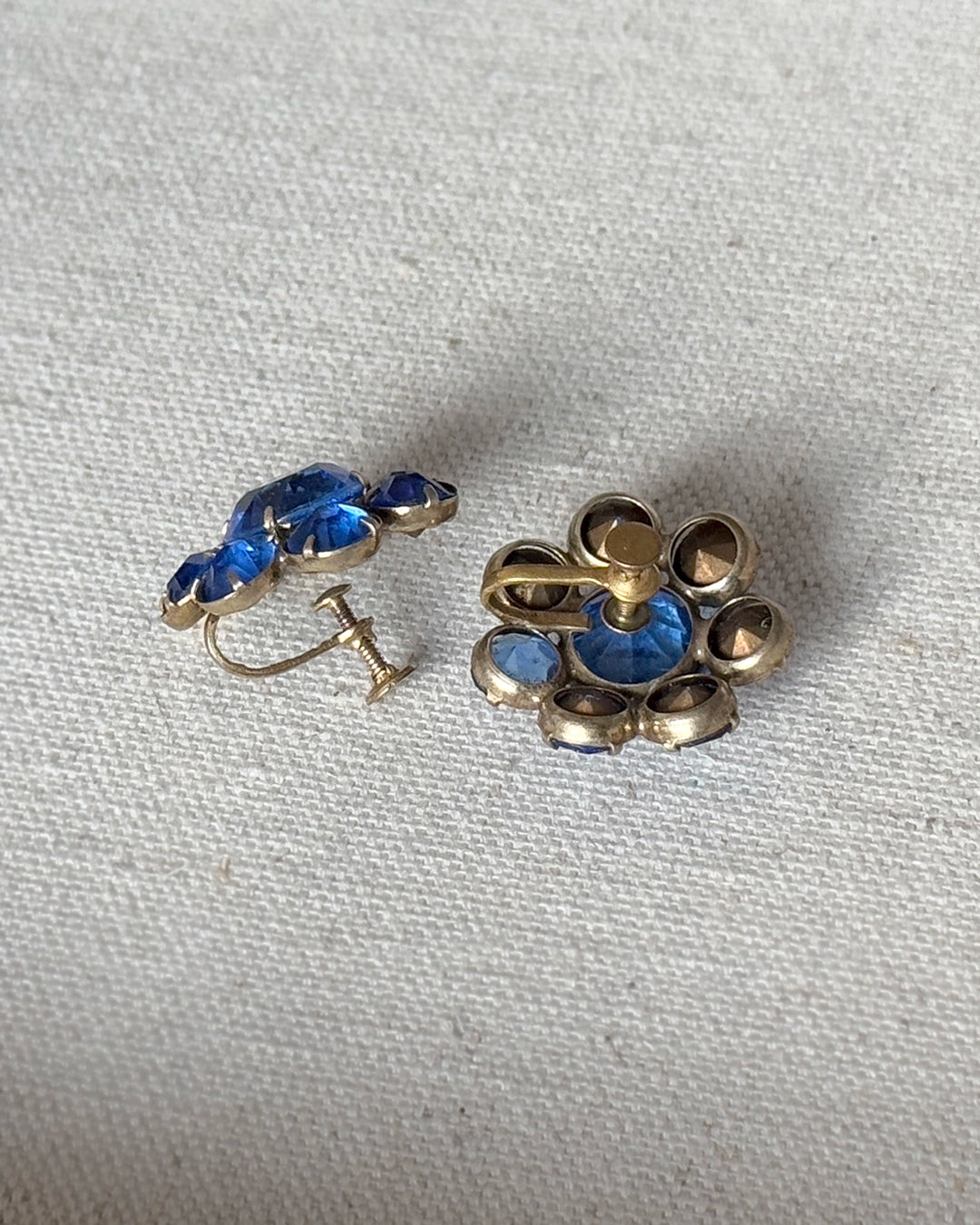 Circa 1950s, these earrings are composed of brilliant faceted blue crystal stones, in a flower formation. The blue hue makes them a great "Something Blue" (and Something Old) for a bride, and a great gift! the center stone is unfoiled, meaning there is nothing covered the back of the stone; this allows the light to fully pass through, and not only produces incredible sparkle, but really intensifies the hue of this amazing sapphire blue. these are just stunning when the light hits them! They close with a screwback, and are remarkably lightweight and comfortable to wear. Vintage earrings are so much more comfortable and secure to wear compared to their modern counterparts, largely due to the quality and thought that went into their hand-made construction.