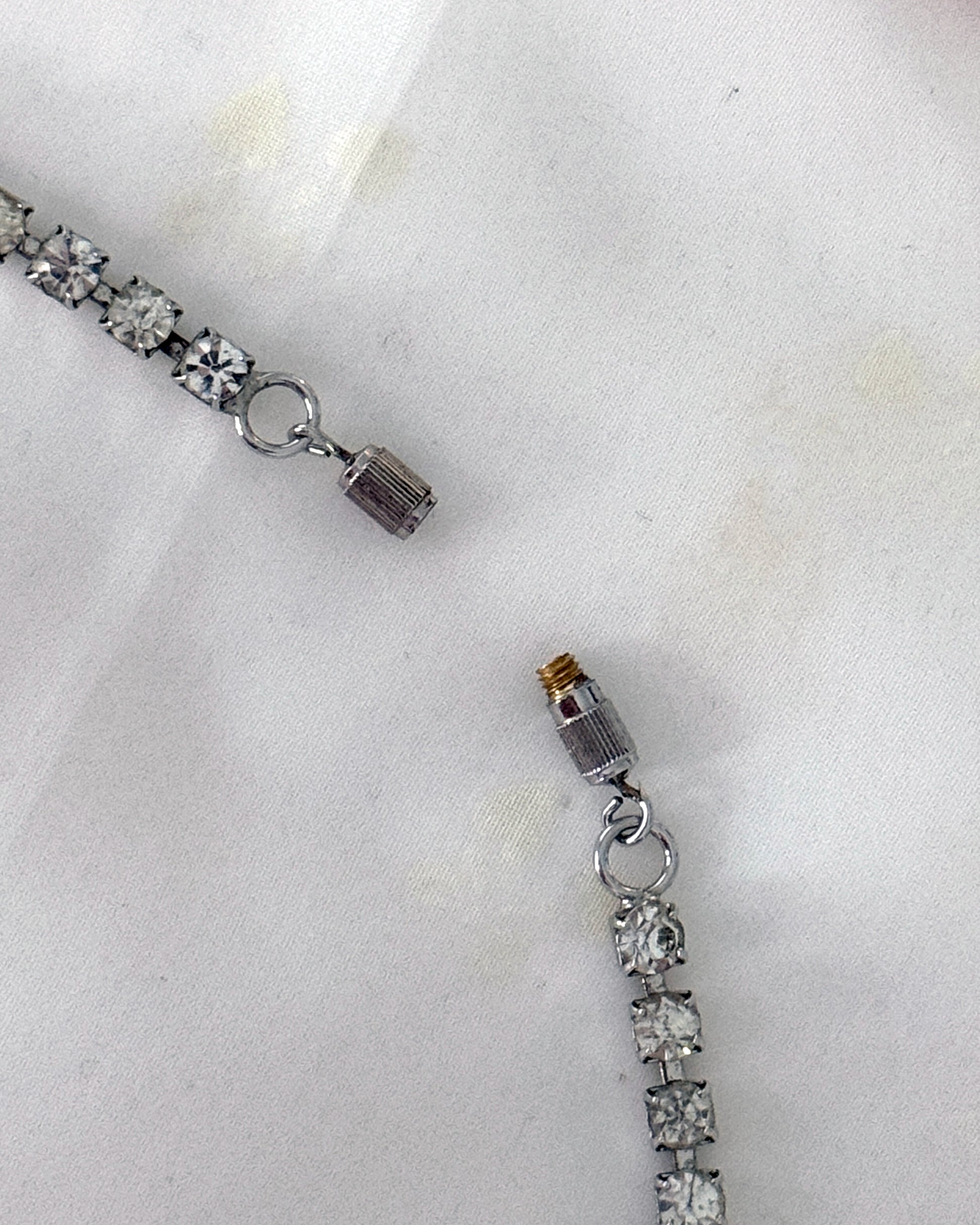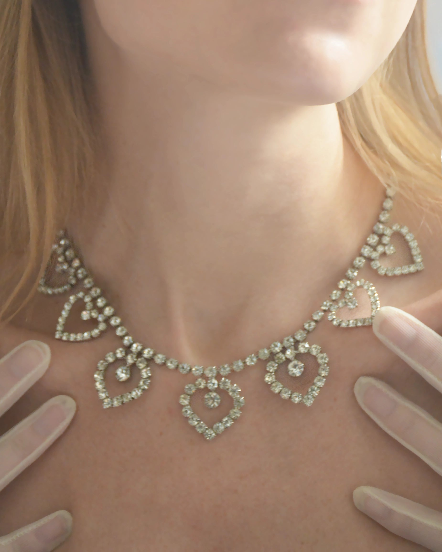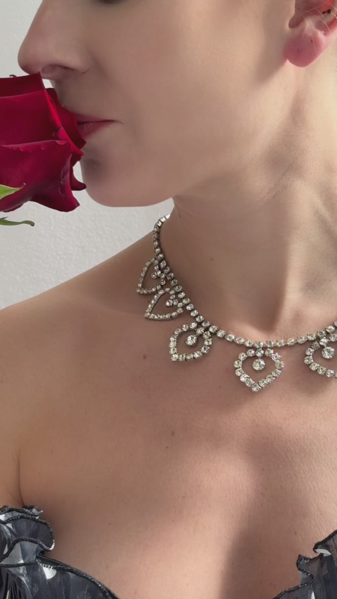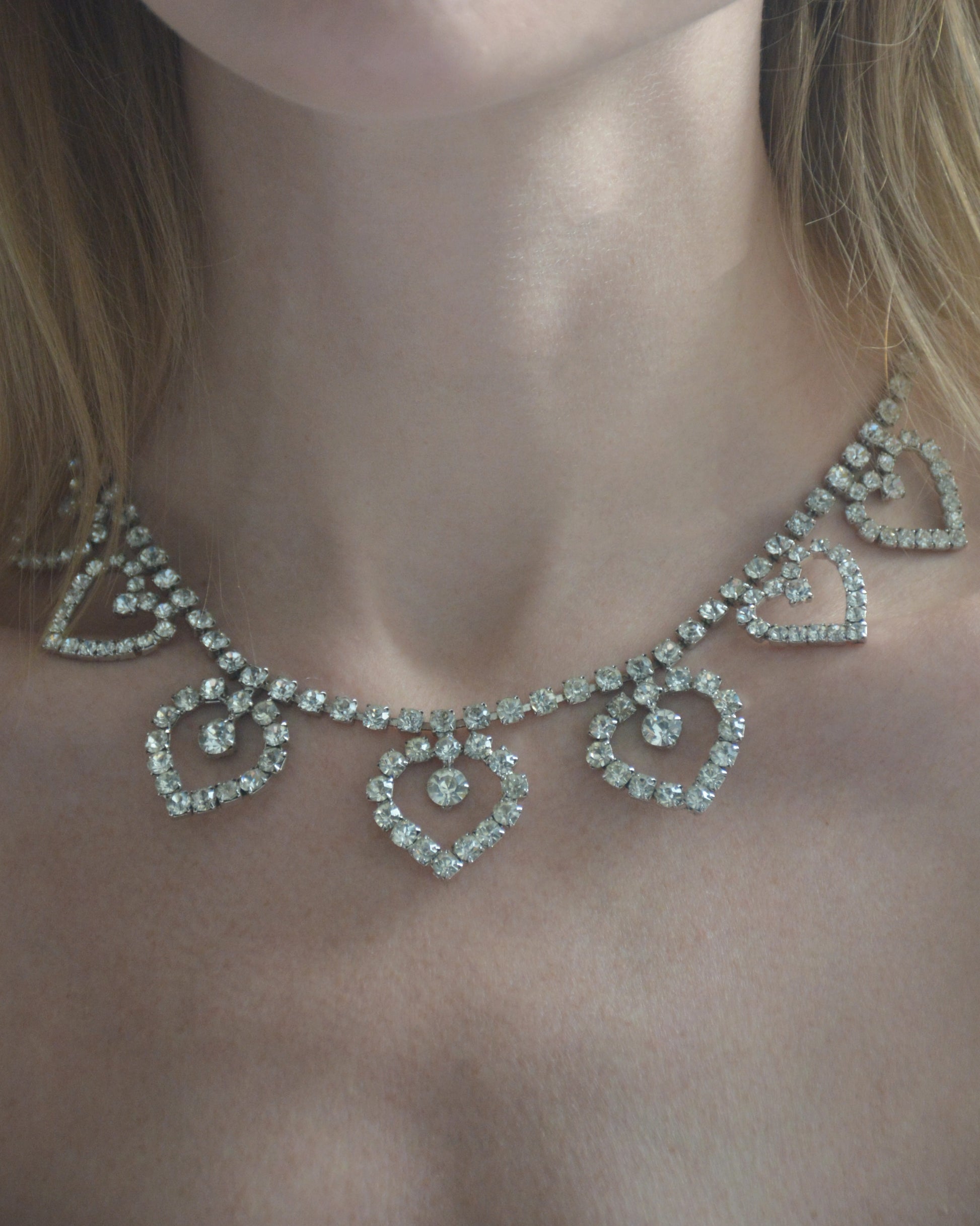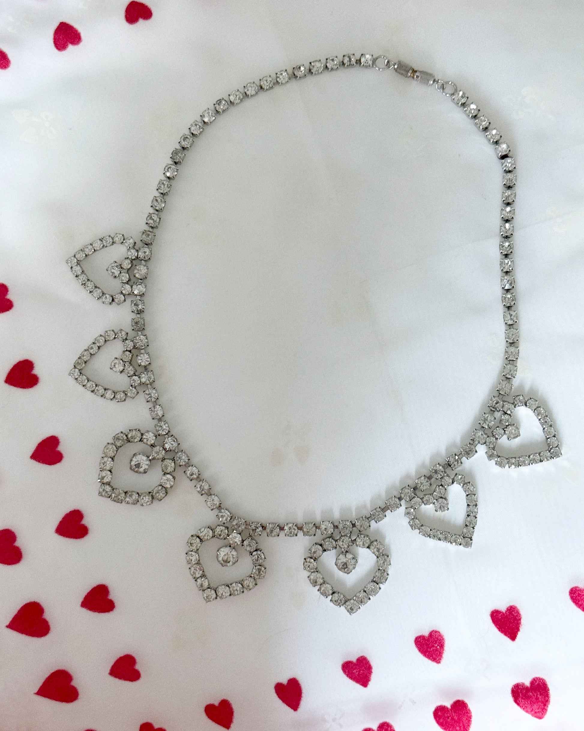 This vintage 1950s diamanté collar necklace features heart drops, with three larger hearts forming the center. These diamanté heart motifs of the 1950s are constantly referenced in highly-coveted jewelry by designers like Saint Laurent and Alessandra Rich today— but nothing beats the original! I absolutely adore this whimsical necklace— it's so elegant yet playful at the same time. It is not signed, but the prized jeweler Kramer created similar styles in this era; I've never seen one like this, though. It is very well crafted. The chain of stones is articulated to move well with the neck and body without feeling stiff. It closes with a barrel clasp in the back, measures 17.5"