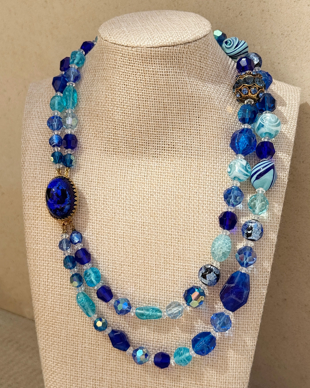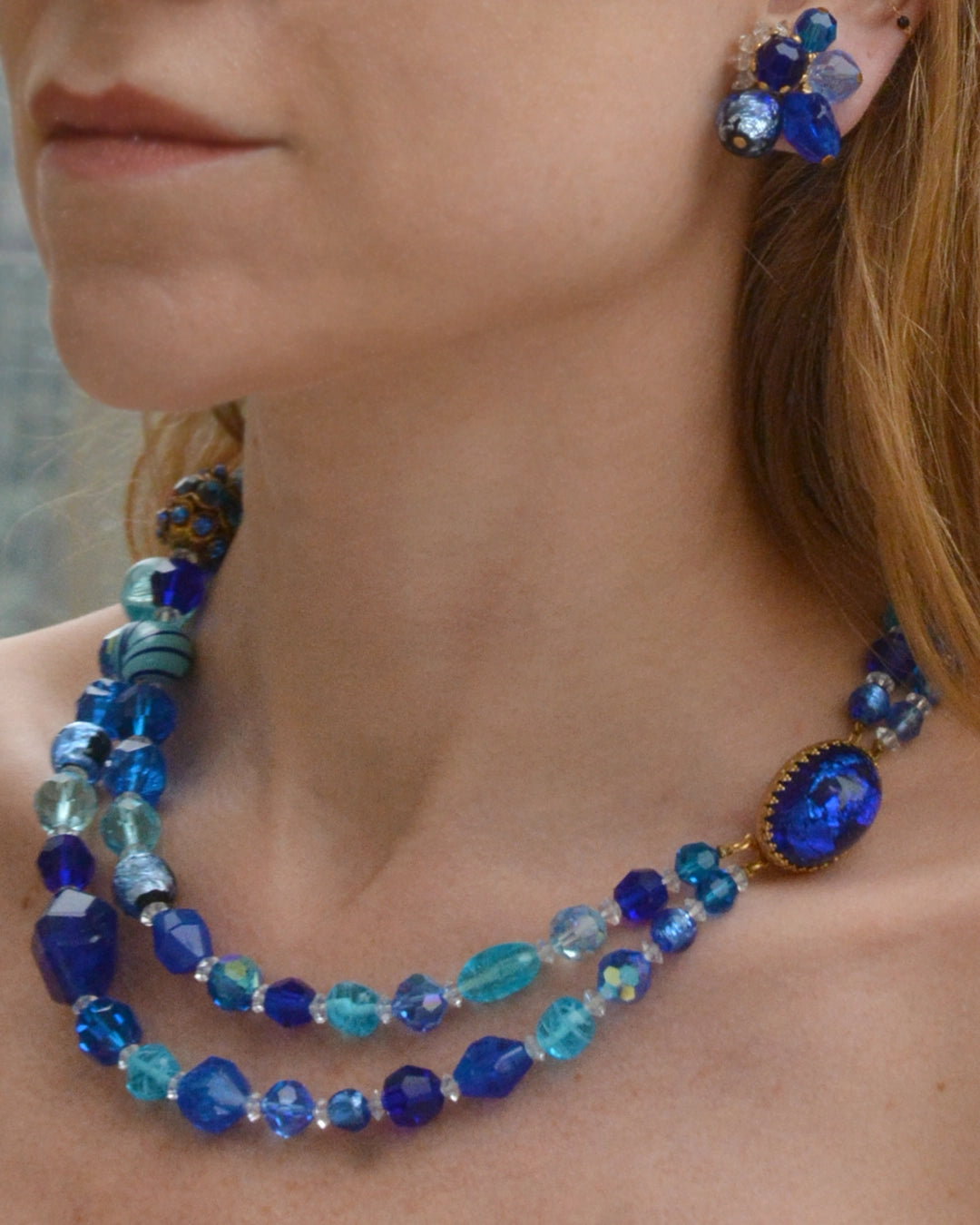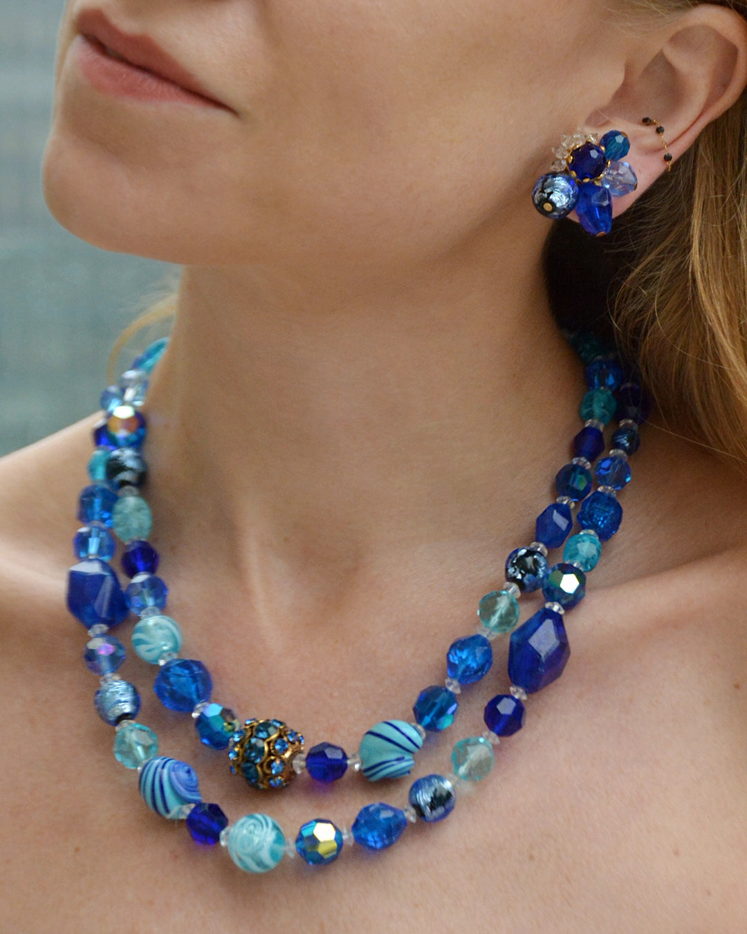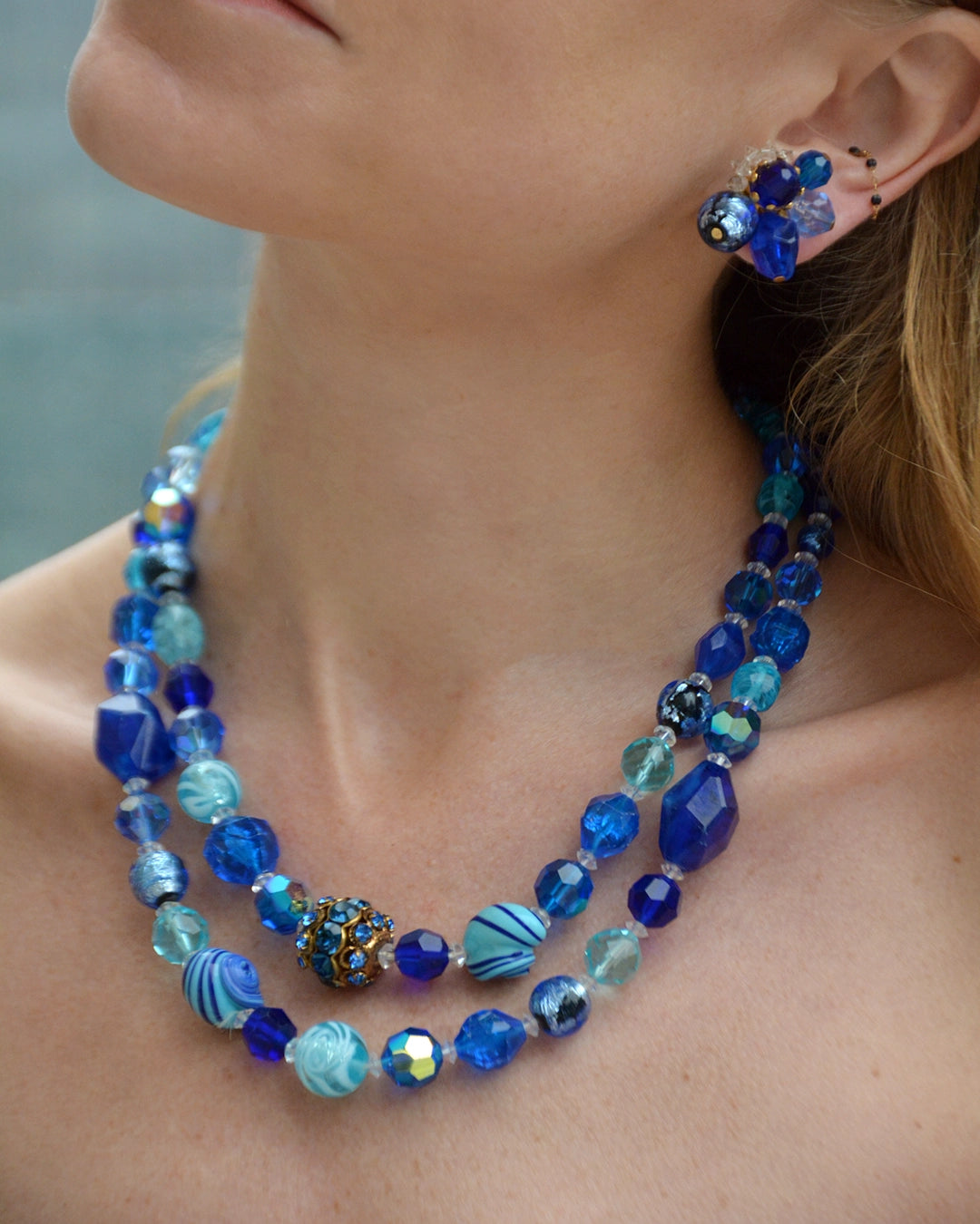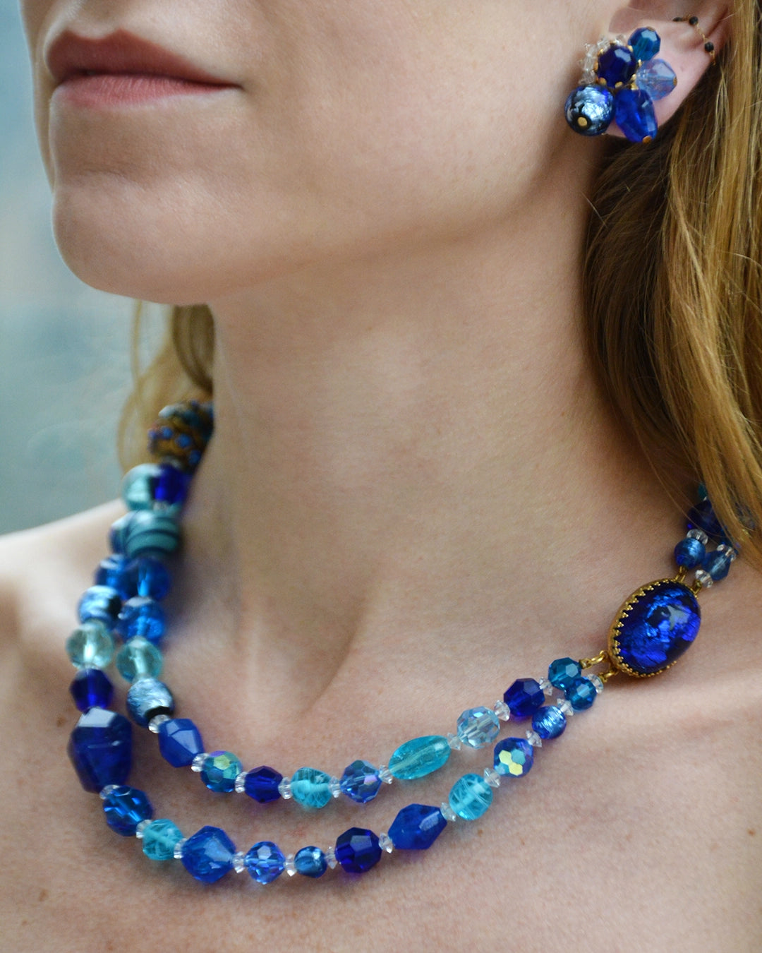 This rare vintage 1950s Hattie Carnegie demi-parure consists of a double-strand necklace, and matching stud earrings. Hattie Carnegie is a pioneering female American designer who began her career as a milliner in 1909 and eventually expanded to ready-to-wear in 1919, and to jewelry in the 1930s. Pieces by Hattie Carnegie are held in museums around the world, including the Metropolitan Museum of Art's Costume Institue in New York City. These pieces are made from the unusual, high-quality Pate de Verre beads typically used by Hattie Carnegie, which have a stunning marbled effect that draw the eye in. I love that the necklace has a stunning lapis lazuli-effect clasp, which can be worn in the back, or to one side. The necklace measures around 21" total length, and the clip-on earrings are about 3 cm in length. Signed Hattie Carnegie.