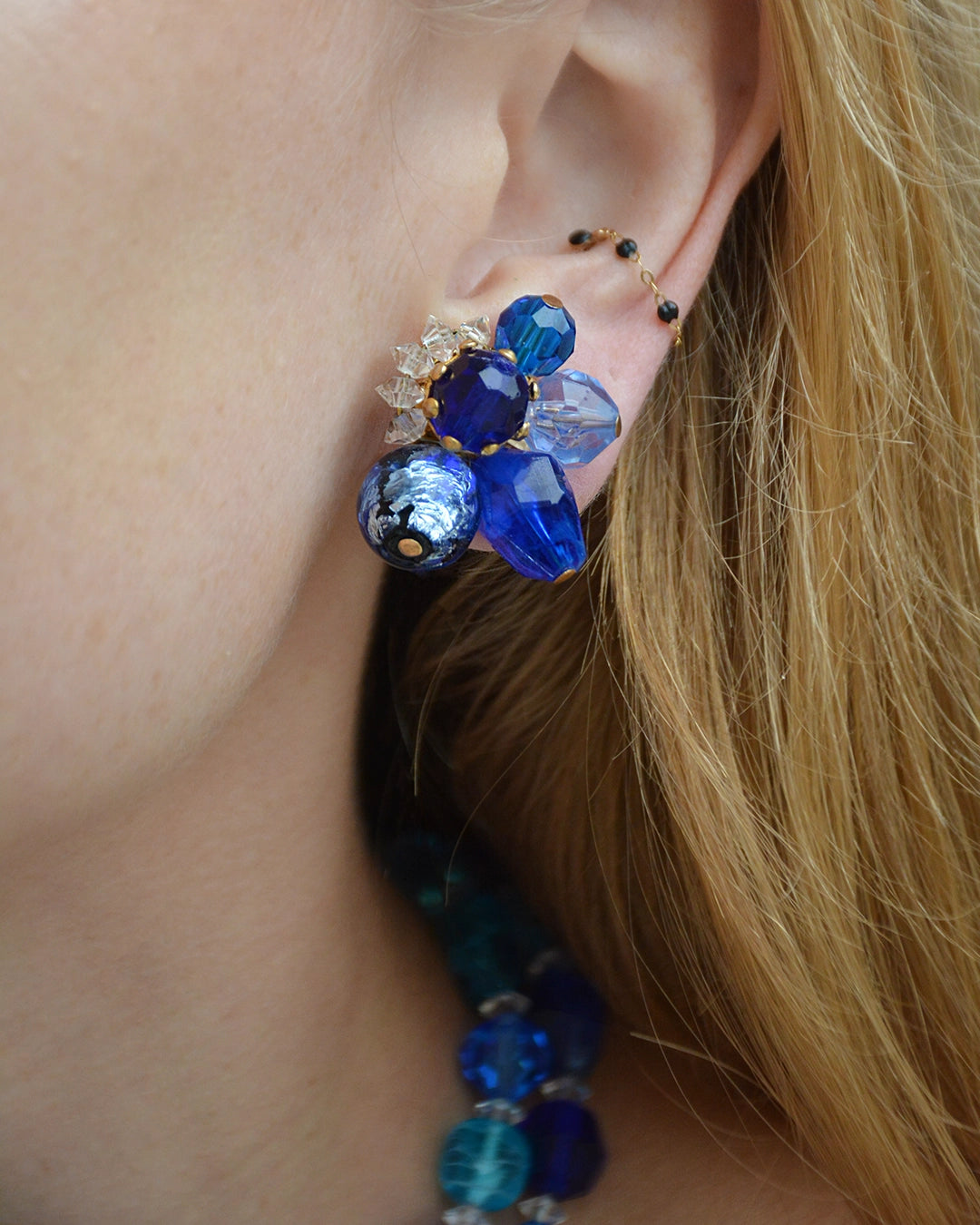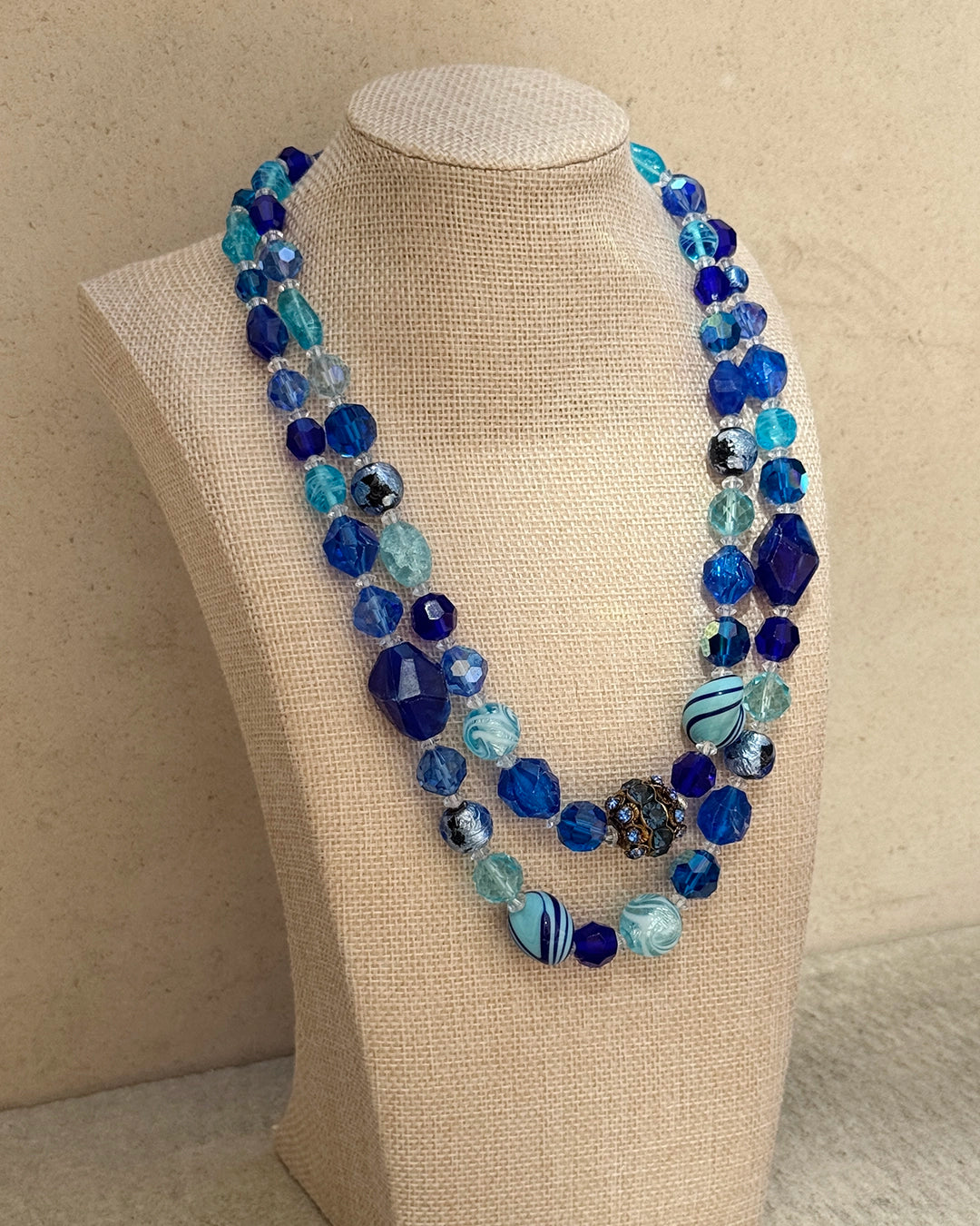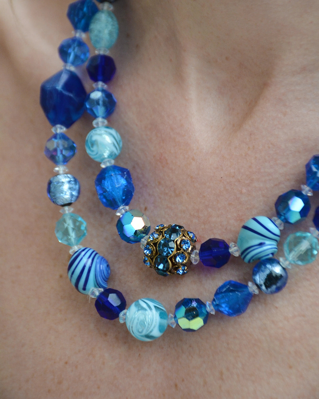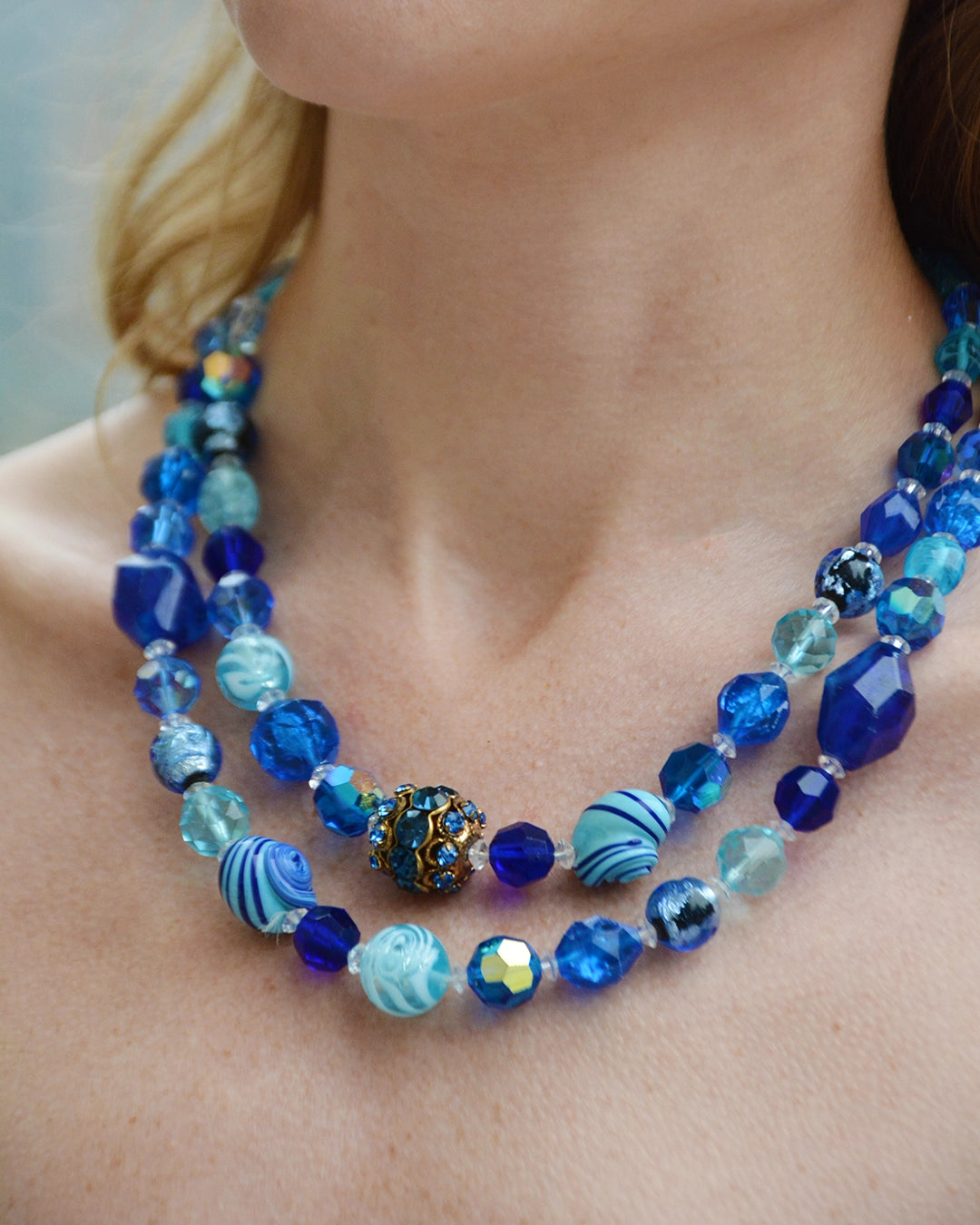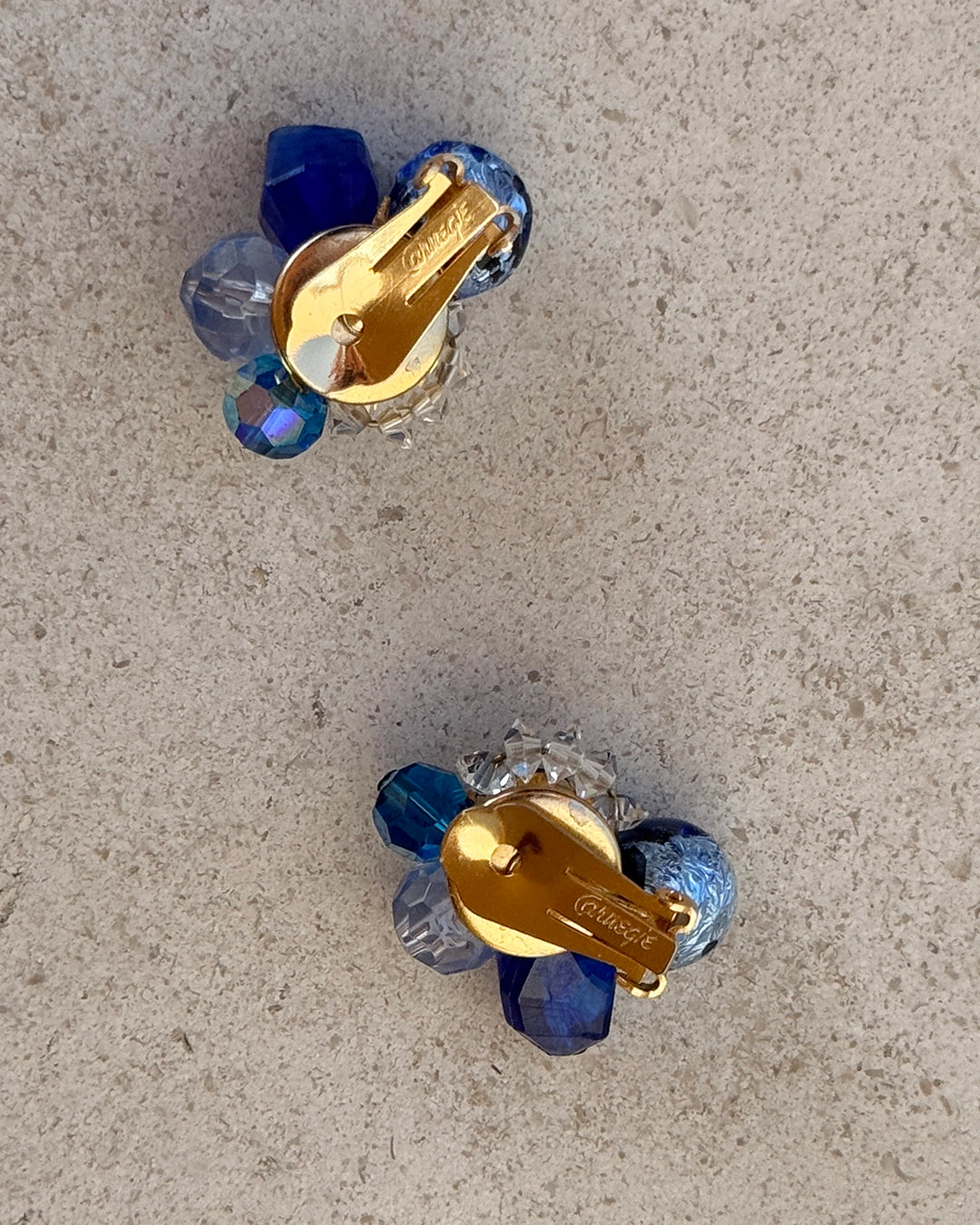 This rare vintage 1950s Hattie Carnegie demi-parure consists of a double-strand necklace, and matching stud earrings. Hattie Carnegie is a pioneering female American designer who began her career as a milliner in 1909 and eventually expanded to ready-to-wear in 1919, and to jewelry in the 1930s. Pieces by Hattie Carnegie are held in museums around the world, including the Metropolitan Museum of Art's Costume Institue in New York City. These pieces are made from the unusual, high-quality Pate de Verre beads typically used by Hattie Carnegie, which have a stunning marbled effect that draw the eye in. I love that the necklace has a stunning lapis lazuli-effect clasp, which can be worn in the back, or to one side. The necklace measures around 21" total length, and the clip-on earrings are about 3 cm in length. Signed Hattie Carnegie.