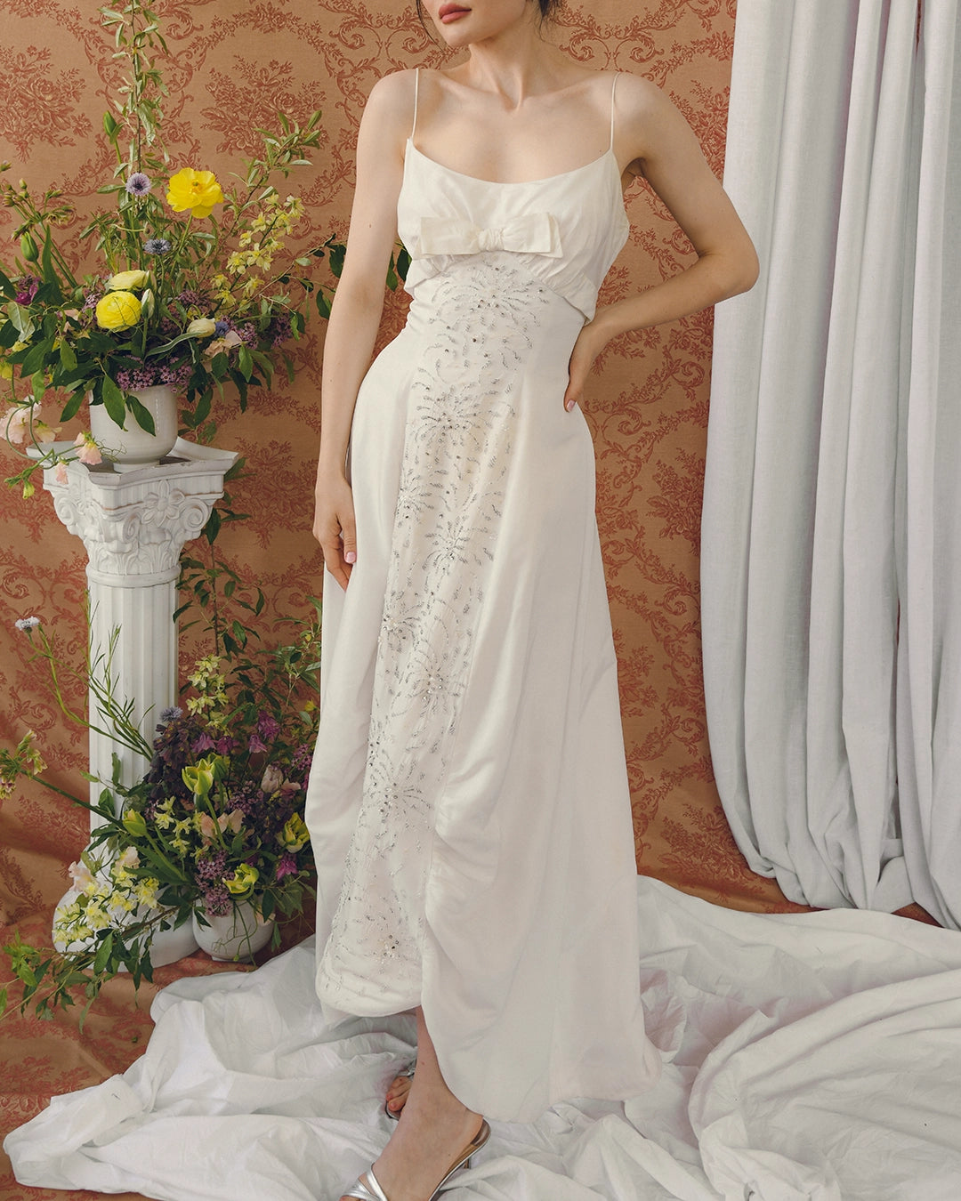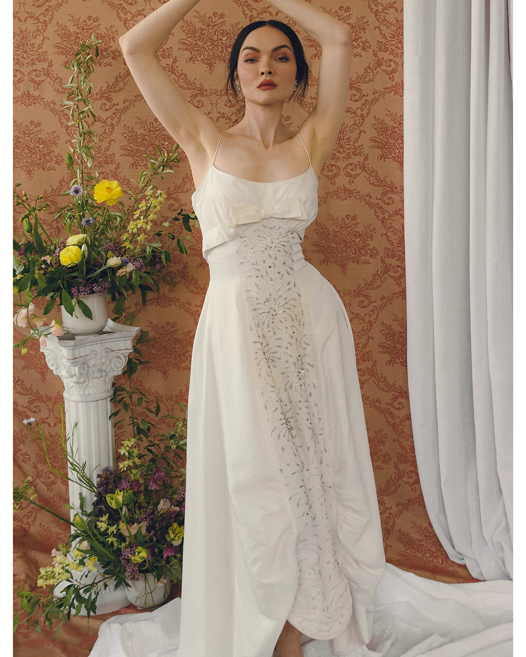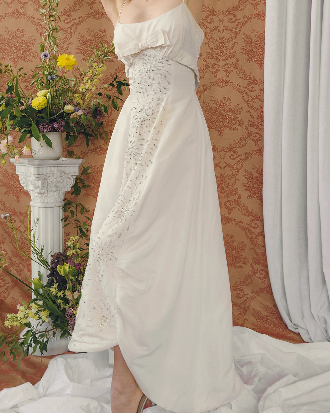 This vintage 1950s bridal dress is truly remarkable and so special— it reminds me of a dress Audrey Hepburn would have worn in the 1950s. The shape of the dress and construction are unbelievable, with boning on the sides of the bodice creating a fitted corset-like shape. The bustled shape of the skirt is so unique— it's gathered along the seams of the embellished front panel towards the hem, making the front part shorter (which is also very convenient for ease of movement.) These is curved boning in the hem's front panel to create the perfect shape.