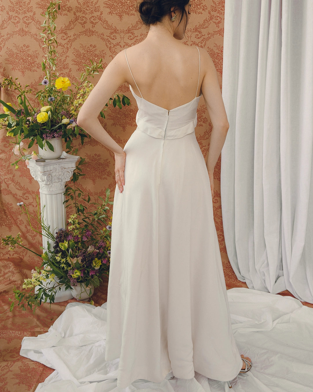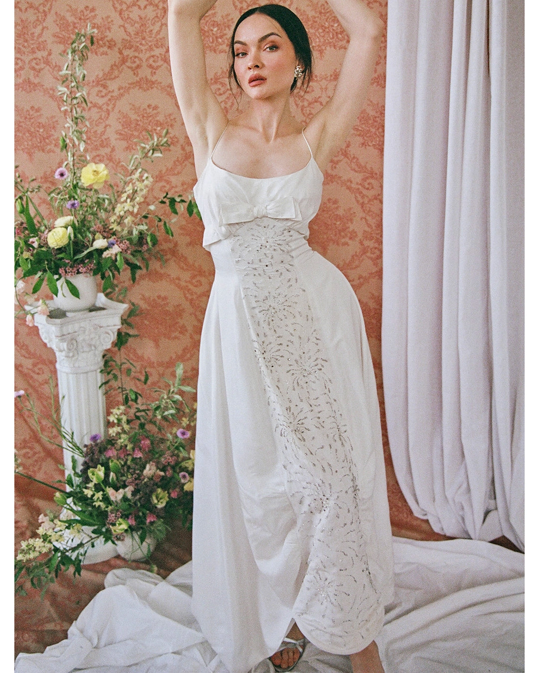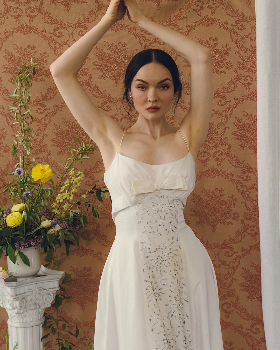 This vintage 1950s bridal dress is truly remarkable and so special— it reminds me of a dress Audrey Hepburn would have worn in the 1950s. The shape of the dress and construction are unbelievable, with boning on the sides of the bodice creating a fitted corset-like shape. The bustled shape of the skirt is so unique— it's gathered along the seams of the embellished front panel towards the hem, making the front part shorter (which is also very convenient for ease of movement.) These is curved boning in the hem's front panel to create the perfect shape.
