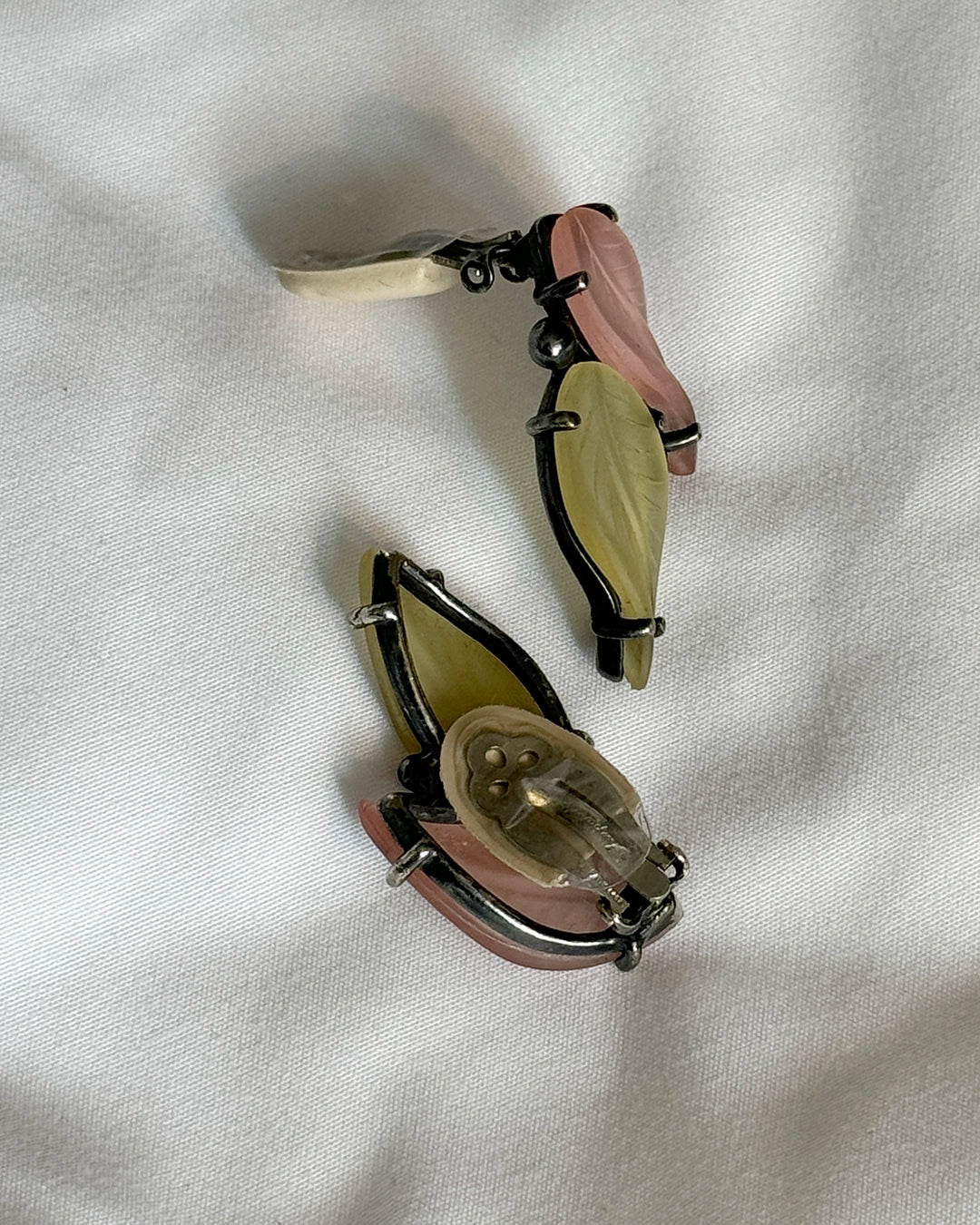 Circa 1954, the earrings are crafted of glass, reminiscent of Lalique glass, sculpted and etched with lifelike precision. The glass stones are unfoiled and without backs, so when the light hits them, they glow with a sublime warmth, becoming almost transparent. I love the way they sit on the ear, curving upward to frame the face. They are finished with a clip-on lever back and are SO comfortable to wear and lightweight on the ear; vintage clip-ons are so much more comfortable and secure to wear compared to their modern counterparts, largely due to the quality and thought that went into their hand-made construction. This particular pair is hallmarked with patent #156453, a 1949 design patent awarded to this specific lever back for its unique ability to remain secure on the ear, without pinching, thereby ensuring hours of comfort. Additionally, they come with a padded sleeve on the lever to enhanced comfort and support. Made in France and signed "Schiaparelli" and hallmarked with patent #156453 (see above). Measures about 42 mm long x 22 mm at widest point.