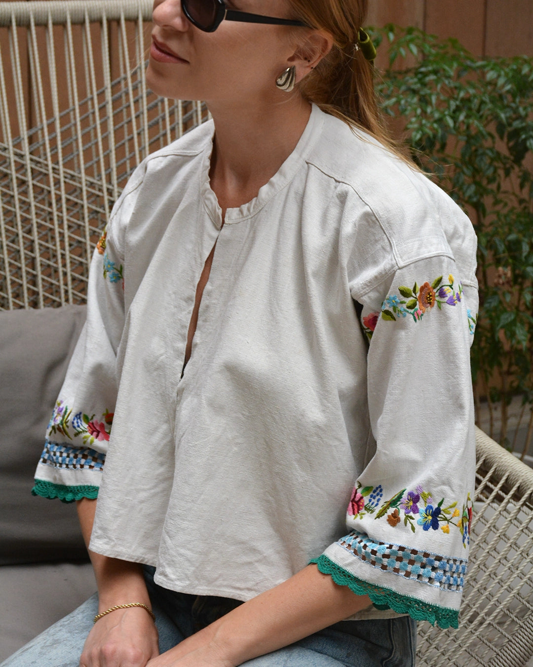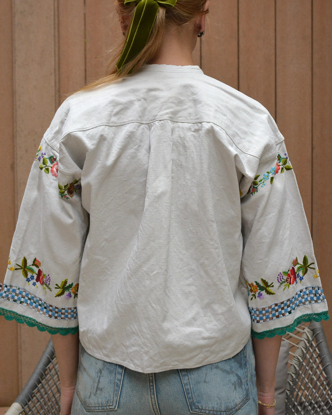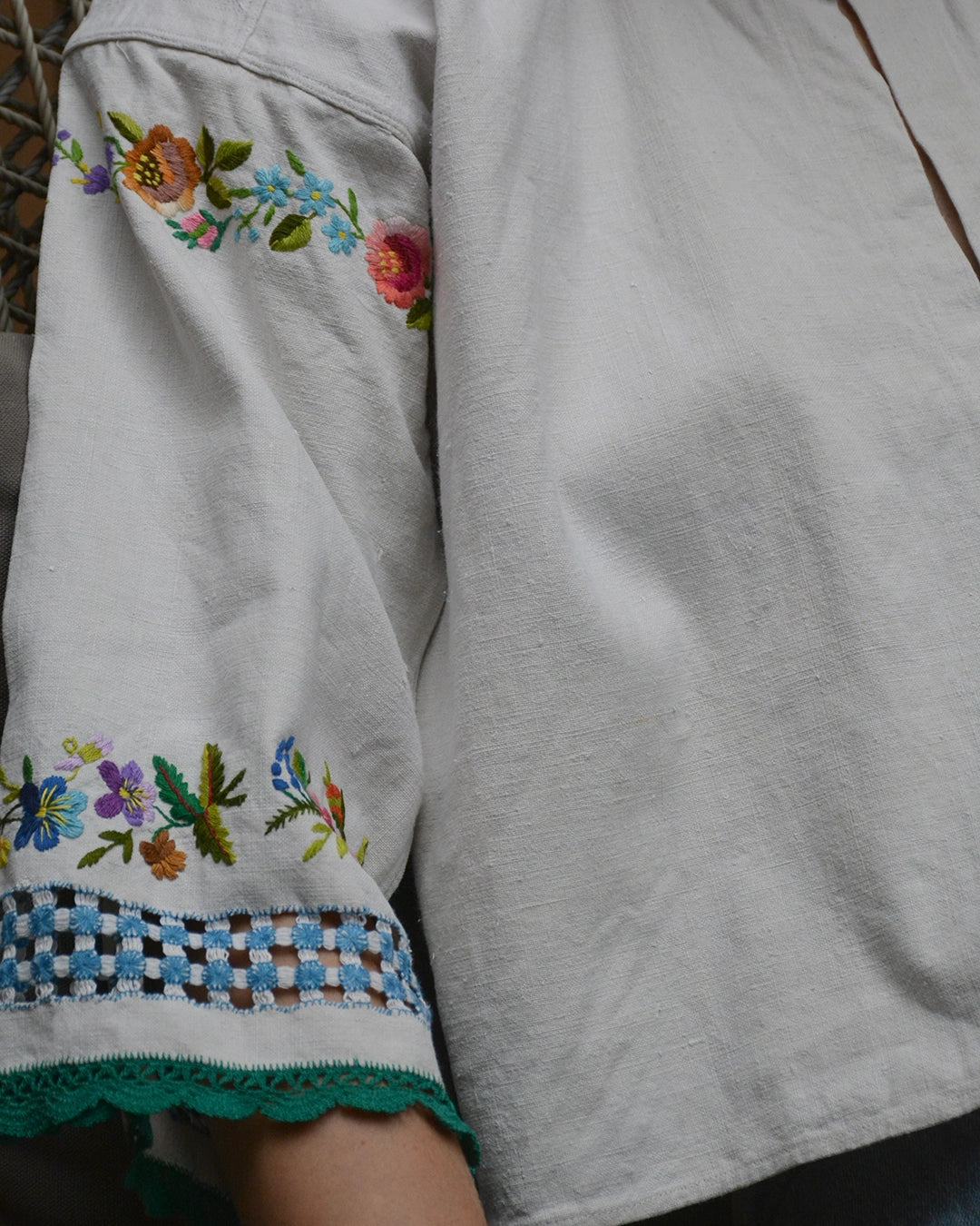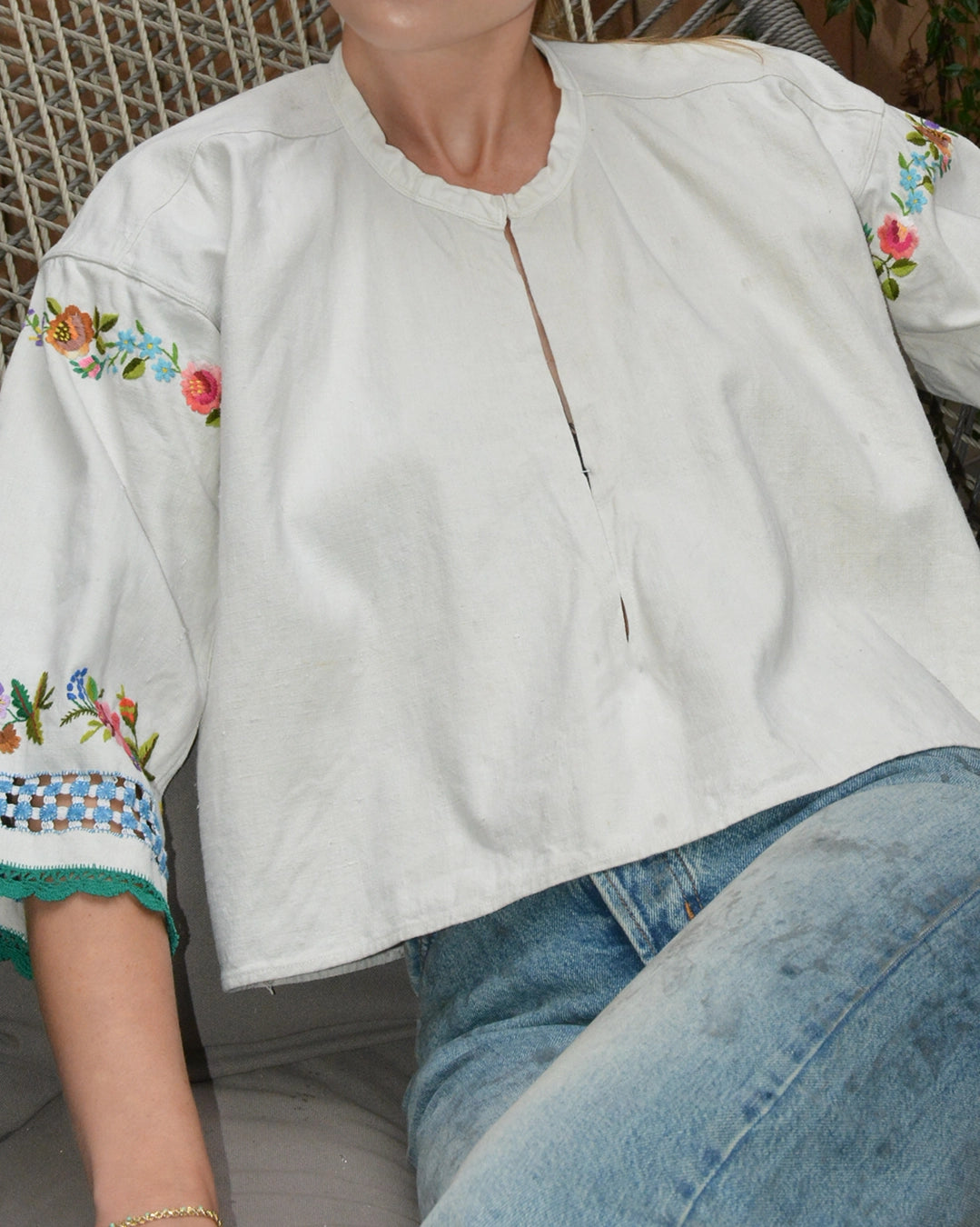 This incredible rare authentic vintage embroidered peasant blouse was made in present day Poland/Ukraine, and features the most beautiful hand-embroidery, with lattice open-work at the sleeves. Circa late 1940s/early 1950s, the heavy linen it is crafted from has a unique ability to hold its structure, which is especially helpful with the cropped yet intentionally oversized silhouette. The split neck has a hidden hook/eye closure at the chest. The shoulders are dropped, with 3/4 sleeves that flare to a slight bell shape. The cropped length makes it so easy to wear and flattering, especially just with simple jeans. (It would have been worn with a skirt, apron, etc. as part of traditional folk dress.)