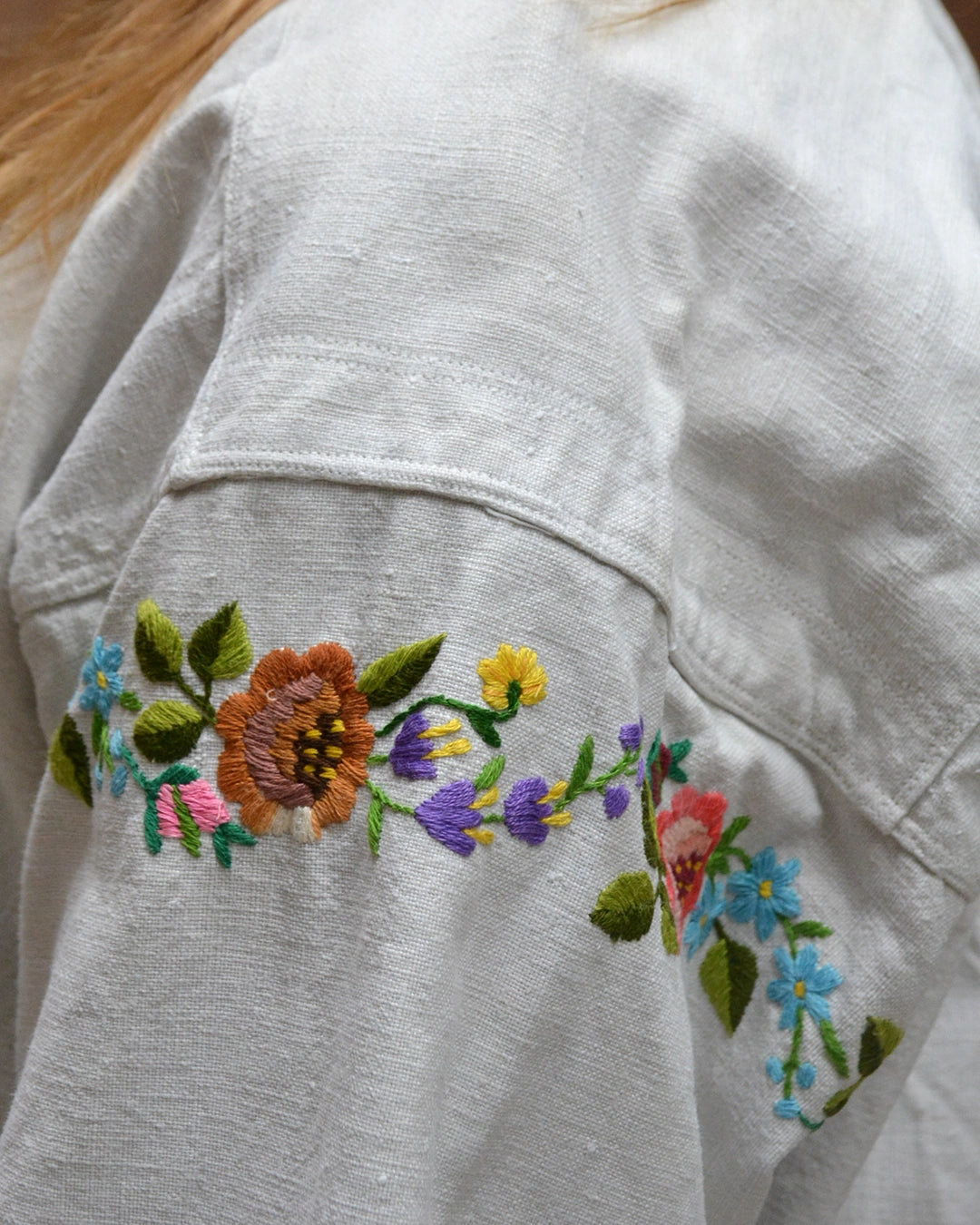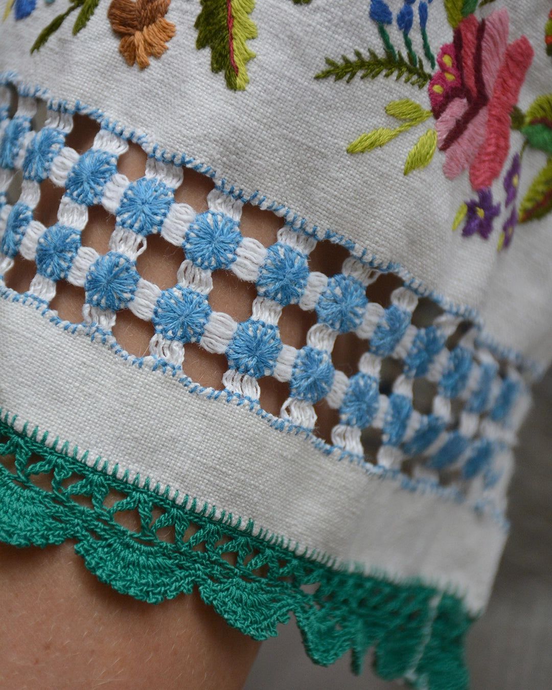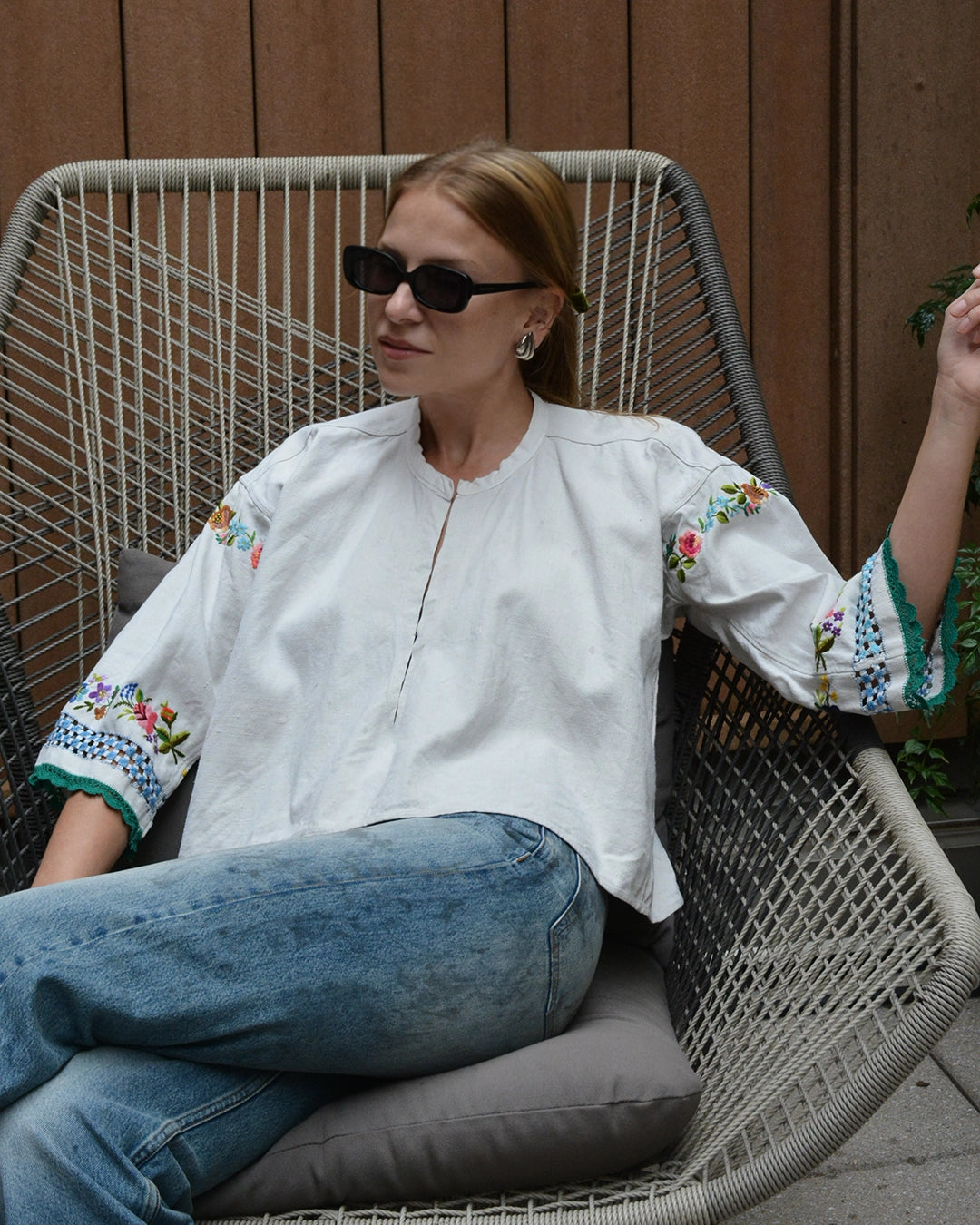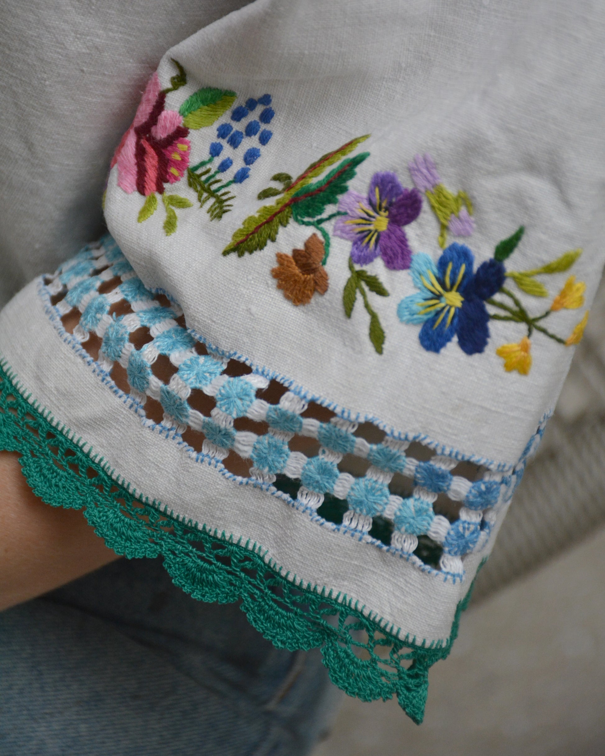 This incredible rare authentic vintage embroidered peasant blouse was made in present day Poland/Ukraine, and features the most beautiful hand-embroidery, with lattice open-work at the sleeves. Circa late 1940s/early 1950s, the heavy linen it is crafted from has a unique ability to hold its structure, which is especially helpful with the cropped yet intentionally oversized silhouette. The split neck has a hidden hook/eye closure at the chest. The shoulders are dropped, with 3/4 sleeves that flare to a slight bell shape. The cropped length makes it so easy to wear and flattering, especially just with simple jeans. (It would have been worn with a skirt, apron, etc. as part of traditional folk dress.)