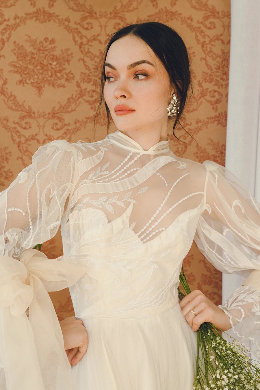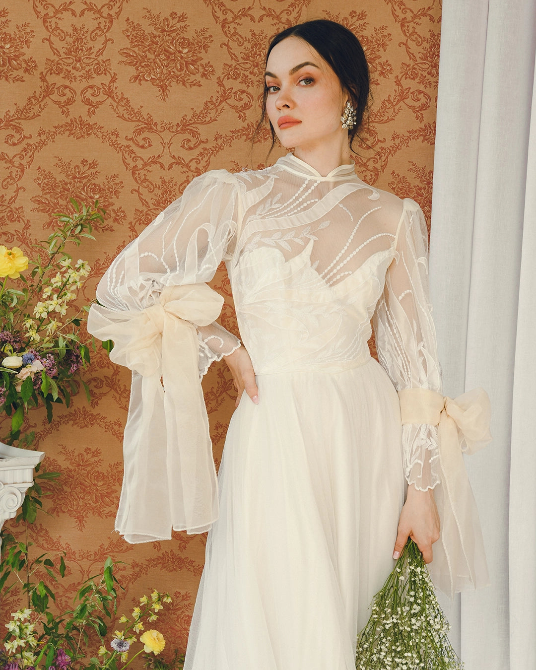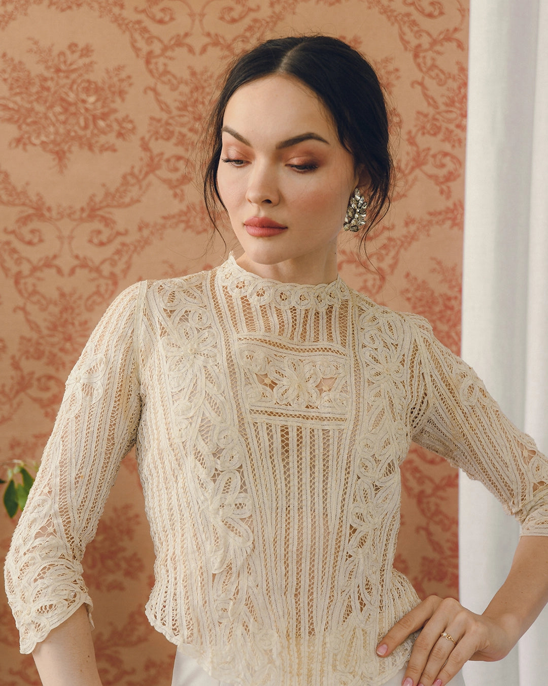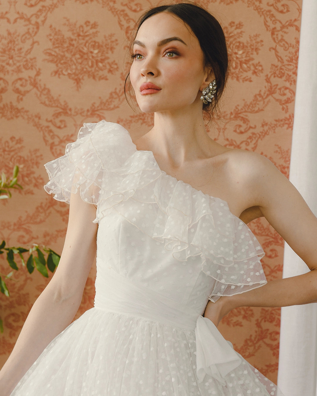 The VINTAGE 1950s TULLE SWISS DOT ONE-SHOULDER GOWN, VINTAGE BOW-SLEEVE MERMAID GOWN, and ANTIQUE BATTENBURG LACE BODICE pictured are also available.