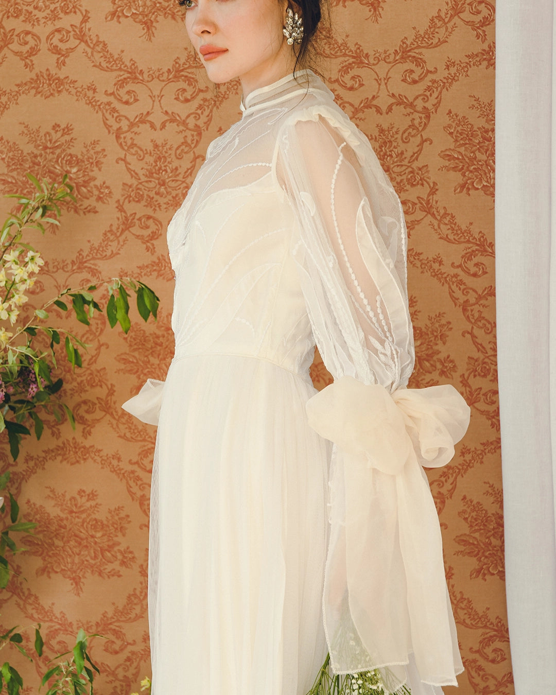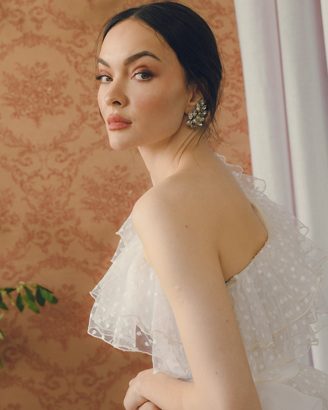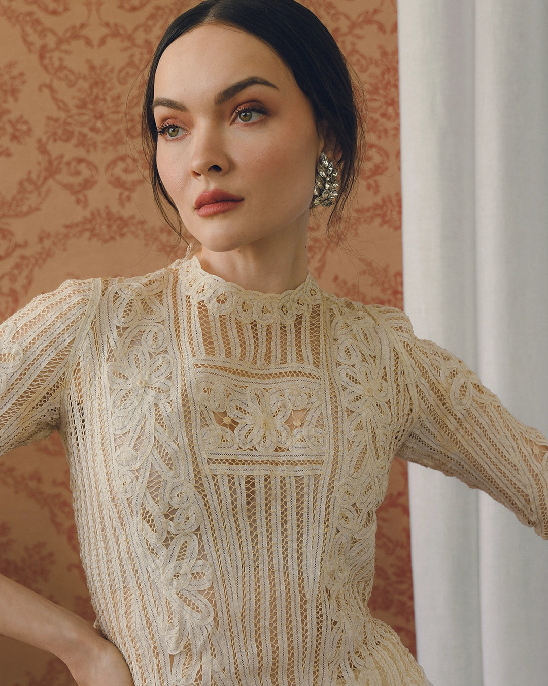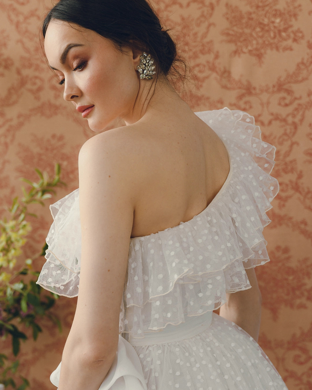 The VINTAGE 1950s TULLE SWISS DOT ONE-SHOULDER GOWN, VINTAGE BOW-SLEEVE MERMAID GOWN, and ANTIQUE BATTENBURG LACE BODICE pictured are also available.