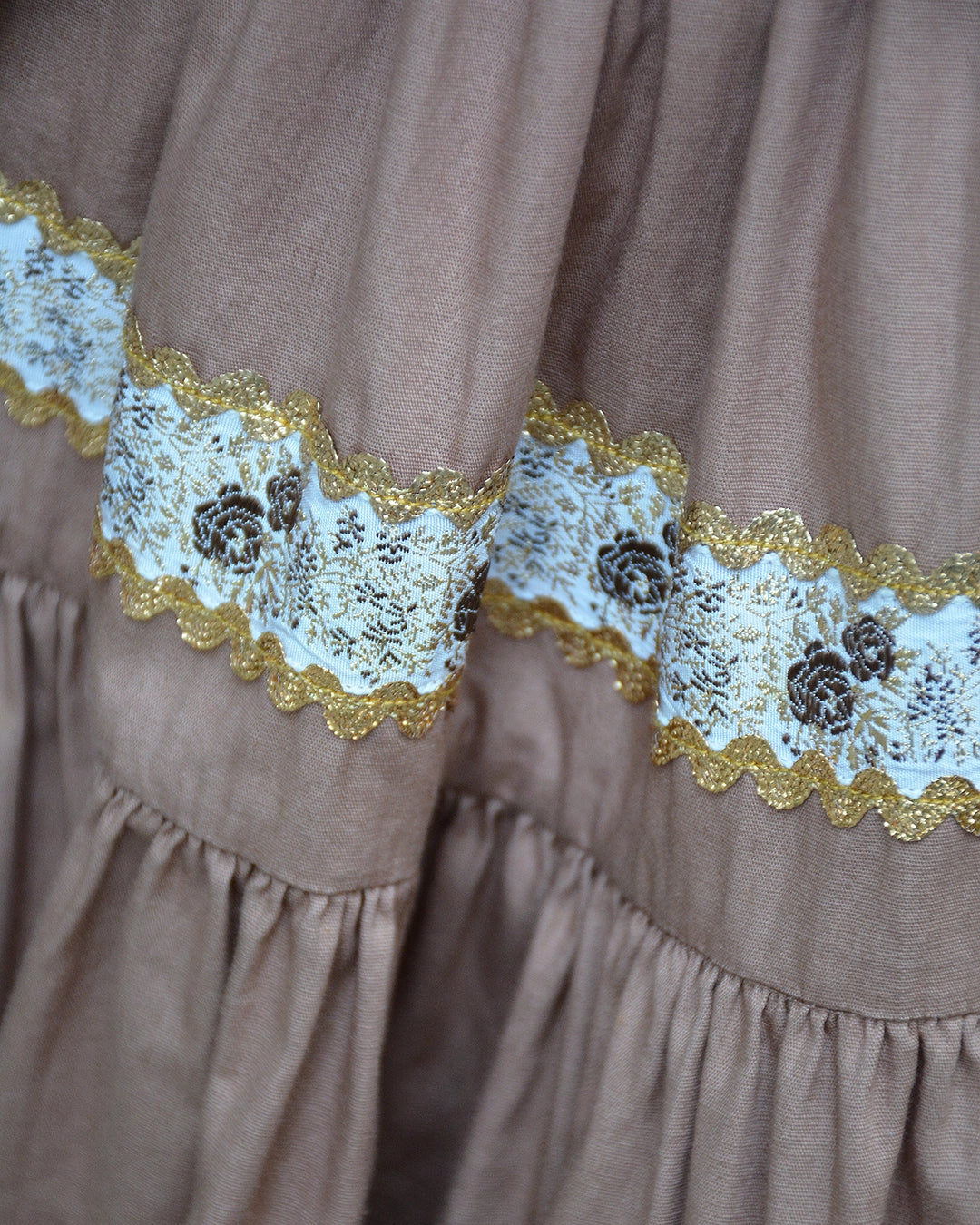 I love a vintage 1950s circle skirt because they are so versatile and wearable, and this piece is no exception— it's so easy to throw on with a tiny top on sweltering summer days, but it will be just as cute layered with knit stocking, boots, cardigans, etc. come fall and winter. The neutral toffee color only adds to the wearability. Made of lightweight cotton, this skirt features gathered tiers, which form a true circle skirt shape with lots and lots of volume, creating gorgeous movement with your every turn. I adore the Tyrolean ribbon appliqué separating each tier, which is bordered by metallic gold ric rac trim on either side. It's so beautifully made, with each seam finished with such care. Wear with a crinoline petticoat underneath for even more volume, creating that 1950s hourglass shape. Closes at the side waistband with snaps and hooks.