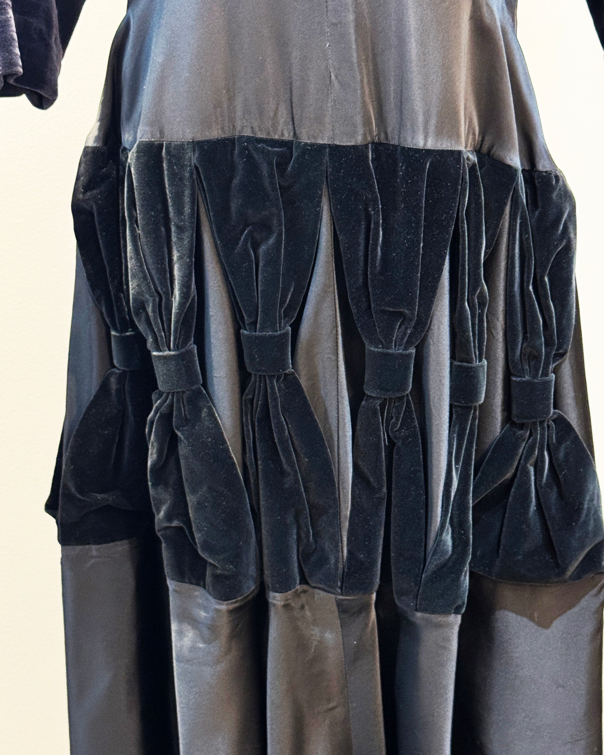 This incredible 1950s black velvet dress features the most unusual bow details throughout the skirt— I've never seen anything quite like it! The oversized bows are positioned vertically, defining the entire design. The velvet bodice is fitted, with a separate satin-like panel below the waist creating almost a drop-waist silhouette, with a full skirt— combined with the wide V-neck and half-length sleeves, it all feels very much in the style of Christian Dior's "New Look," complete with sloped, dropped shoulders. It closes with a side zipper.