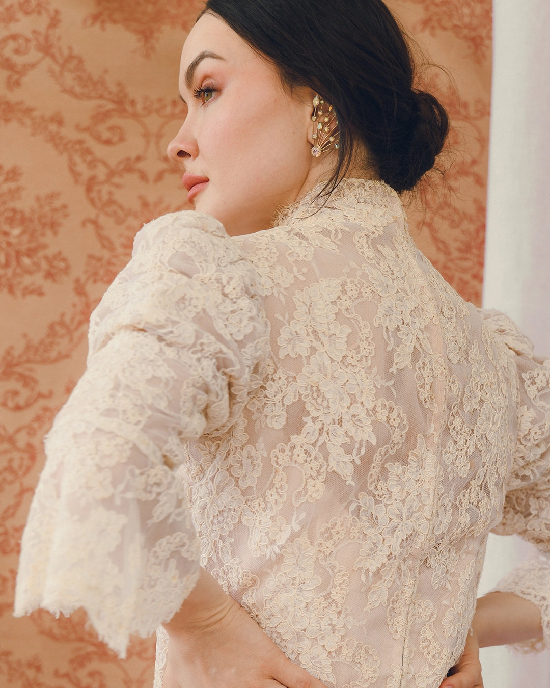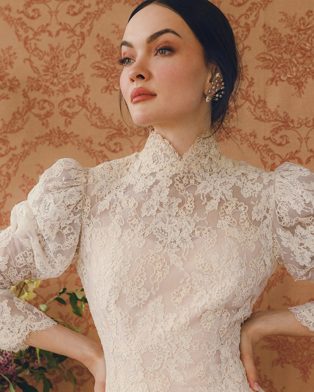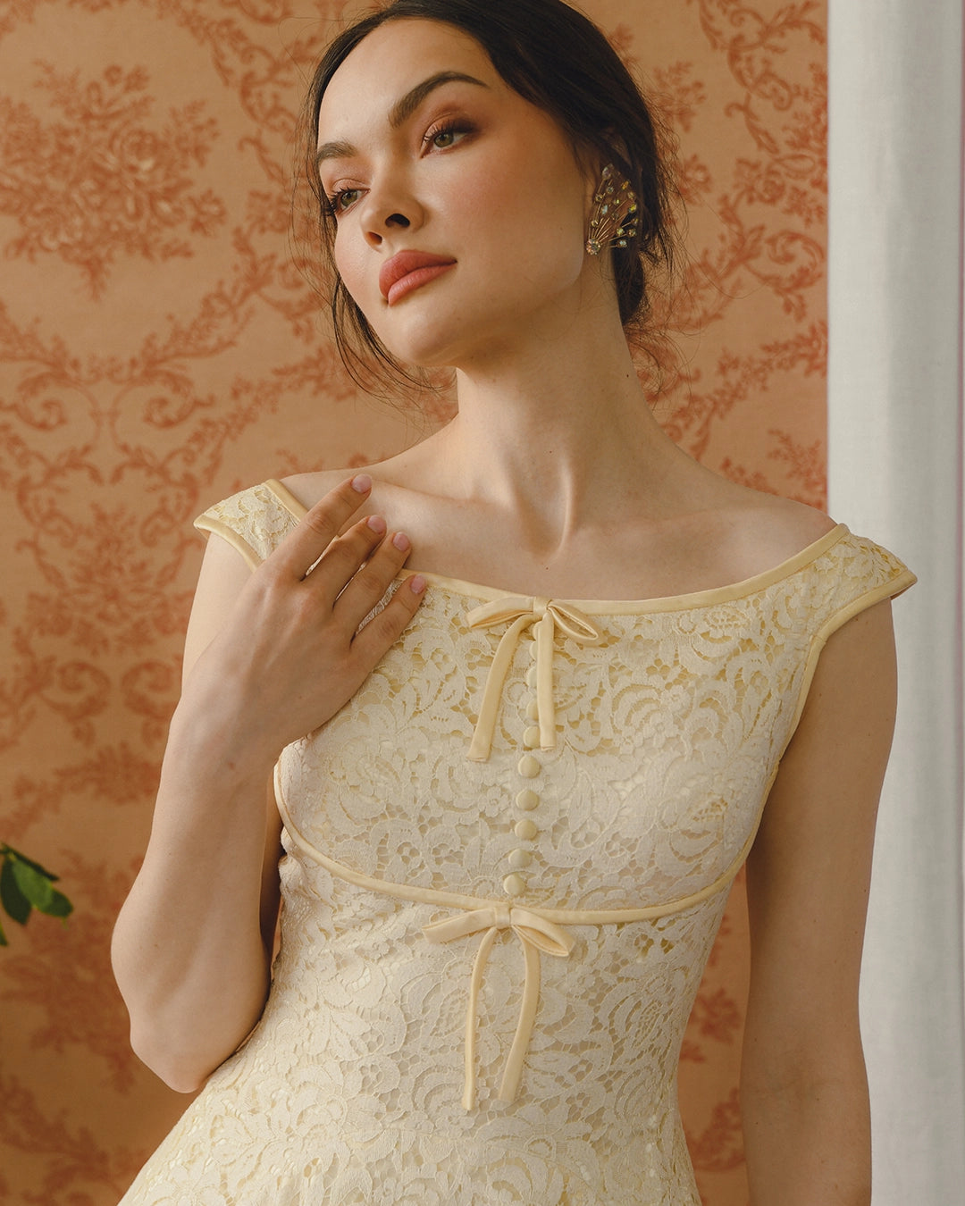 The Vintage 1950s Bateau Neckline Cream Lace Fit and Flare Dress and Designer Vintage Lace Bodice Drop-Waist Party Dress pictured are also available.