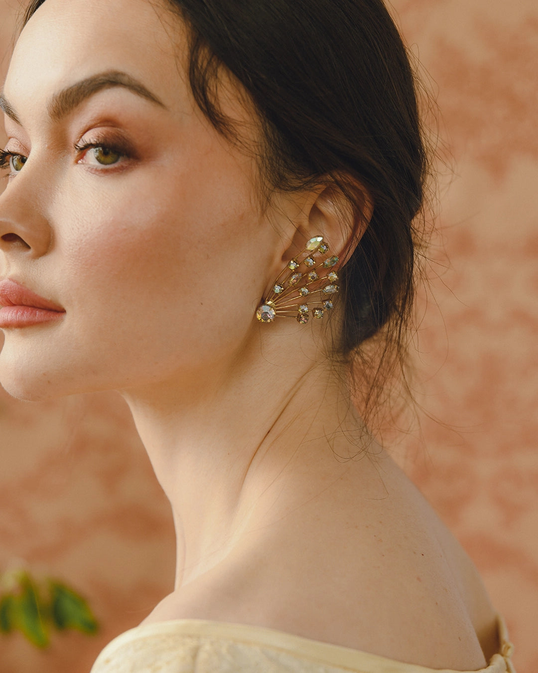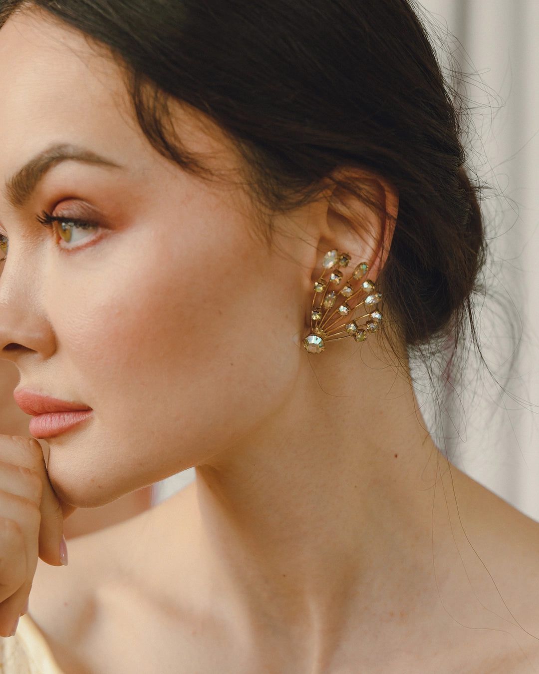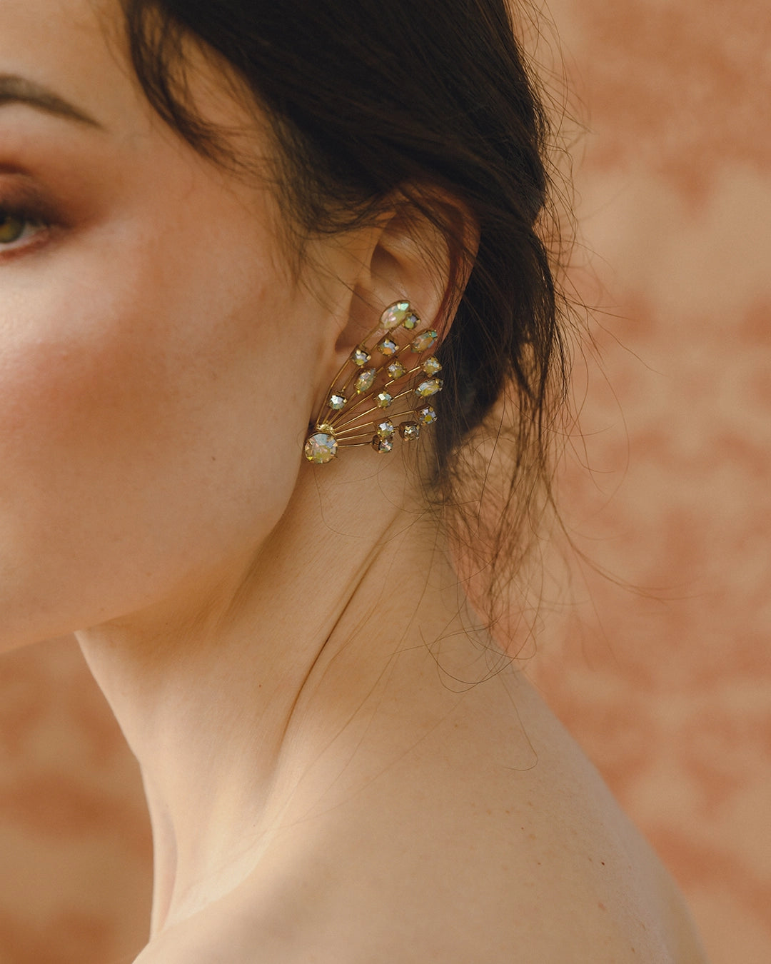 These rare aurora borealis ear climber earrings are like a shooting star of sparkle, making a statement while climbing up the ear vertically. The gold-toned metal details make these unusual, standing out amongst other 1950s diamanté jewelry. They were made by Weiss in the late 1950s; Weiss is known for their high quality costume jewelry from this era, crafted with handmade construction techniques which today are reserved for fine jewelry— making this piece highly collectible. They are hallmarked WEISS and finished with a clip-on lever clasp. They are extremely lightweight due to their intentional construction; Vintage clip-on earrings are so much more comfortable and secure to wear compared to their modern counterparts, largely due to the top quality and strategic design that went into their hand-made construction. They measure 49 mm in length total x 28 mm at widest point.