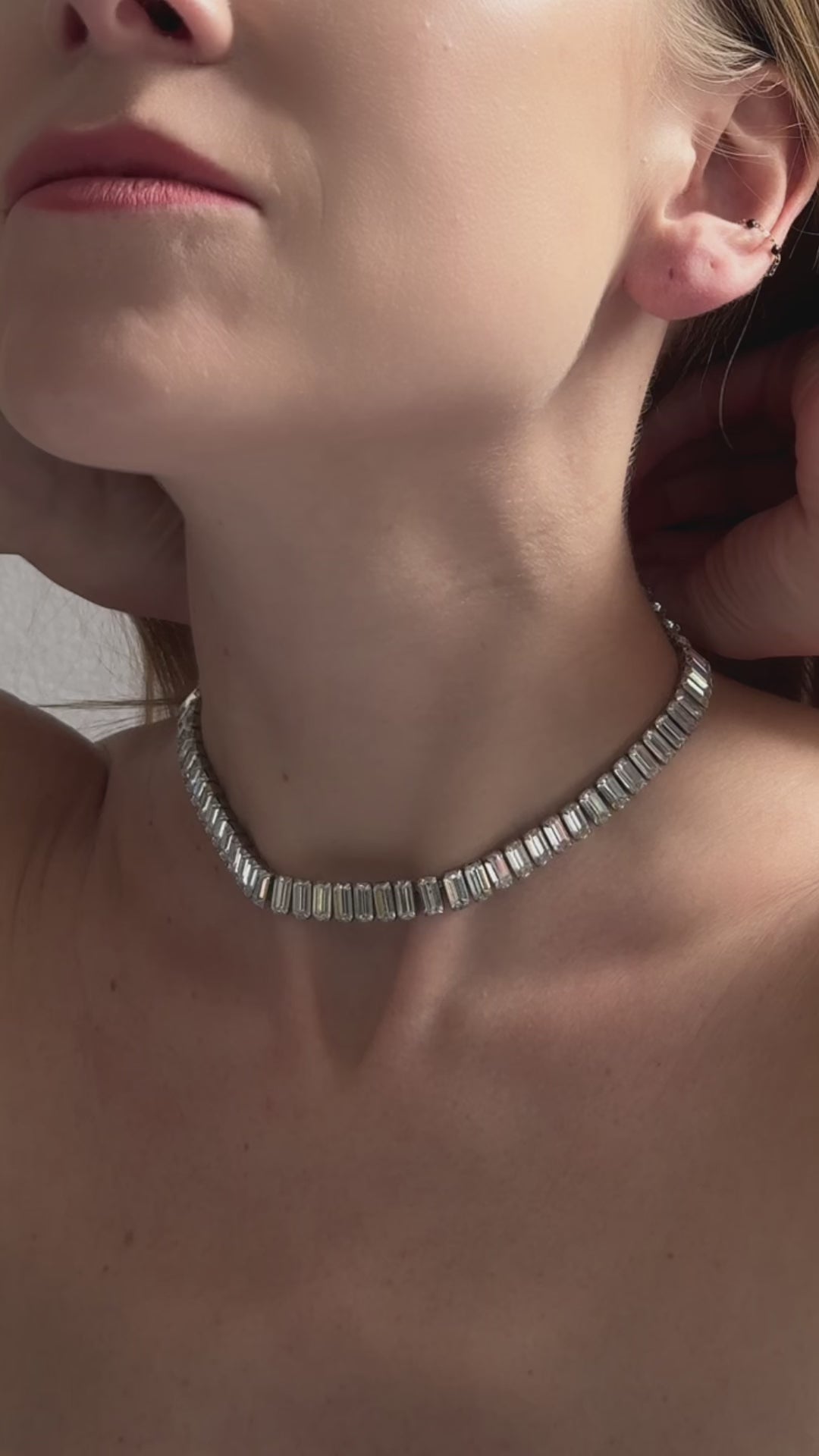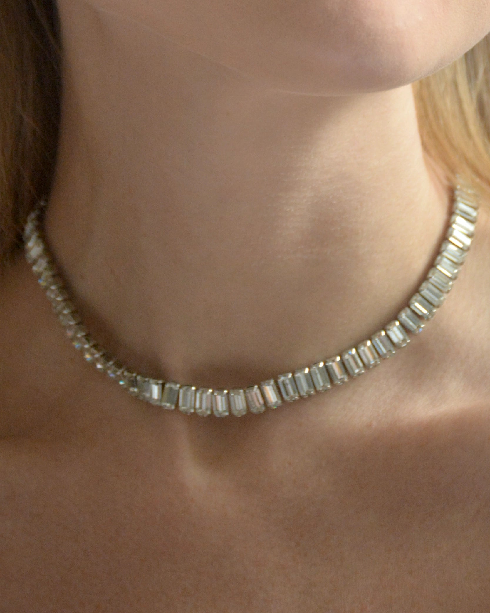 Made in the 1950s by Weiss, this baguette-cut crystal choker is a serious show-stopper. Weiss is known for their high quality costume jewelry from this era, crafted with handmade construction techniques which today are reserved for fine jewelry— making this piece highly collectible. Its façade features baguette-cut stones, which are vertically set, allowing for more stones to fit in a given space, which results in an impressive blinding sparkle. The chain of stones is articulated to move well with the neck and body without feeling stiff. It closes with a fish hook clasp, making the length completely adjustable; there is a maximum length of 15.5" but it can go as short as you want it. Hallmarked Weiss