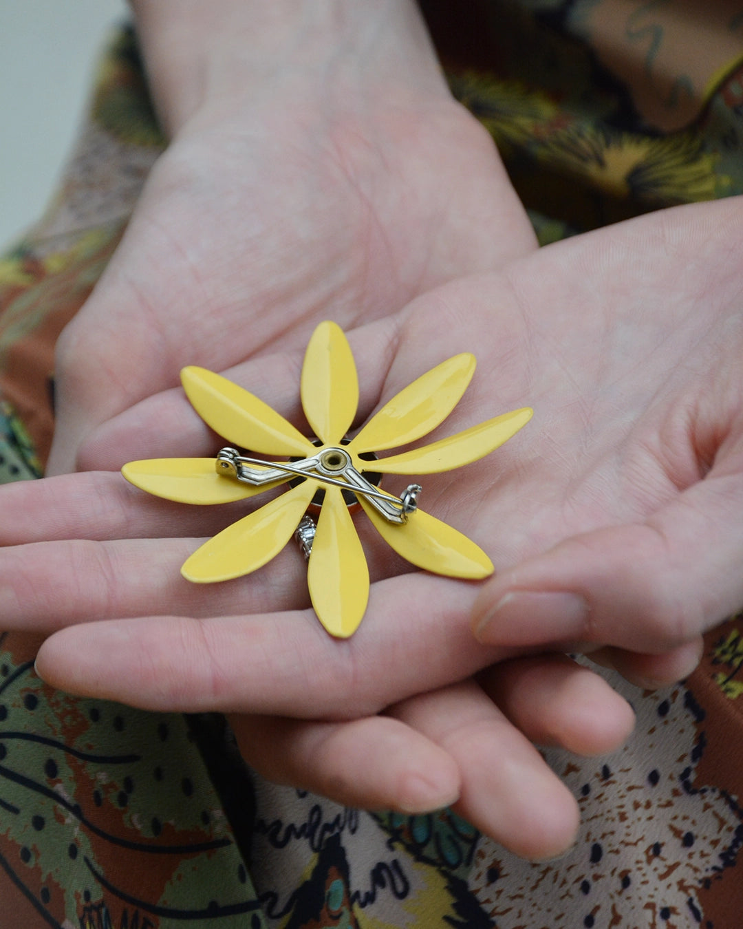 This vintage 1960s flower brooch is a hand-enameled yellow daisy, creating a punchy pop of color. Miu Miu and Prada have recreated this exact type of 1960s colorful flower jewelry on the runway in recent seasons. It has a classic brooch back, and can be pinned anywhere— even on a bag, worn to clasp a scarf, or in the hair! Measures 66mm diameter.