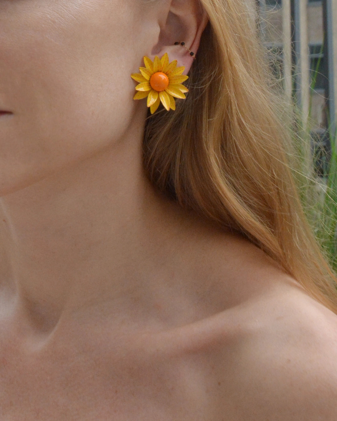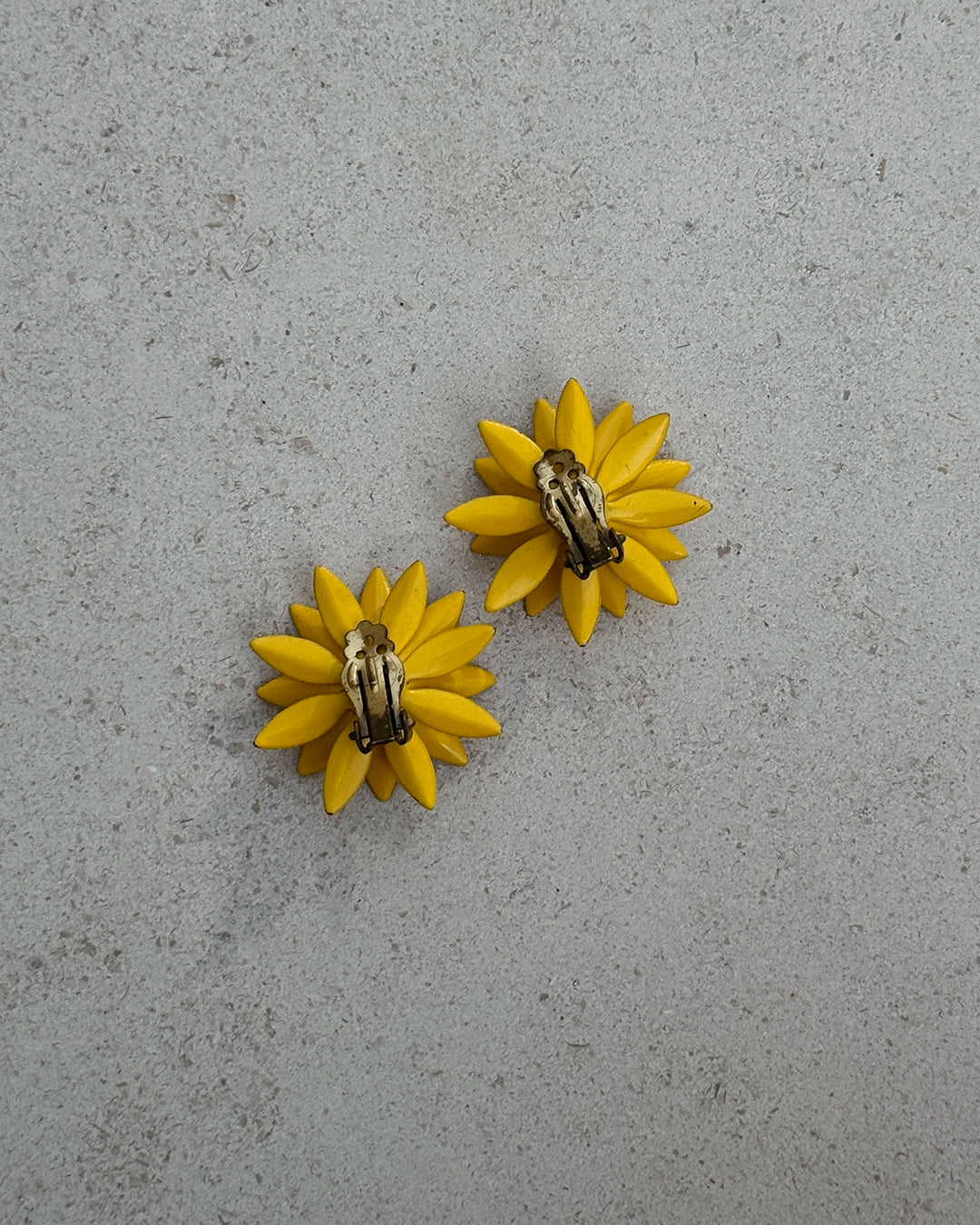 These vintage 1960s flower earrings are hand-enameled yellow daisies, creating a punchy pop of color. Miu Miu and Prada have featured copies of these 1960s colored flower earrings on the runway in recent seasons. They are extremely lightweight and comfortable, finished with a clip-on lever back. Measures 35mm diameter.