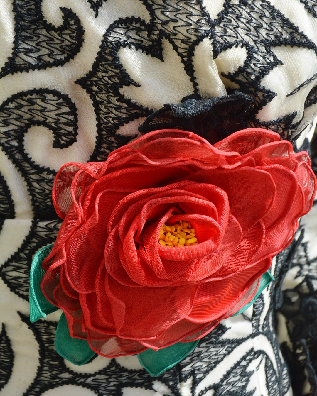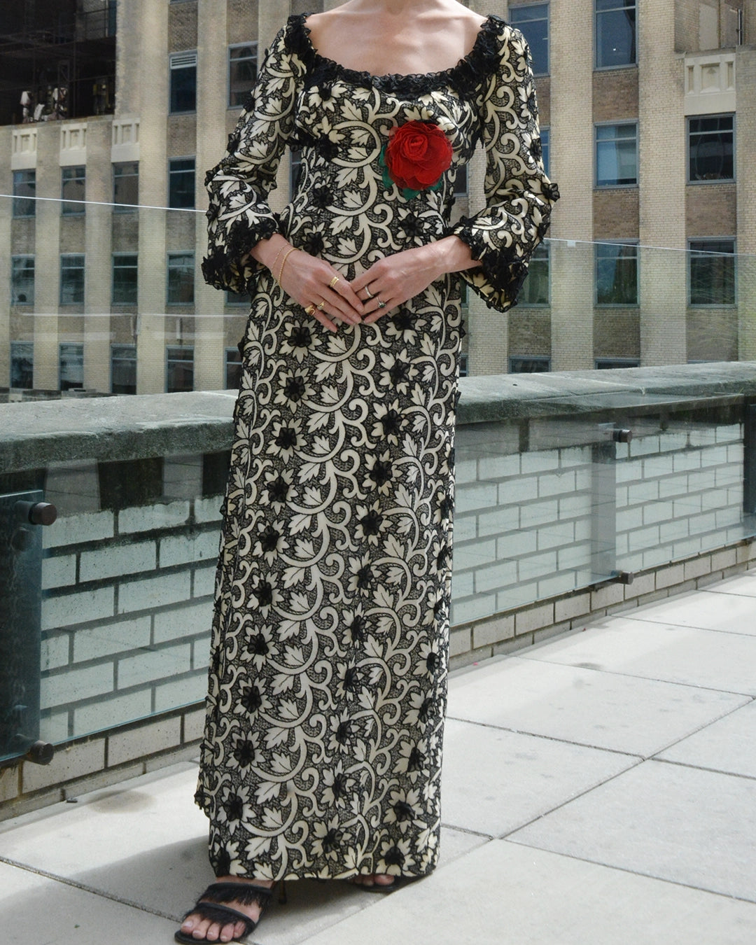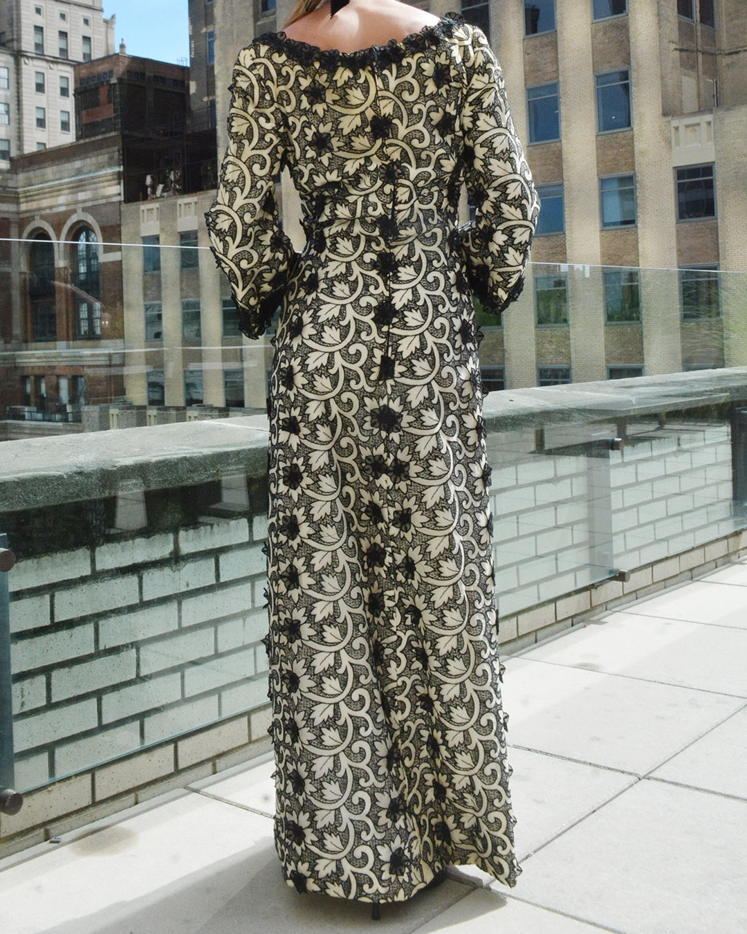 This absolutely divine, one-of-a-kind vintage 1960s gown is crafted of trompe-l'œil silk organza that has been embroidered all over to look like lace. The effect is just incredible— it almost looks like a white lace overlay, when in reality, and the embroidery is negative space. It was custom-made in the 1960s for a socialite of European nobility, who was prominent in both New York and European circles, and had an important collection of fashion and jewelry, including this dress! Scattered across the embroidered organza are black organza flower details throughout, with denser clusters at the neckline and cuffs of the 3/4 bell sleeves. At the bodice is a single larger sculptural red floral detail, with three-dimensional yellow stamen details at the center. It is fitted through the bodice, with gathering at the chest, and a waistband at the empire waist, remaining fitted through the natural waist with shaping seams, giving way to an A-line skirt. This dress is bra-friendly; it has "bra-holder" straps at the shoulder, which snap to hold a bra strap in place, so that it's not slipping out/becoming visible at the neckline. This is just one of many thoughtful construction elements that make this dress so luxurious and special— there are also protectors at the underarm's interior to prevent discoloration from perspiration. It closes with a zipper down the back.