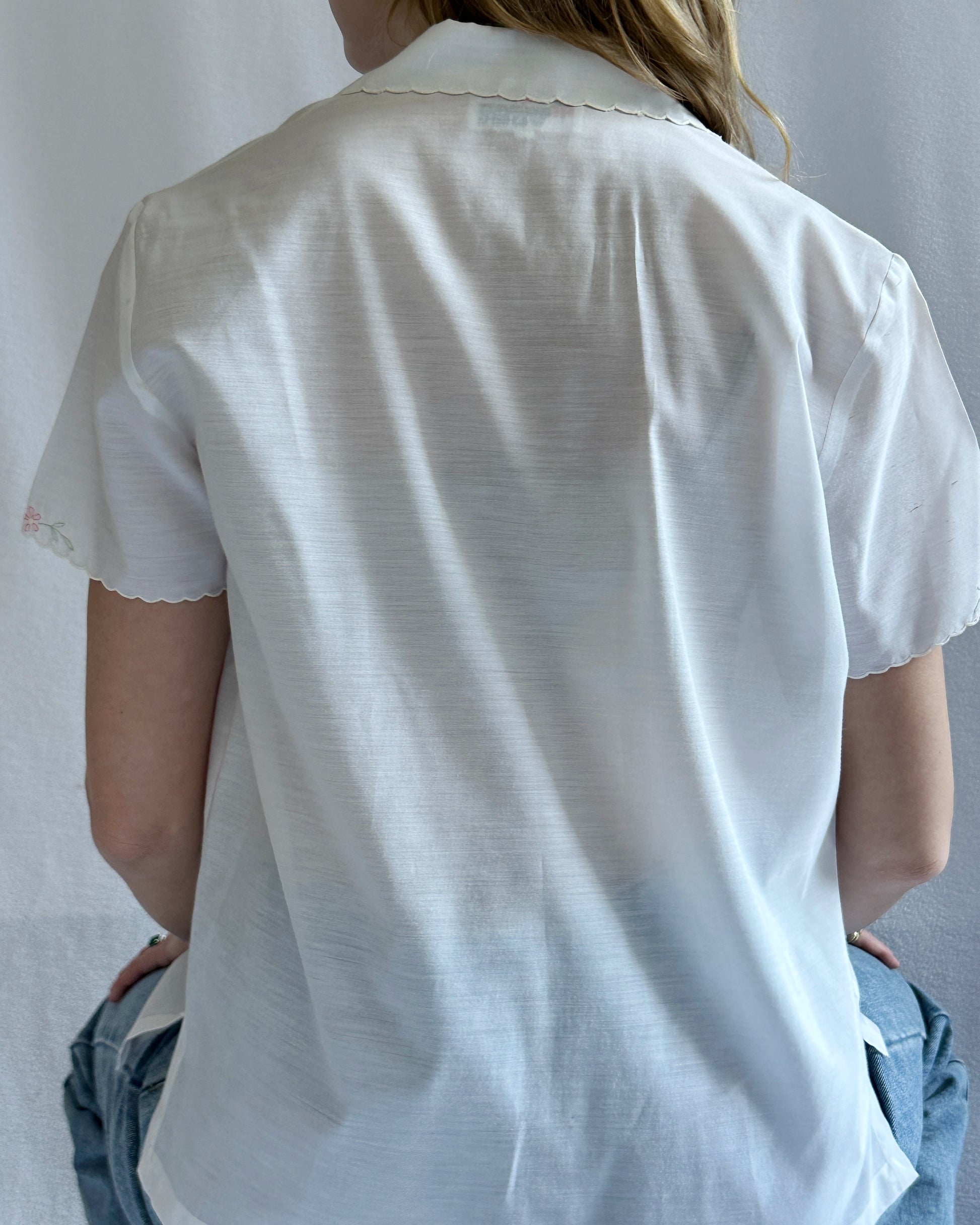 This sweet 1960s blouse features hand-embroidered florals— it's so rare to find these quality details in modern pieces, and impossible to find at this pricepoint. The cotton-blend fabric has a really starched crisp feel. Note the scalloped edges at the sleeves and collar. It features buttons down the front and little vents at either side seam. It would be cute worn tucked into something high-waisted, tied at the waist, or even worn open. The Vintage Jacky de G Earclips pictured are also available.