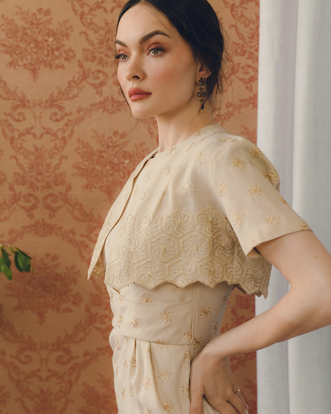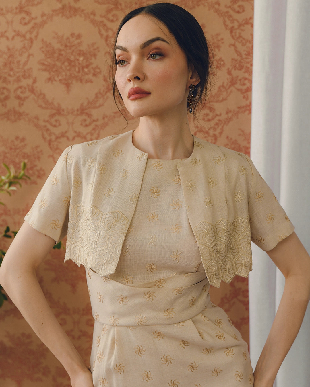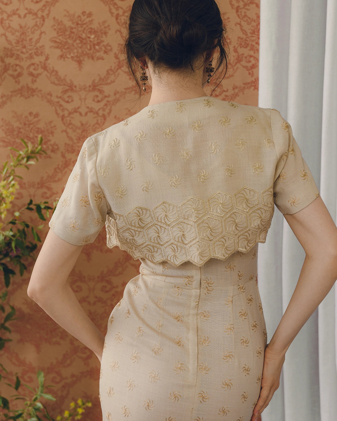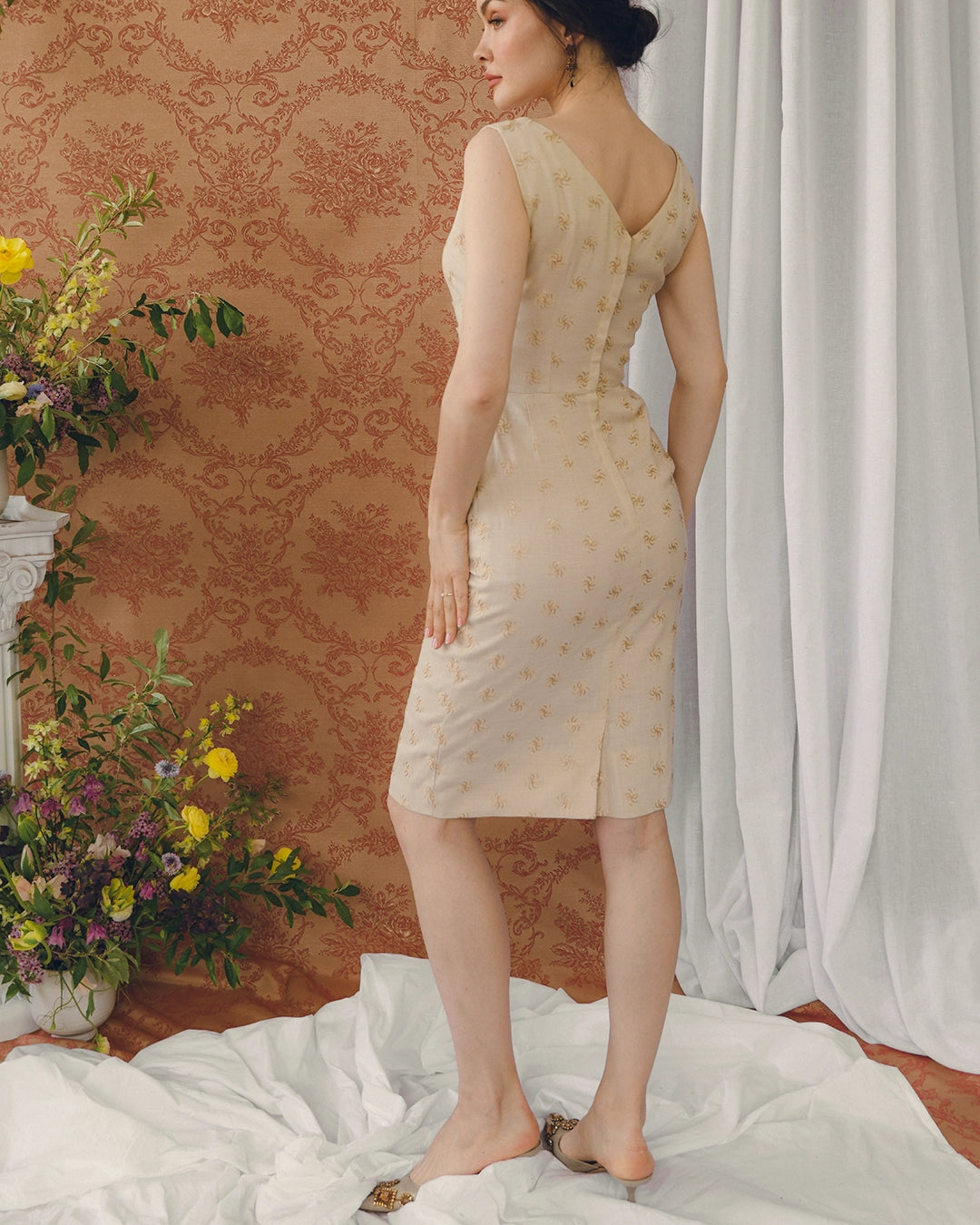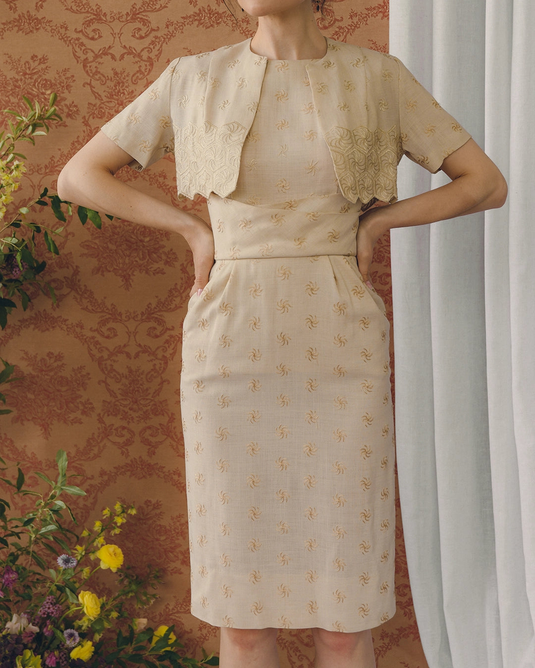 This one-of-a-kind vintage 1960s hand-embroidered wiggle dress with matching bolero is such a sophisticated and chic look— it absolutely looks like something Jackie Kennedy would have worn in the early 1960s. It appears to have been custom made, and the craftsmanship is so evident. The fit of the dress is just phenomenal, with a bateau neckline, and a wrap effect on the bodice under the bust, artfully pleated and draped to create an ultra-flattering hourglass shape. It's fitted through the bodice and skirt. Very thoughtfully constructed, there is a kick pleat at the back for ease of movement. It is hand embroidered all over with a tonal pinwheel motif. The bolero has a fitted shape, with the embroidery motif extending into diamond-shapes at the graphic hemline. There is a single snap closure at the neck. I love that the bolero feels like an extension of the dress when it's worn, but the dress is also flawless on its own— it's really two distinct looks in one. The dress has a piece of lining at the front skirt to prevent sheerness, and closes with a hidden zip + hook closure.