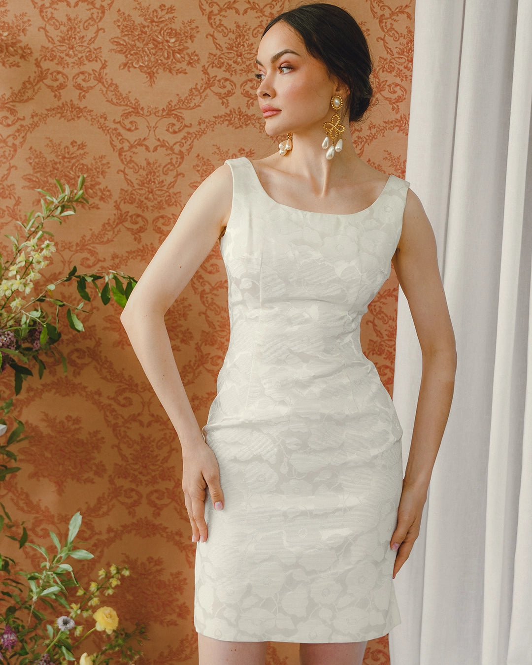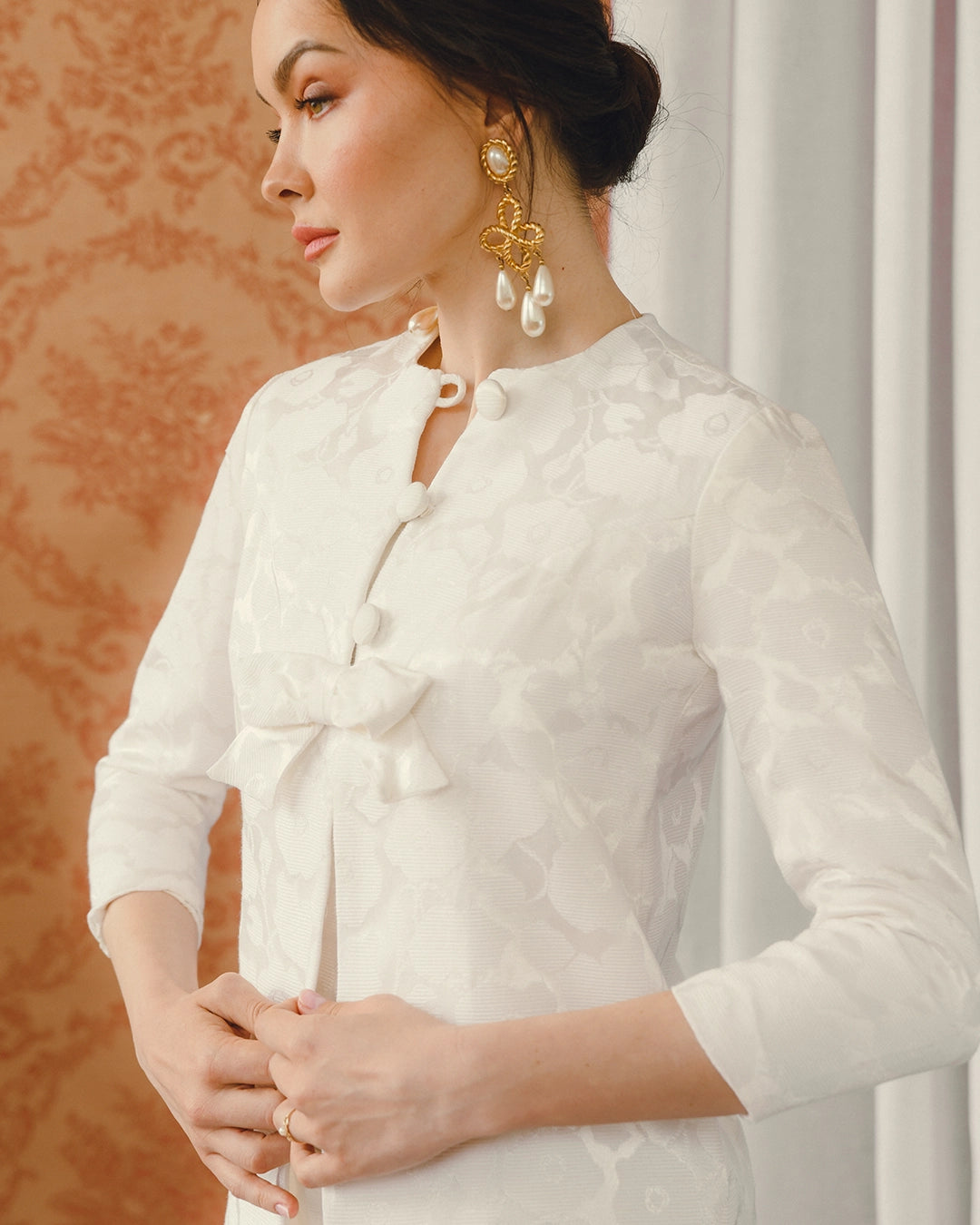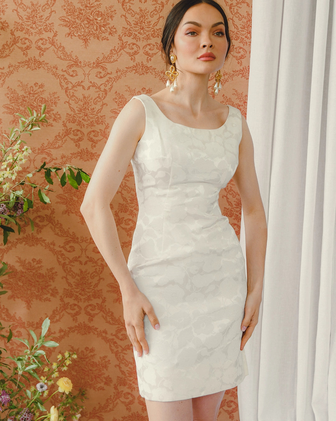 This vintage 1960s ivory brocade wiggle dress with matching coatdress is so sophisticated and utterly chic– you can picture Jackie Kennedy wearing this set. The silhouette is classic early 1960s, the dress having a fitted, true wiggle dress shape, and the coat having a slightly more boxy look. It truly is two distinct looks, as the dress can be worn solo as well. It's crafted from the most gorgeous cream brocade, and I cannot say how beautiful this fabric is— it has high-shine satin elements, offset by a matte corded texture in other parts, for a multidimensional, expensive look. The coat buttons at the top, then flares open to a slight A-line shape— to show off what's underneath. The bow overlay adds to the ladylike look. The dress fastens with a zipper and hook.