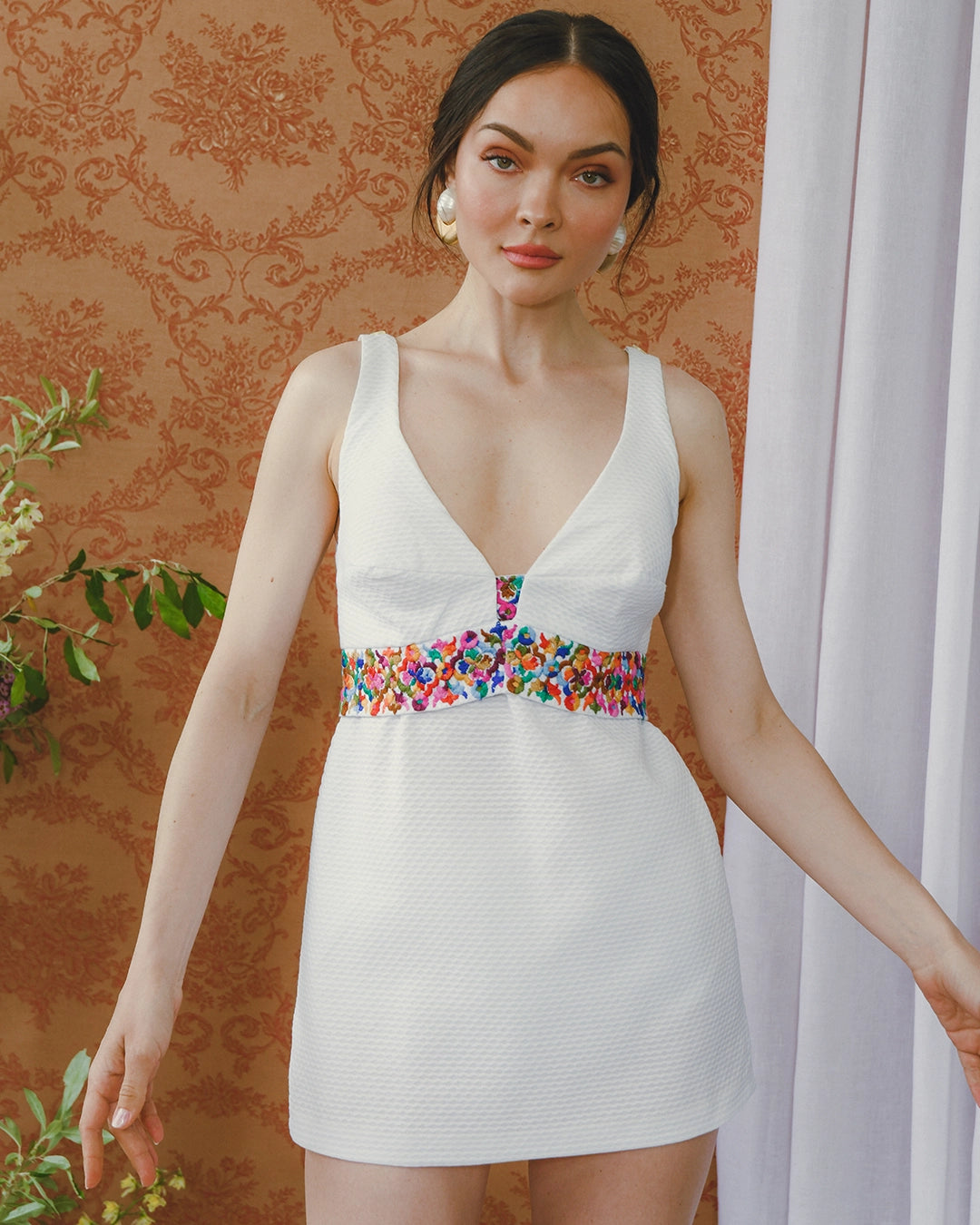 This vintage 1960s minidress is so adorable, it's almost unreal. Originally made as a a sort of bathing/leisure suit, it comes with matching bloomers that make the micro-mini length more wearable. I also adore this piece layered over pants or a skirt as a tunic (rather than a dress). (Note that the model is 5'10") The white pique cotton fabric is contrasted by the gorgeous floral embroidery at the belt— it sits under the bust for an empire waist shape. Cups are built into the chest, with hidden elastic under the bust at the empire waist, for a flattering yet comfortable fit. Buttons at top of shoulder straps make them adjustable in length. The bloomer pull on, with a hidden elastic high waist, very bloomer-like voluminous shape, and elastic stretch at leg opening. The bloomers are fully lined, and the dress is lined above the waist.
