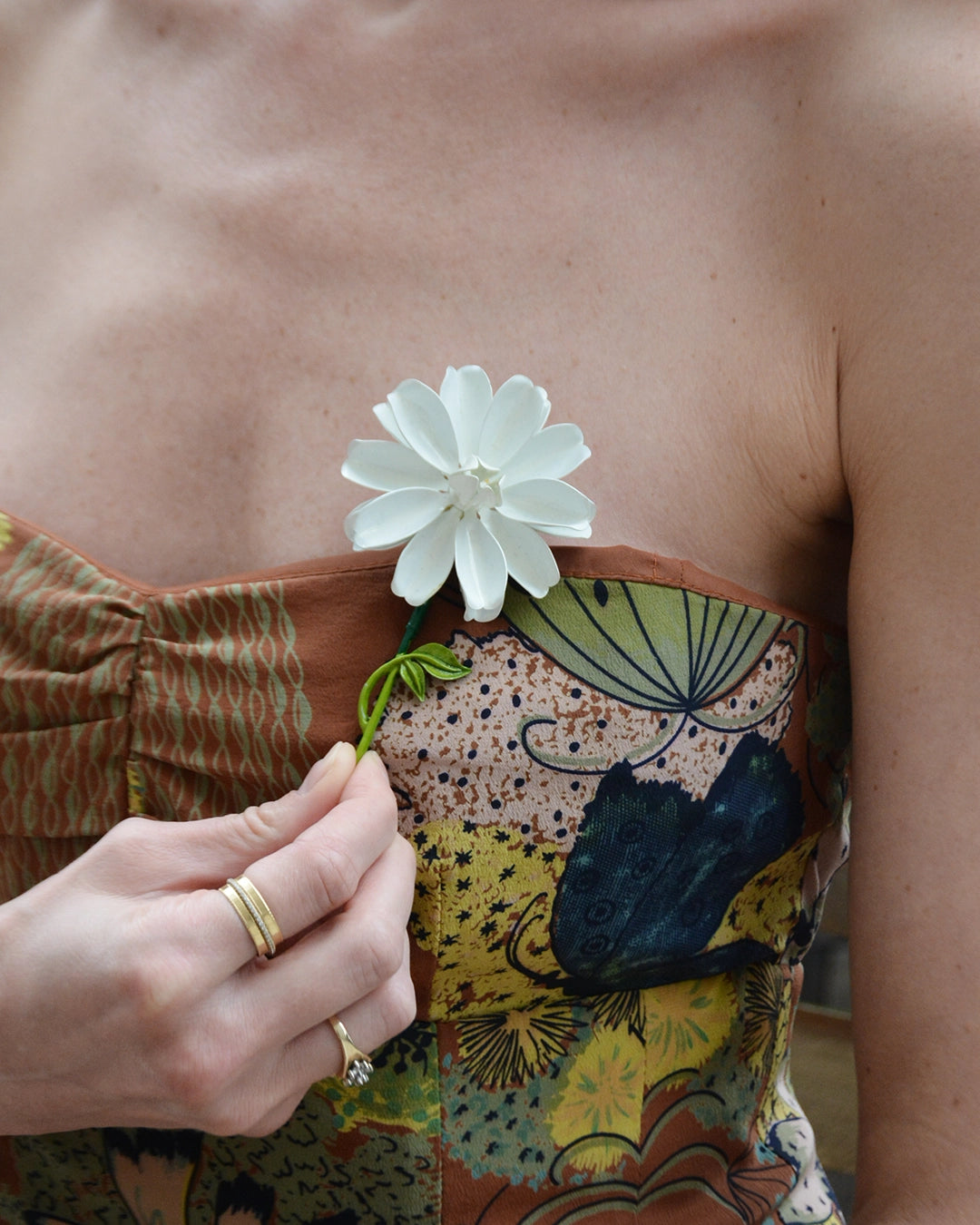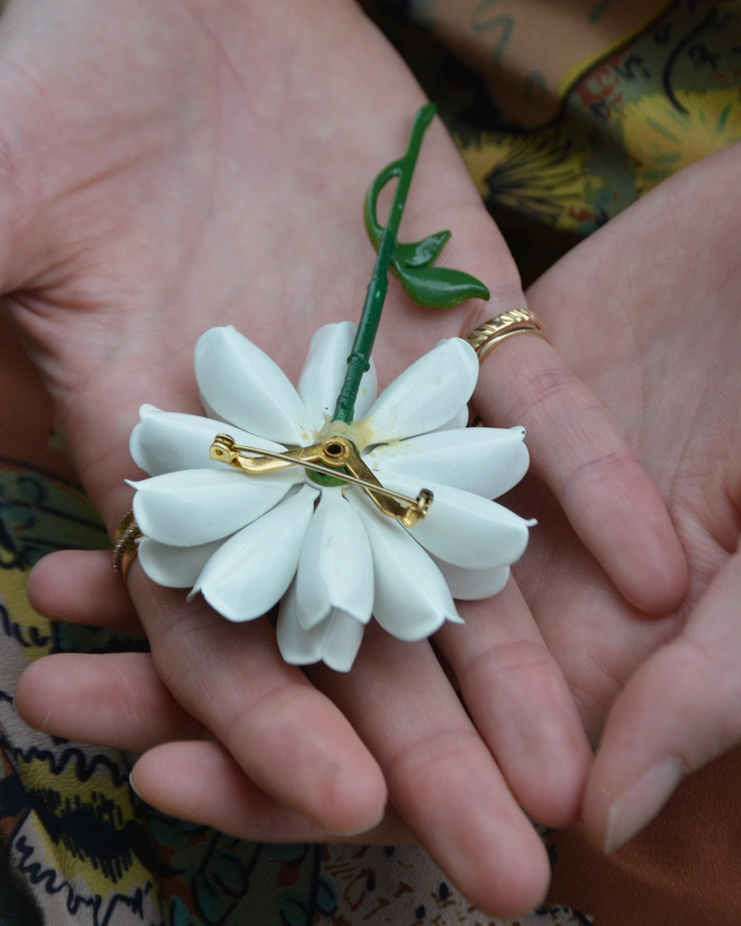 This vintage 1960s flower brooch is a hand-enameled white daisy, complete with sculptural details. Miu Miu and Prada have recreated this exact type of 1960s colorful flower jewelry on the runway in recent seasons. It has a classic brooch back, and can be pinned anywhere— even on a bag, worn to clasp a scarf, or in the hair! Measures 107 mm in total length x about 60 mm at widest point.