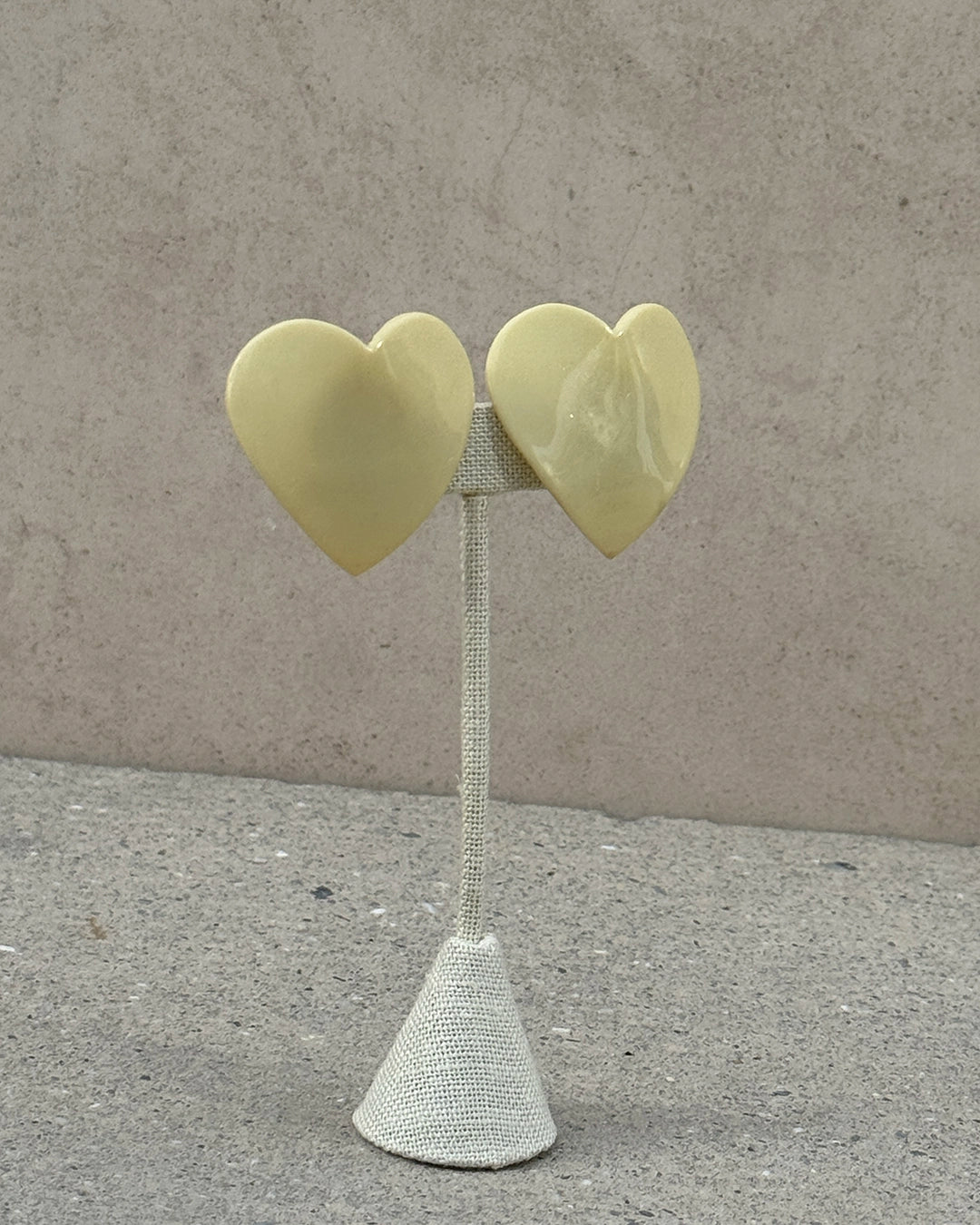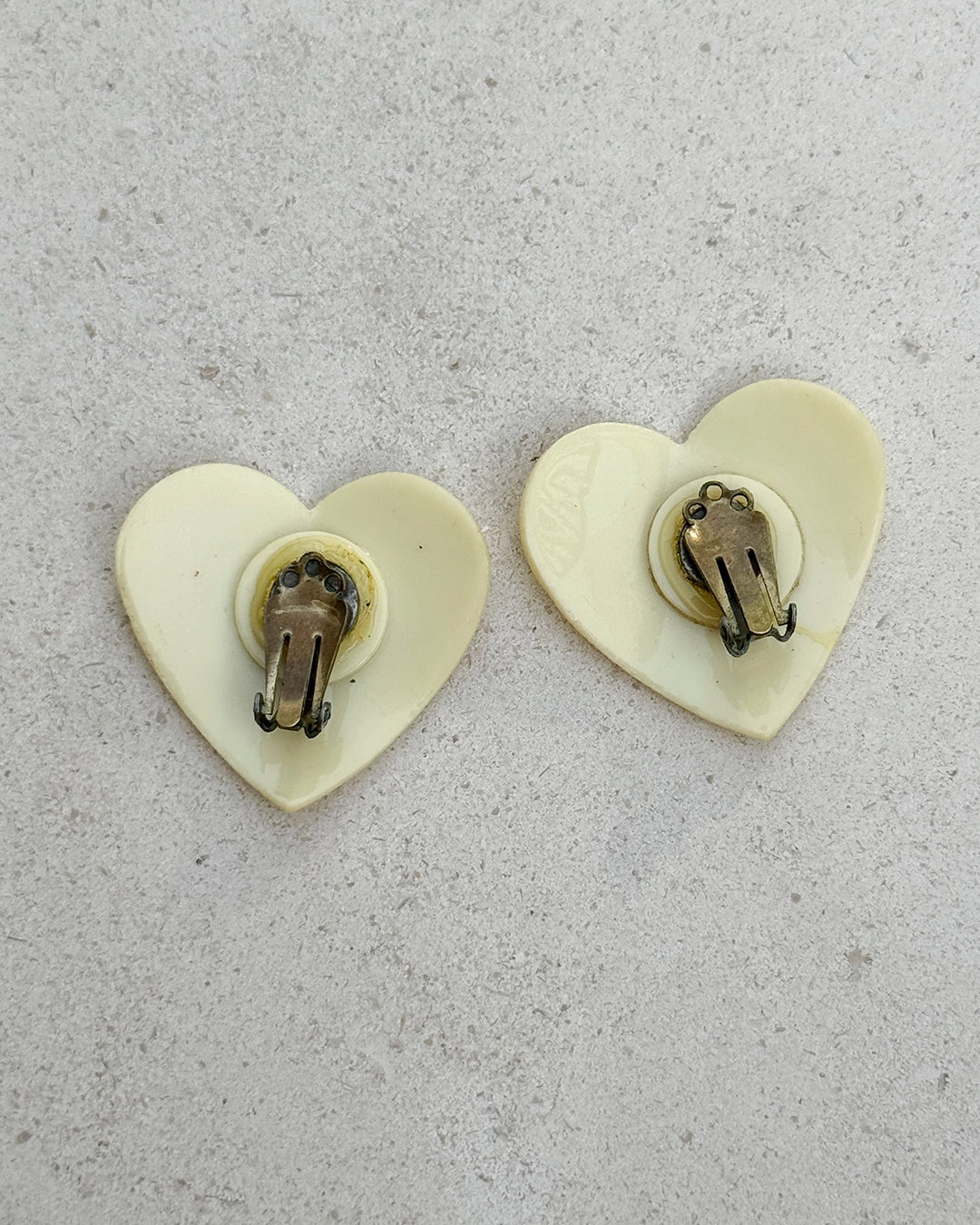 These vintage 1960s oversized heart earrings features large acrylic boned-colored hearts. I love the way that their façade curves to frame the face. They are extremely lightweight on the ears and comfortable to wear, with clip-on lever backs. Measures about 40 mm long x 42 mm at widest point.