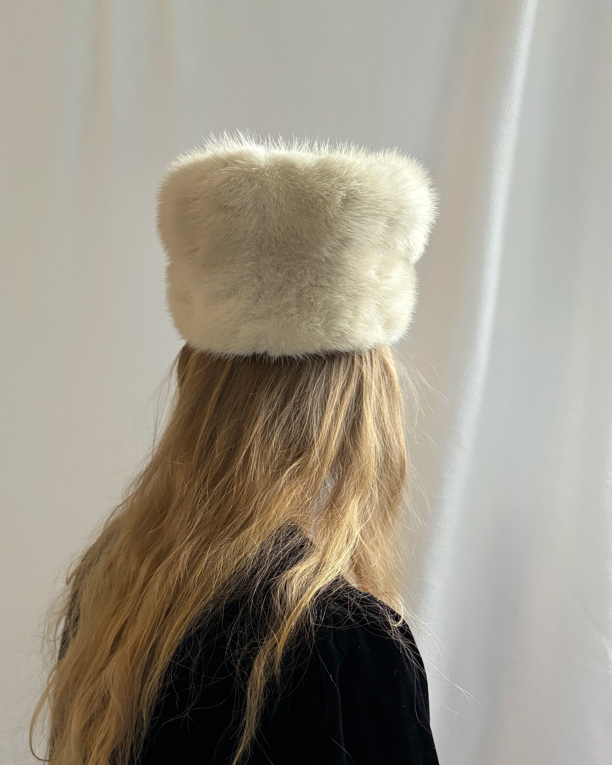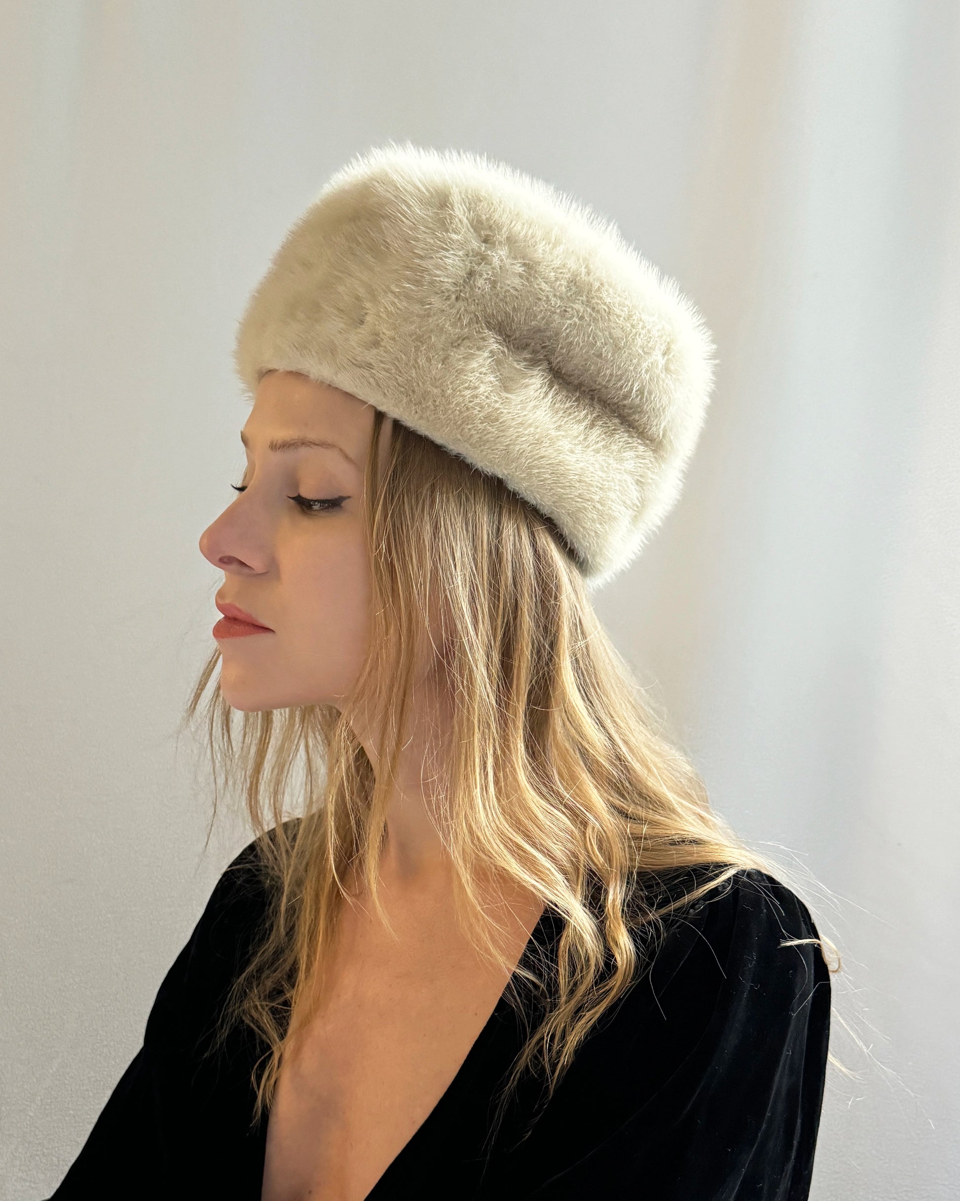 This vintage 1960s mink cossack hat is the most gorgeous golden pearl color that looks good on everyone. The fur has some natural variations to the color which add depth to its richness. It is so soft and so warm, yet because of the natural fibers, it's never too warm where you're overheated, itchy, or uncomfortable. I love this for an après-ski look! I also love the height and classic cossack shape, which are super face-flattering. It is lined with a secure band on the interior ensuring it stays in place. Made in the USA and measures 21.5" circumference at inner grosgrain band