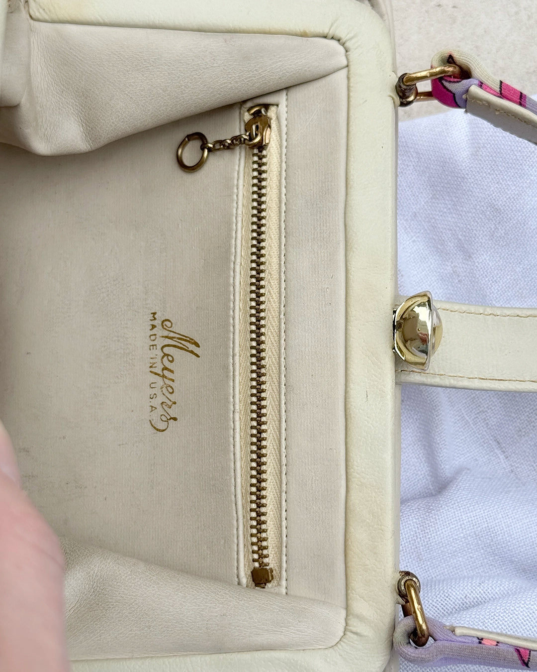This vintage 1960s handbag has the most fun print— psychedelic-meets-tribal, which feels very Pucci, and a palette that's so Palm Beach! It has a central pocket with a kiss-lock closure, and compartments on either side, all of which is closed with a strap. The size and strap length are perfect for carrying in your hand. It is actually so functional and fits a lot, with a zip closure pocket in main compartment. Base measures about 8.25" long x 3.5" deep (more depth higher on the bag) and the bag is about 5.75" tall.