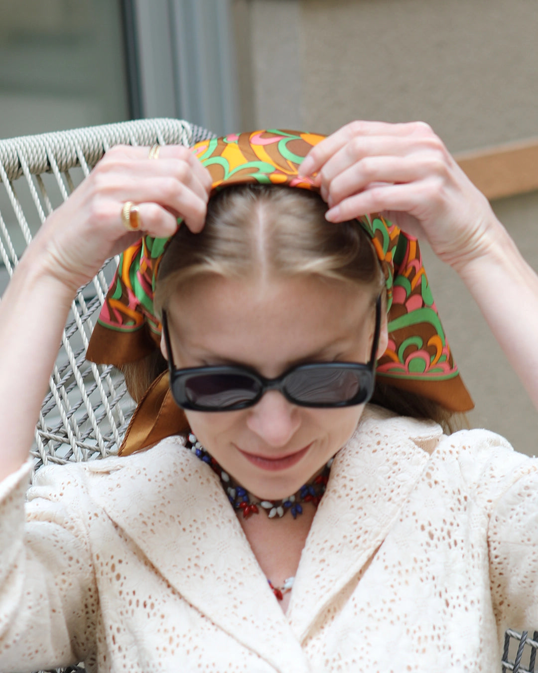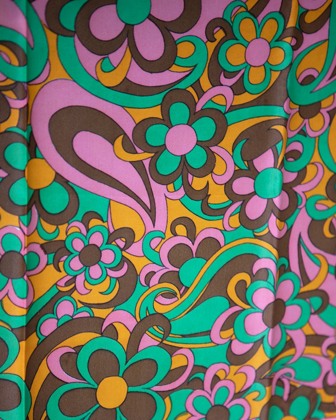 This vintage psychedelic Pucci-print scarf is so iconic and easily makes an entire look in an instant. It features a distinct 1960s print in a fun, warm-toned palette. It's the perfect size for wearable a number of ways, weather worn as a headscarf, around the neck, on a handbag, etc. Measures 27" x 26.25"; unlabeled. Fiber contents are not listed but feels like silk.