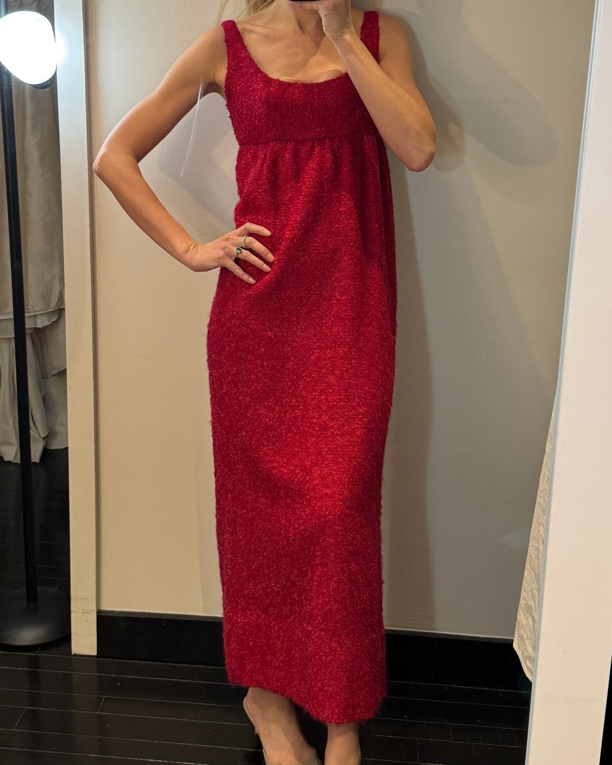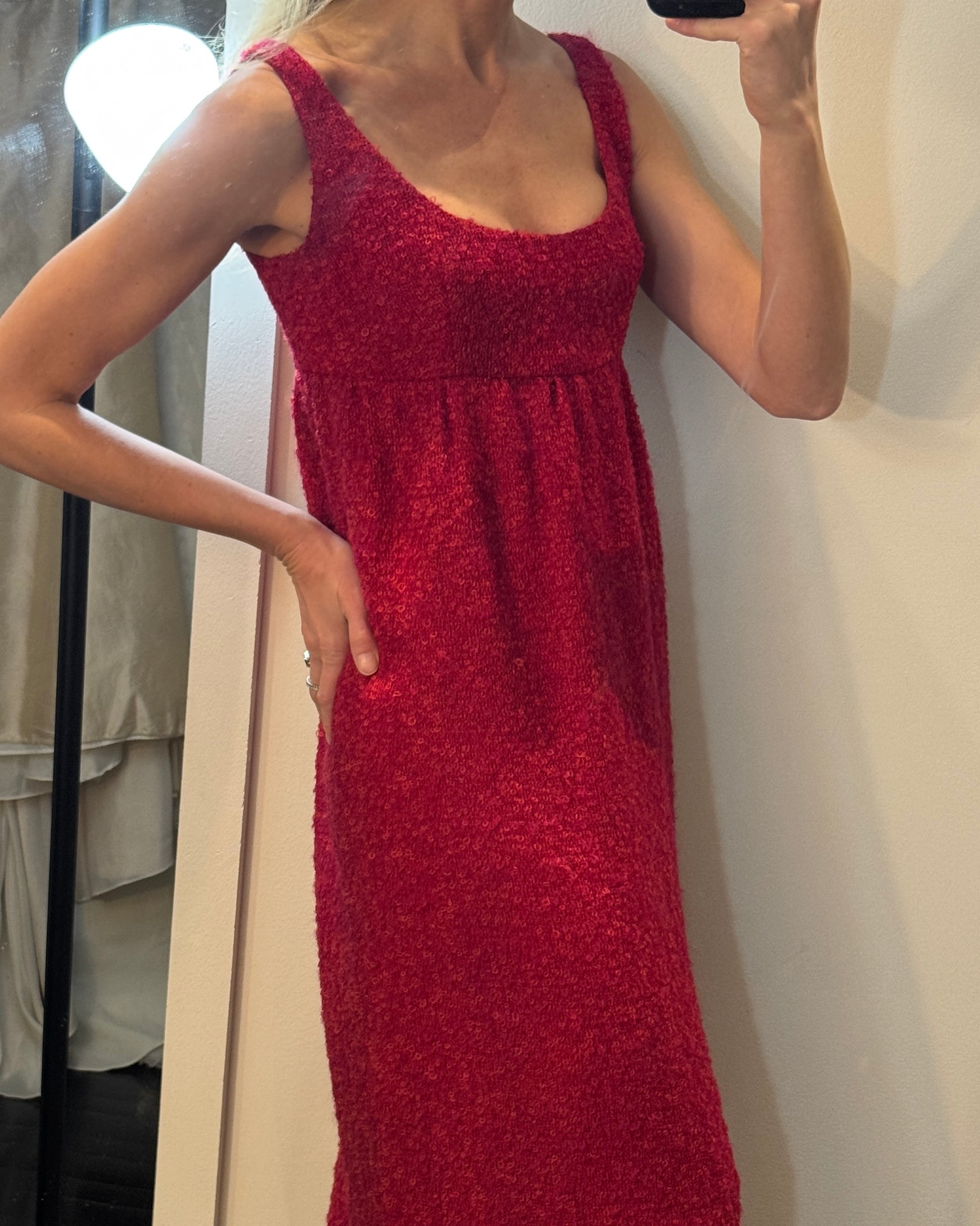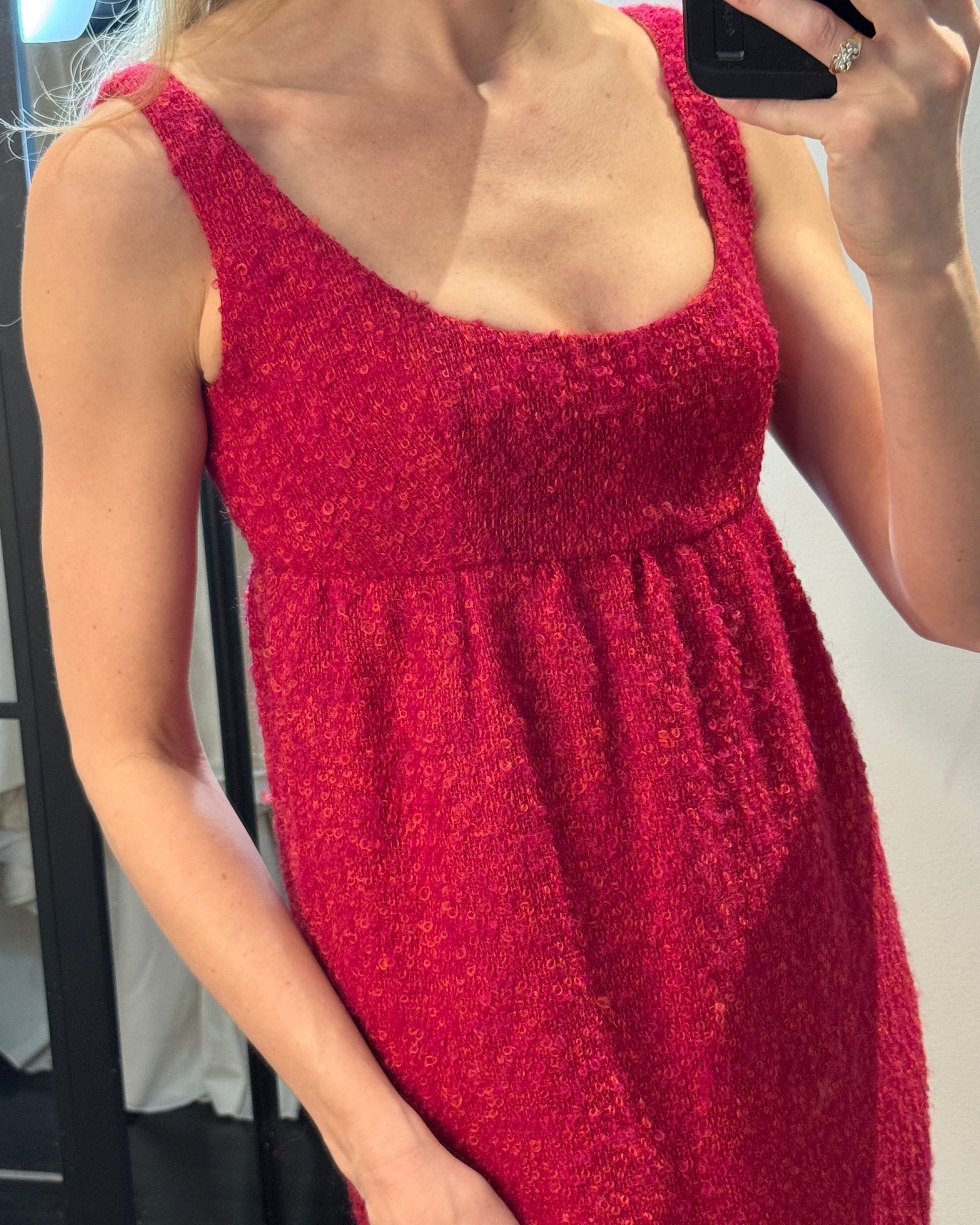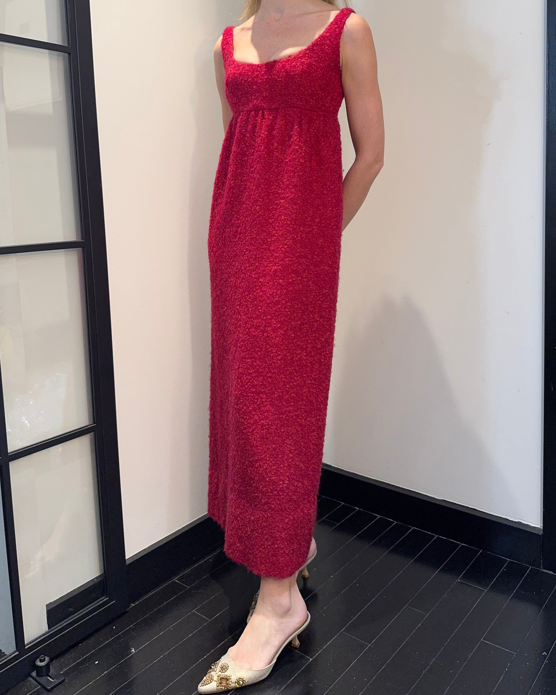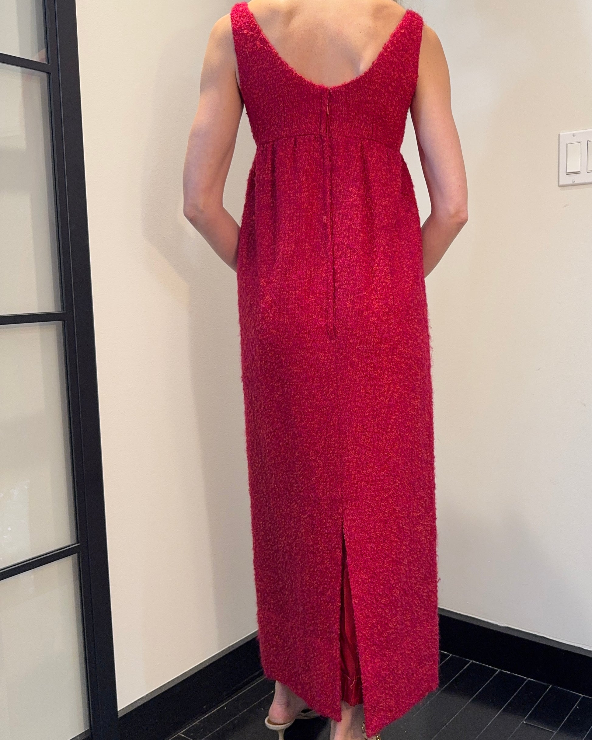 This vintage 1960s bouclé wool dress features an empire waist that feels very much borrowed from the Regency era— think Bridgerton. It has that super fitted empire waist, that’s tight through the chest, almost fitting like a balconette bra— so flattering! It’s straight through the skirt in a column shape, which cleanly balances the look. The entire piece is crafted of a raspberry-hue bouclé wool, and fully lined.