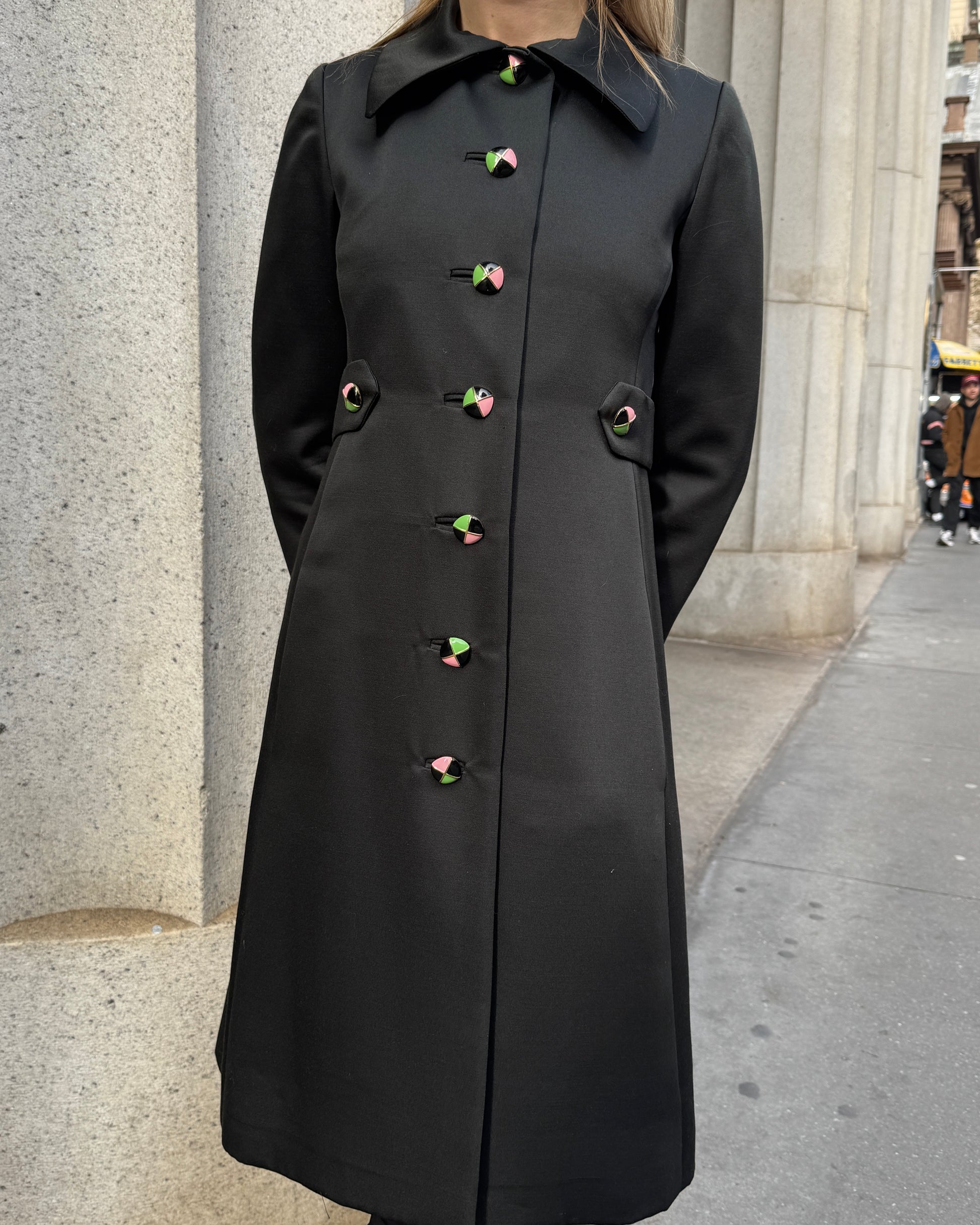 This one-of-a-kind custom-made vintage 1960s silk wool black coat features custom buttons and gorgeous contrasting silk lining, in the most special pink and green harlequin print. The tailoring and shape are incredible, with flattering shaping seams. It's full of hand-finished details. No fiber contents are listed, feels like silk/wool lined in silk or a silk blend.