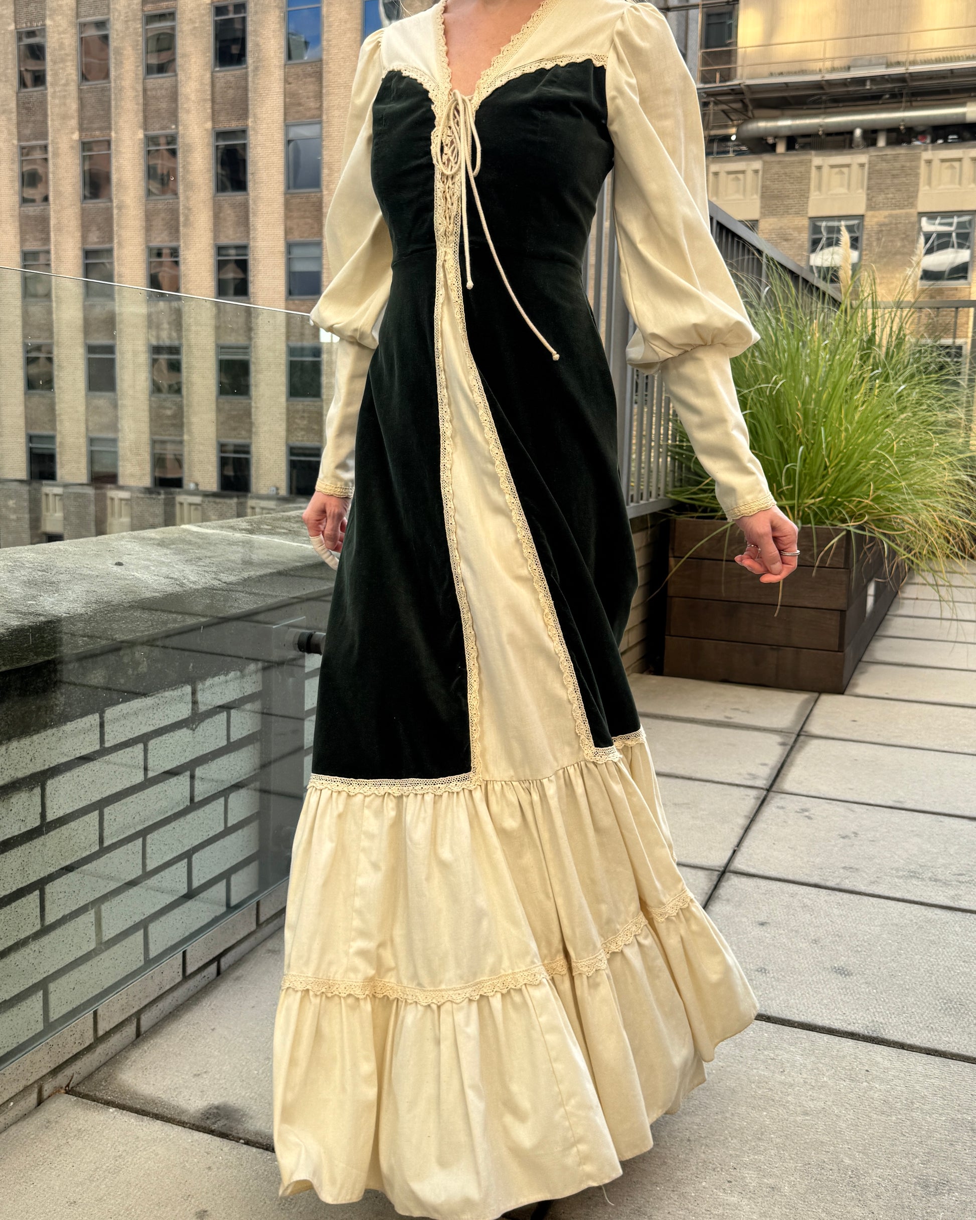 Vintage 1970s Gunne Sax Velvet-Inset Maxidress with Lace-Up Detail