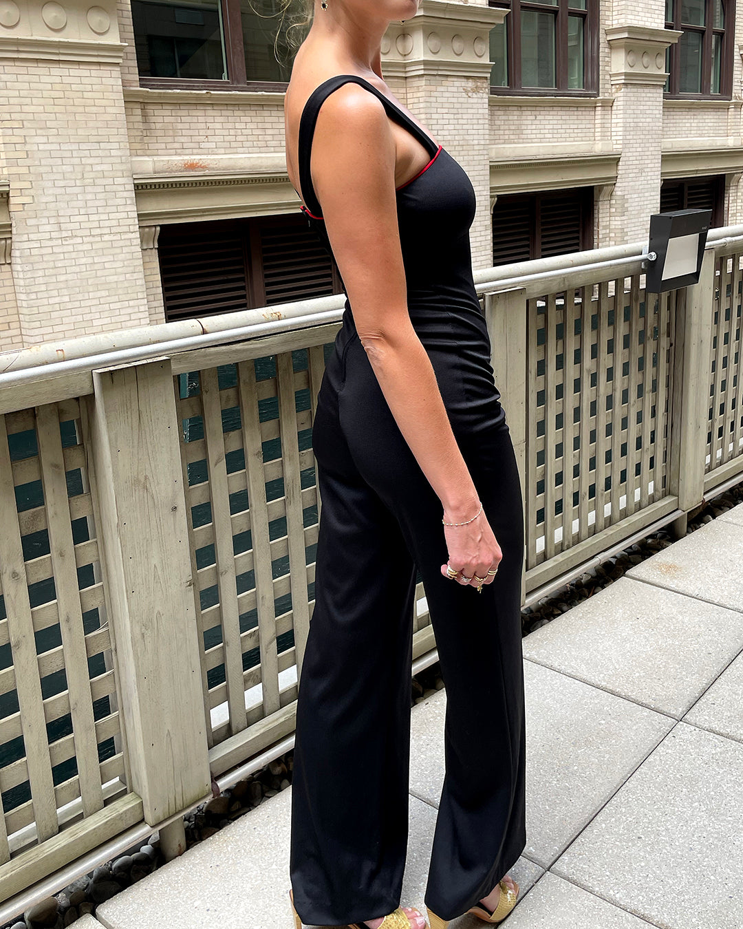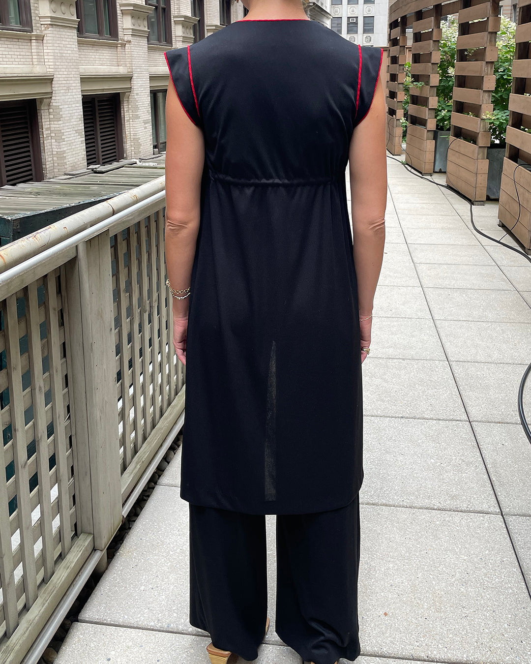 Look no further for the perfect vintage jumpsuit. The black stretch fabric hugs in all the right places, and I love the contrasting red piping. The set includes a matching sleeveless duster— this is a piece you will definitely mix elsewhere in your wardrobe.