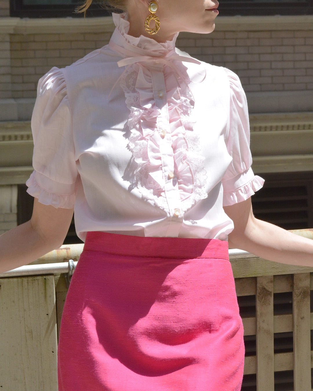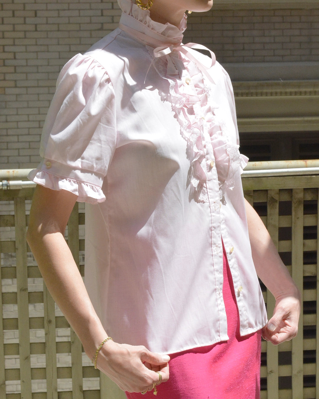 This adorable vintage ruffled blouse is a perfect marriage of Barbie core and "Corp-Core" —perfect for the office or a night out depending on how you style it. It features short puff sleeves, ruffles down the placket with lace details, and a ribbon tie at the high neck. It looks good tucked in, untucked, or even tied at the waist.
