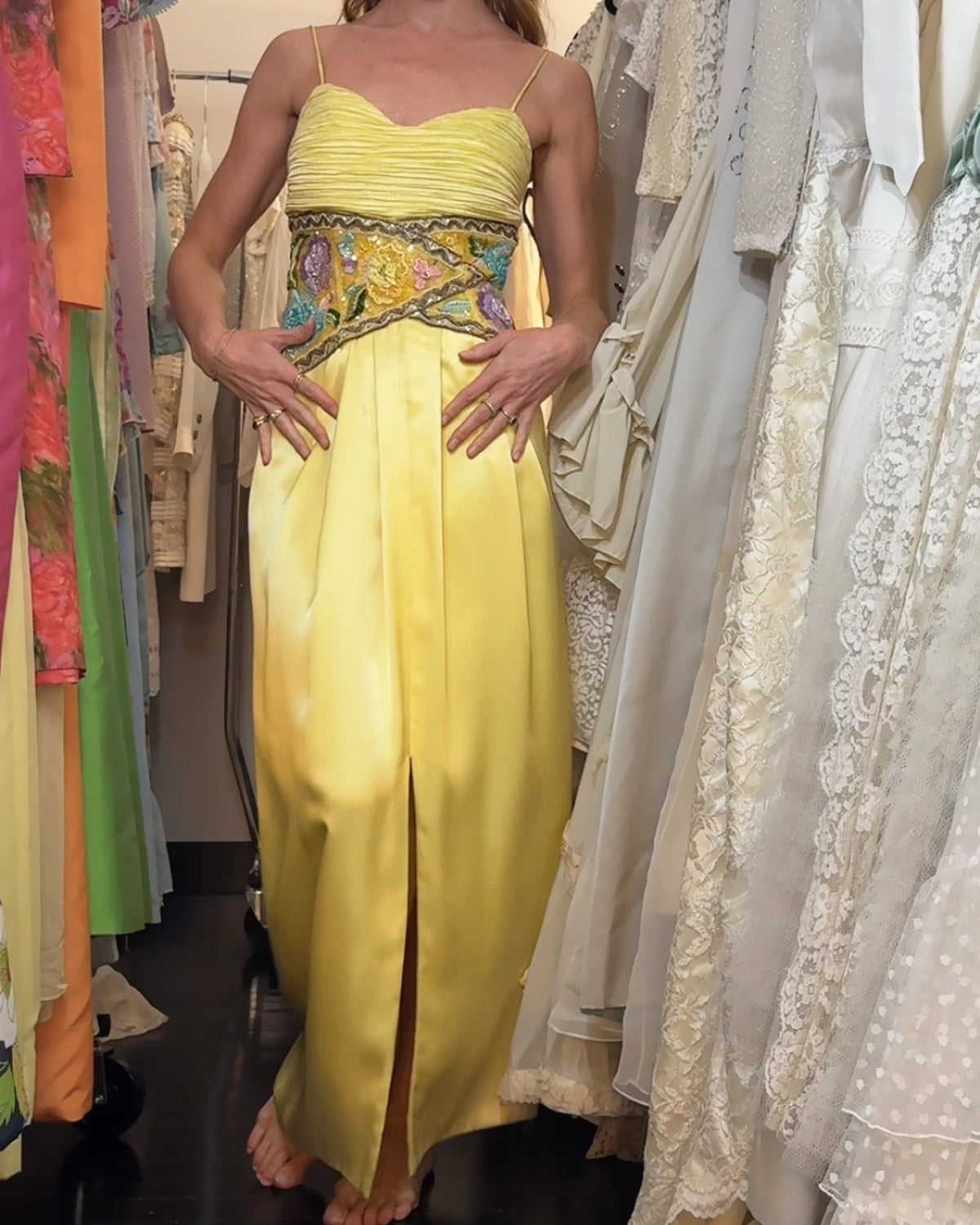 This vintage 1980s Mary McFadden gown features McFadden's signature Fortuny-style plissé on the bodice. Intricate beading forms an obi-belt shape at the waist, defining the waist to create a flattering hourglass effect. Additionally, the bodice is boned on the interior (beautifully constructed) to really hold you in. Pleating at the waist creates a great shape through the skirt; it's a true column shape but just ever so slightly cocoon, with a slit up the center front. The silk satin fabric has a self underlining, which keeps the shape flattering as it skims the body's curves.