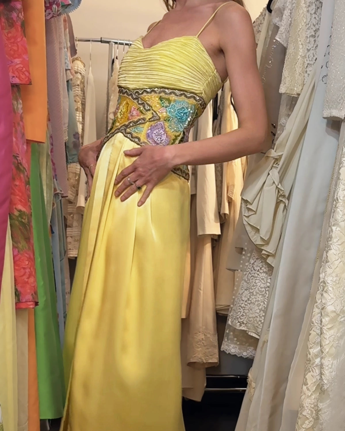 Great vintage condition, with minor wear commensurate with age, including some minor loss to beading (not visible unless closely inspected) and some minor scuffing to the skirt which similarly is not noticeable when worn. It is ready to wear and presents beautifully. With any questions about the specific condition or size, please email shop@verybreezy.com for additional photos or measurements, as all sales are final.