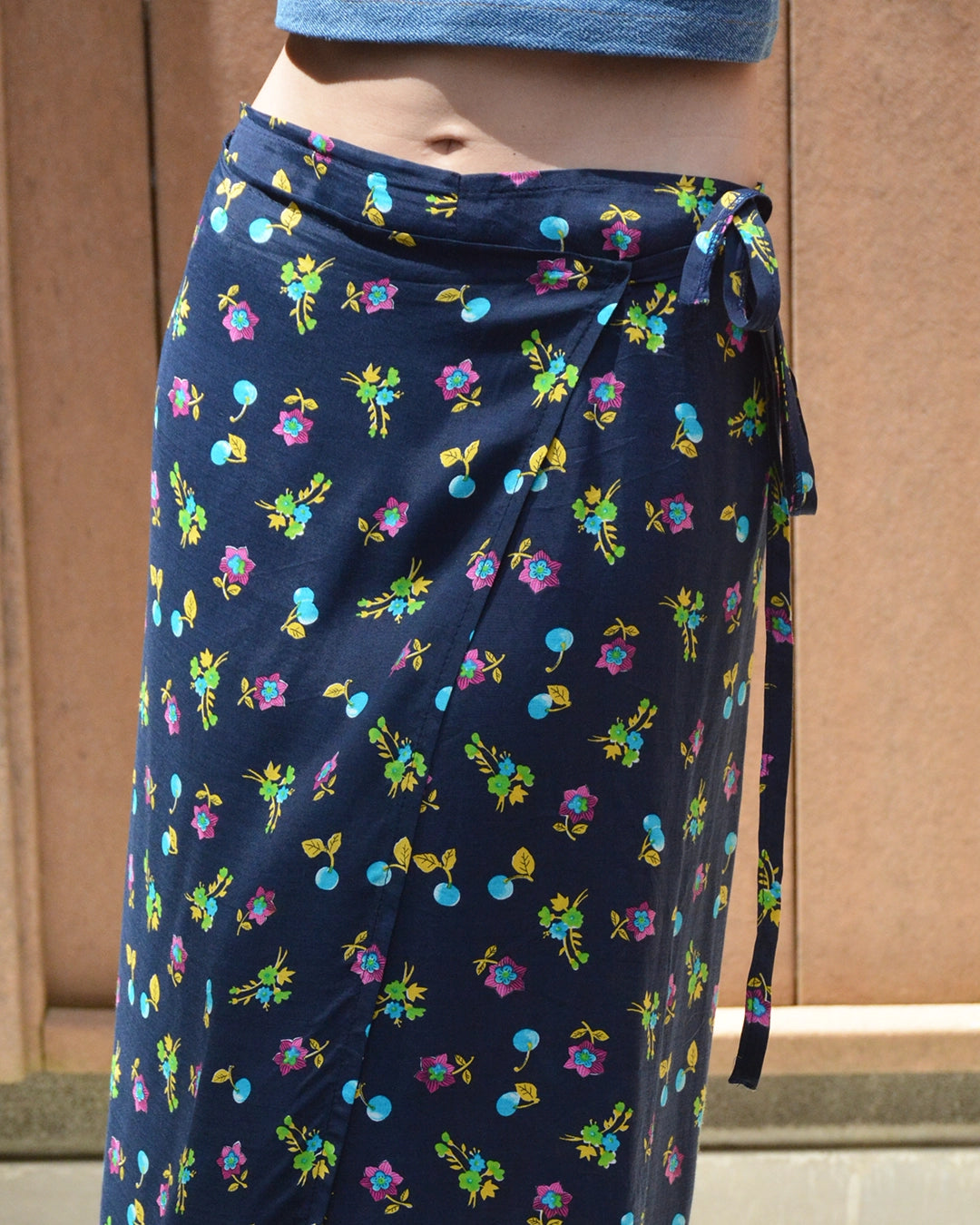 This vintage 90s printed wrap skirt is such an easy wardrobe staple, and SO packable— it rolls up into almost nothing in a bag! So easy to throw into a tote as a chic swim coverup as well. The fabric is so soft and almost silky— great for warmer weather. It features a sweet blueberry and floral print against a navy blue background. Because of the tie closure, the sizing if flexible, as is how you can style it— and can be pulled tighter and worn on the natural waist, or lower on the hips (as shown).
