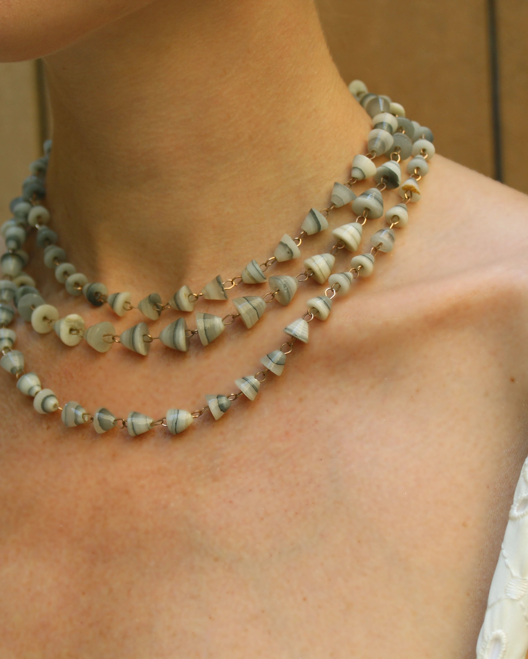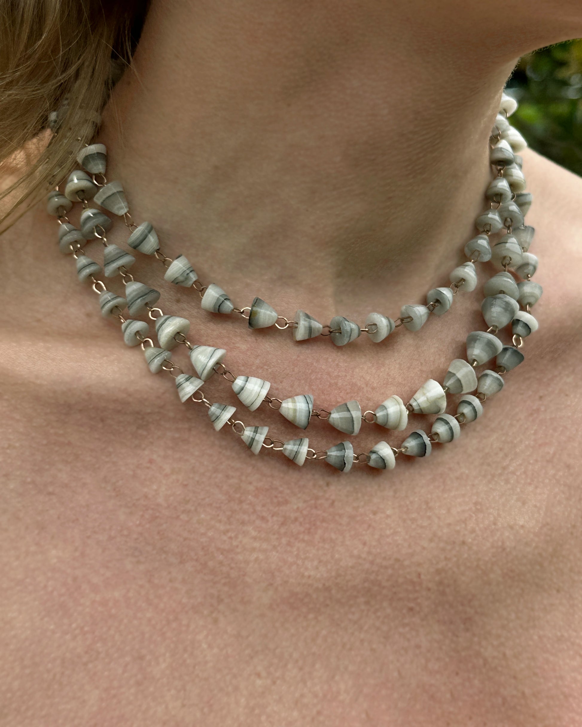 This magical necklace is hand-strung with agate beads: there is so much to love, from the natural marbling of the grey agate, to their unusual bell shape. The gems are spaced out for a sort of "rosary" effect that I love so much. The connecting chain is super delicate and lets the beauty of the gemstones shine through. The necklace is actually quite long; it has a discrete hook closure, which makes it possible to double, triple, or wear a number of ways—like as a belt. It total, the length is 52".