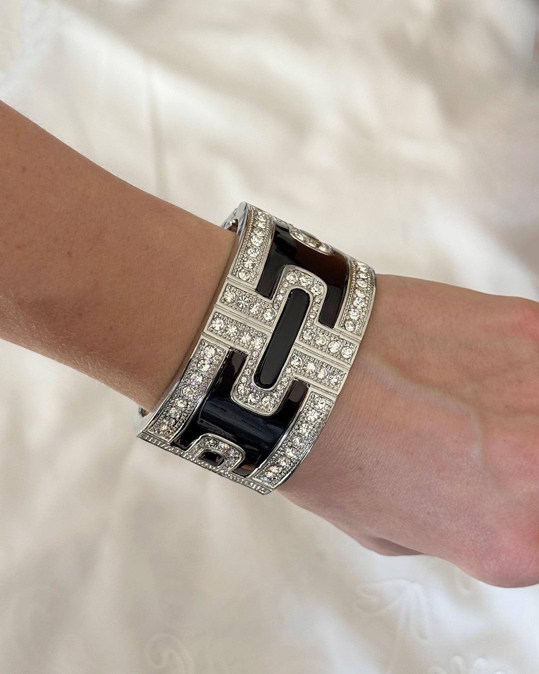 This vintage Art Deco black enamel bracelet emulates the statement bracelets of the 1930s. A substantial piece, it features black enamel inlay in a geometric form, offset with crystals and millegrain texture. It is not signed but Ciner made an identical bracelet. It has a hinged clasp, fastening with a magnetic strip, which keeps it firmly in place. The interior measures 58 mm x 50.5 mm.