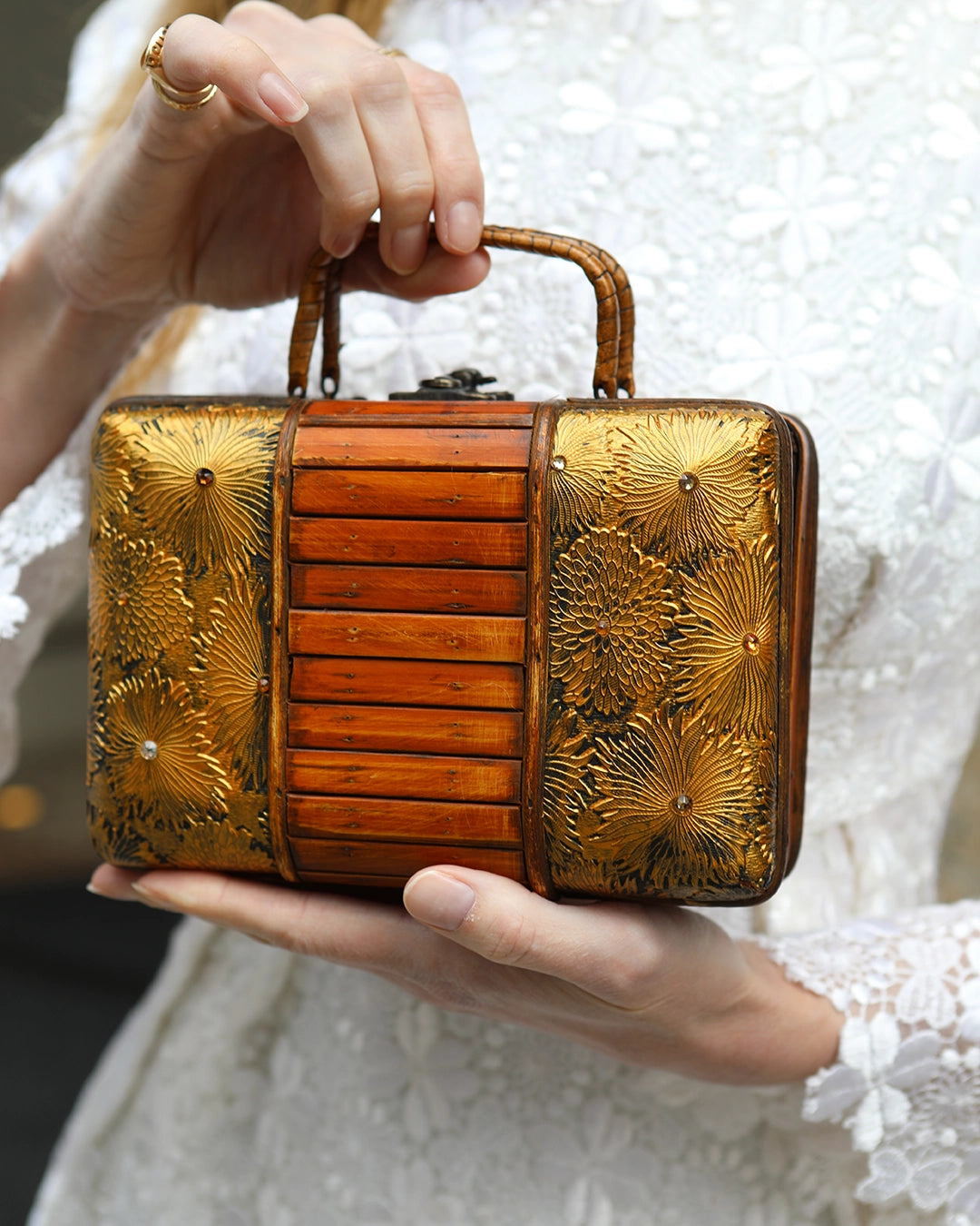 This vintage bamboo and embossed floral box bag is so adorable and the perfect size. It has an miniature suitcase-like shape with a top handle, crafted from wood, with gem-set embossed floral insets. It closes with a metal latch and opens with a hinge.