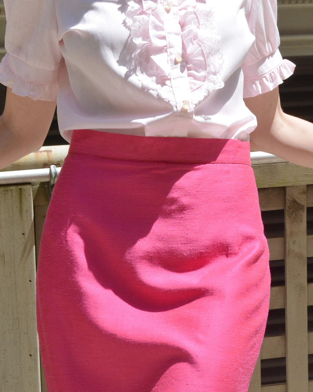This adorable vintage pink miniskirt is a perfect marriage of Barbie core and "Corp-Core" —perfect for the office or a night out depending on how you style it. The fabric is interesting, in what feels like a cotton blend shantung, with a beautiful texture and weight to it. It has a high waist and is fitted through the hips. No fiber contents are listed, feels like a possible cotton/silk/synthetic blend. It would also be so cute hemmed and made into a micro-mini!