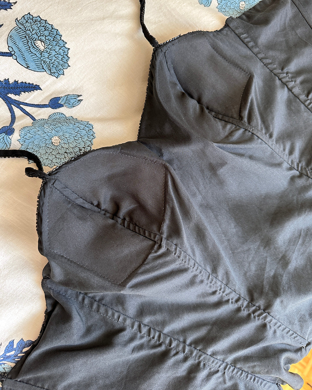 A classic beaded bustier top, with a little Y2K flair. This piece is crafted from 100% silk, and the structure is so flattering, with a fully boned interior and molded bra cups. It features an all-over teardrop motif thats equal parts Art Deco and mermaid. A combination of embroidery and bugle beads creates dimension, allowing the beading to sparkle even more. Closes in the back with a zipper, plus hooks and eye at top and bottom to prevent gaping/insure proper fit.