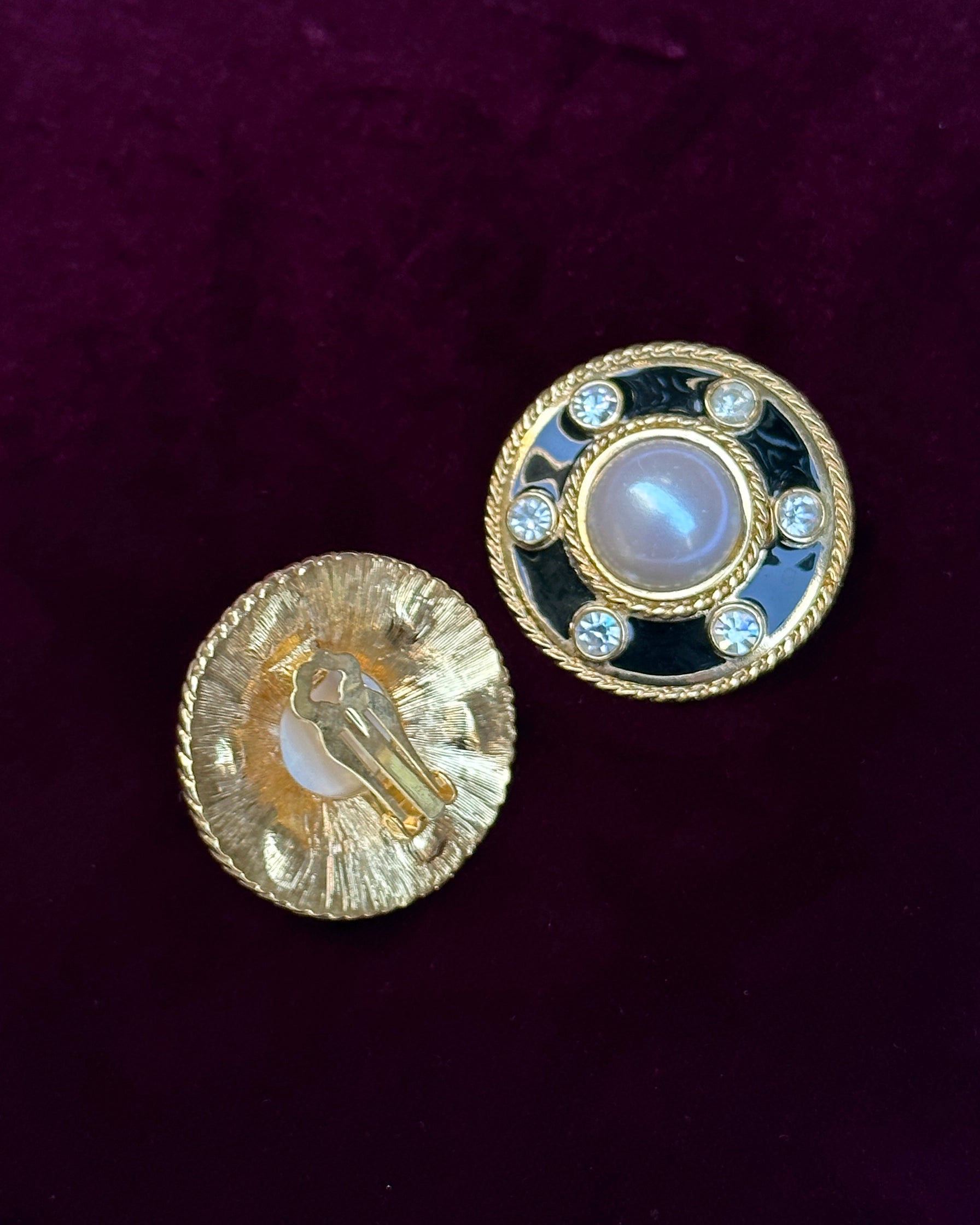These black-and-white vintage earrings are reminiscent of earrings that walked the Chanel runway in the 1990s. Sourced in Europe, they feature a large pearl center, with a crystal-set black enamel halo, bordered by an intricate twisted gold bezel. They have a slightly convex curved shape, creating a sense of substantial size, yet are very lightweight and comfortable to wear, due to their strategic construction. Vintage clip-ons are so much more comfortable and secure to wear compared to their modern counterparts, largely due to the quality and thought that went into their hand-made construction. They fasten with a clip-on lever back, and measure 42mm in diameter.
