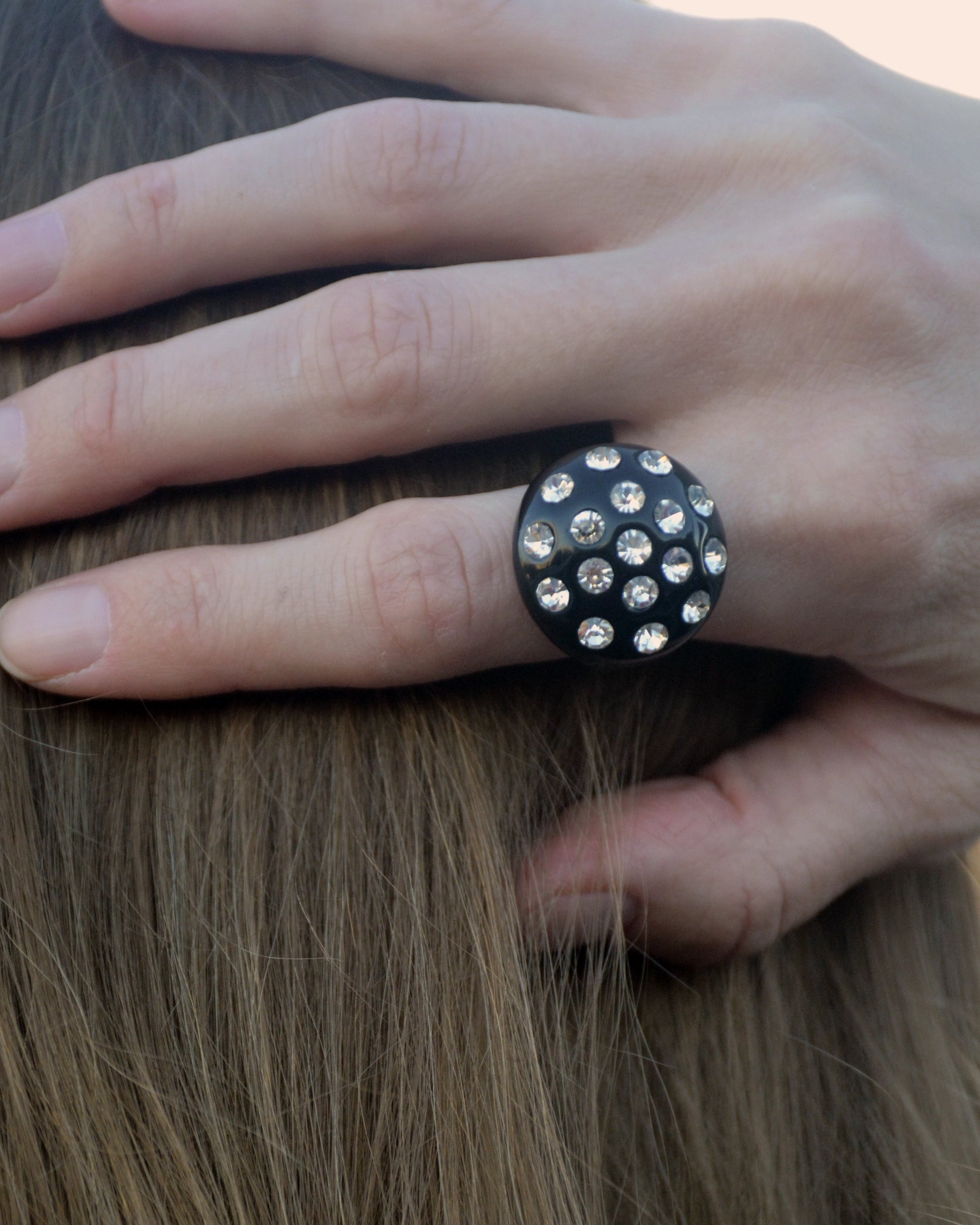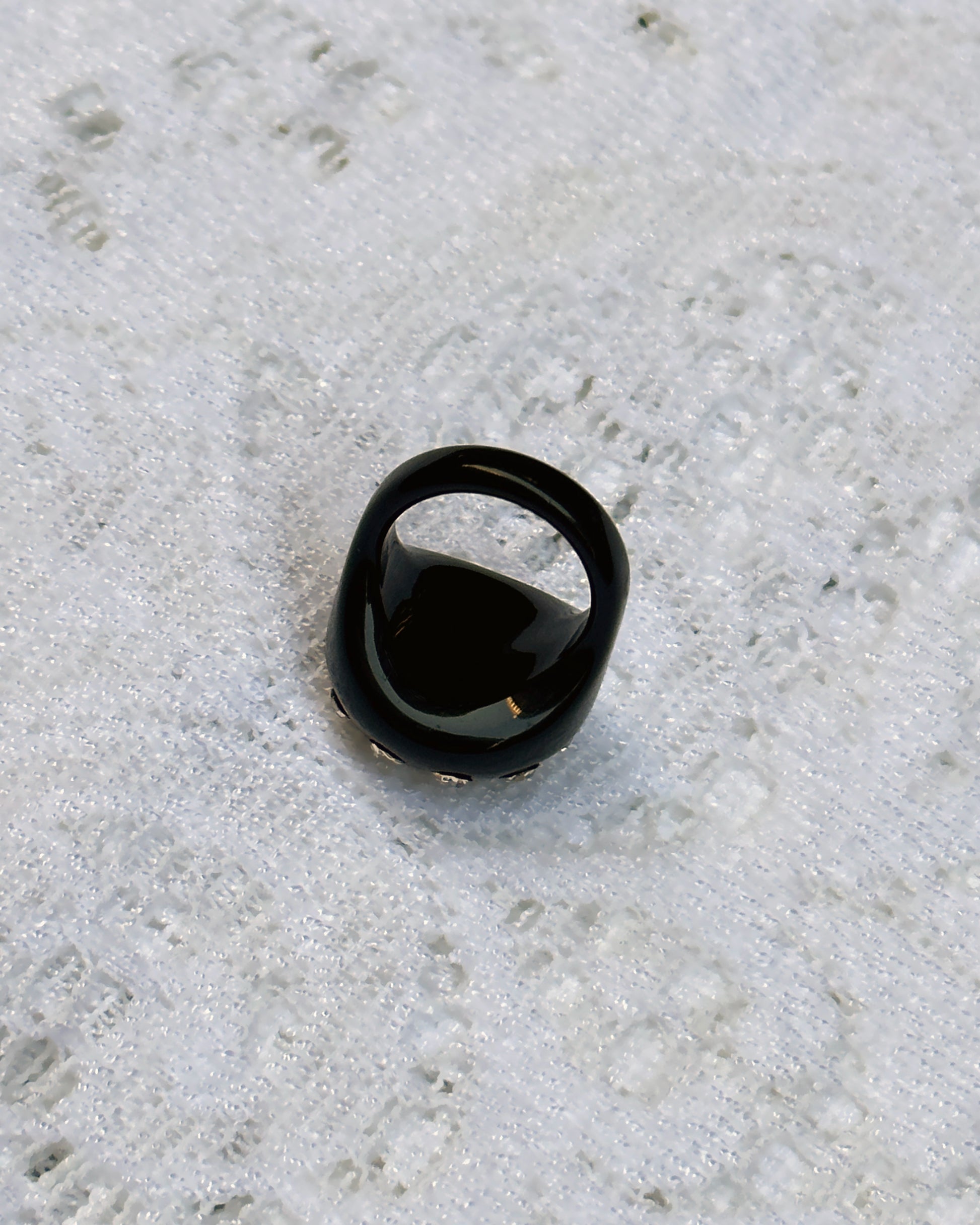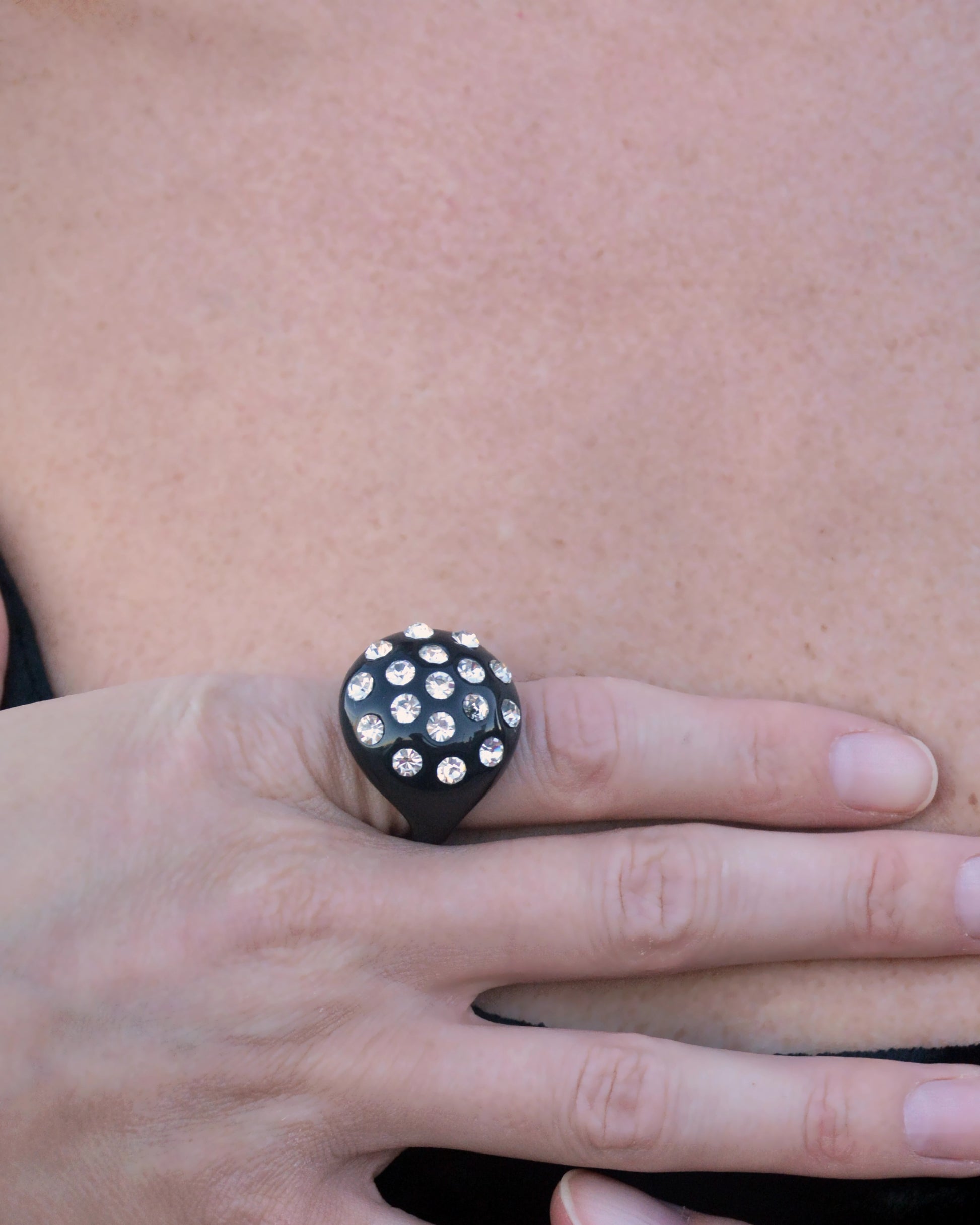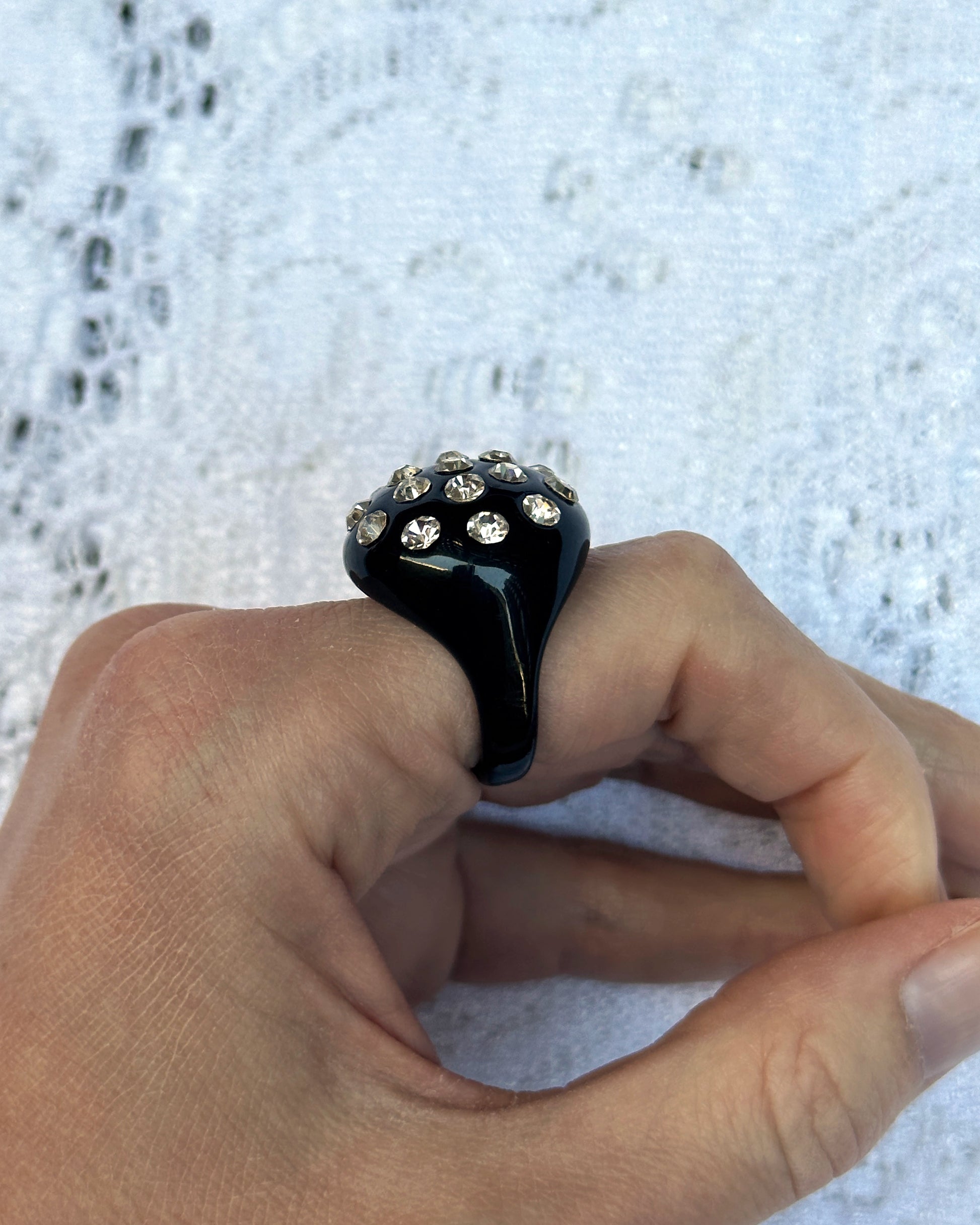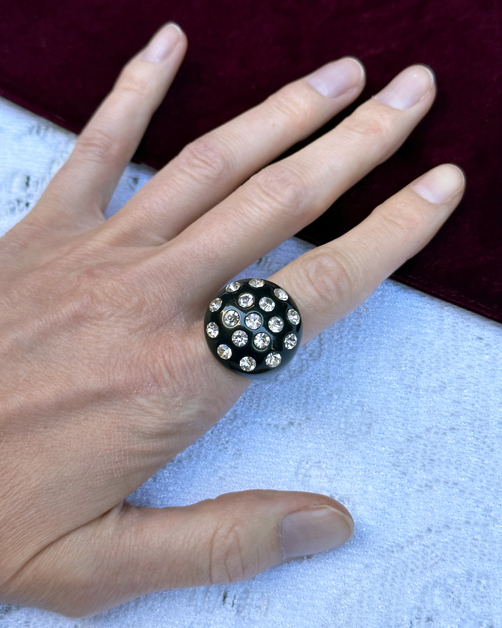 Vintage Black Enamel Crystal-Set Cocktail Ring