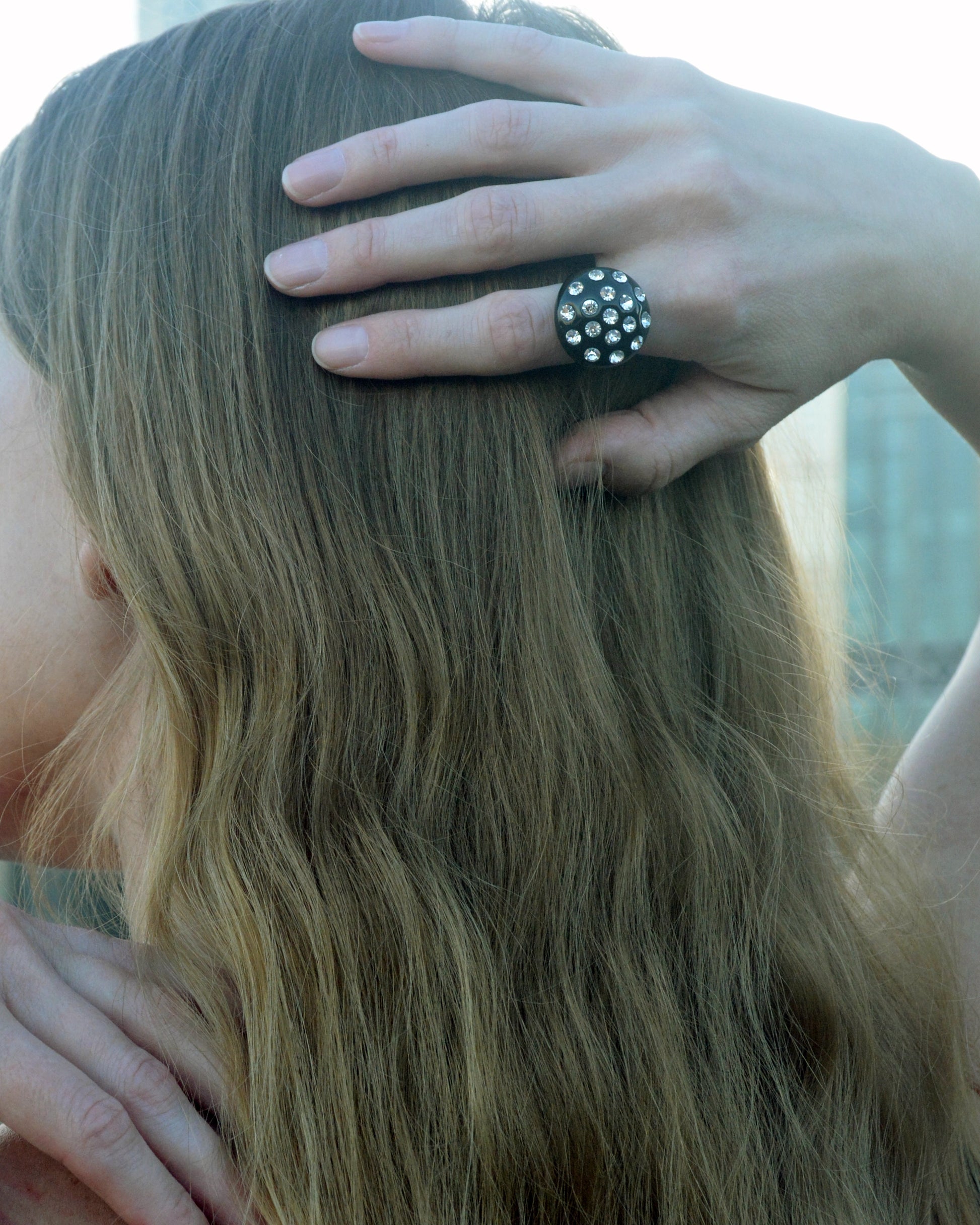 This vintage black enamel crystal-set cocktail ring is such a unique and fun addition to your ring rotation— add it in for an unexpected edge to a party look. It's a substantial size, but remains lightweight due to its handmade construction. The ring's head is bezel-set with crystals. US ring size 6.25.