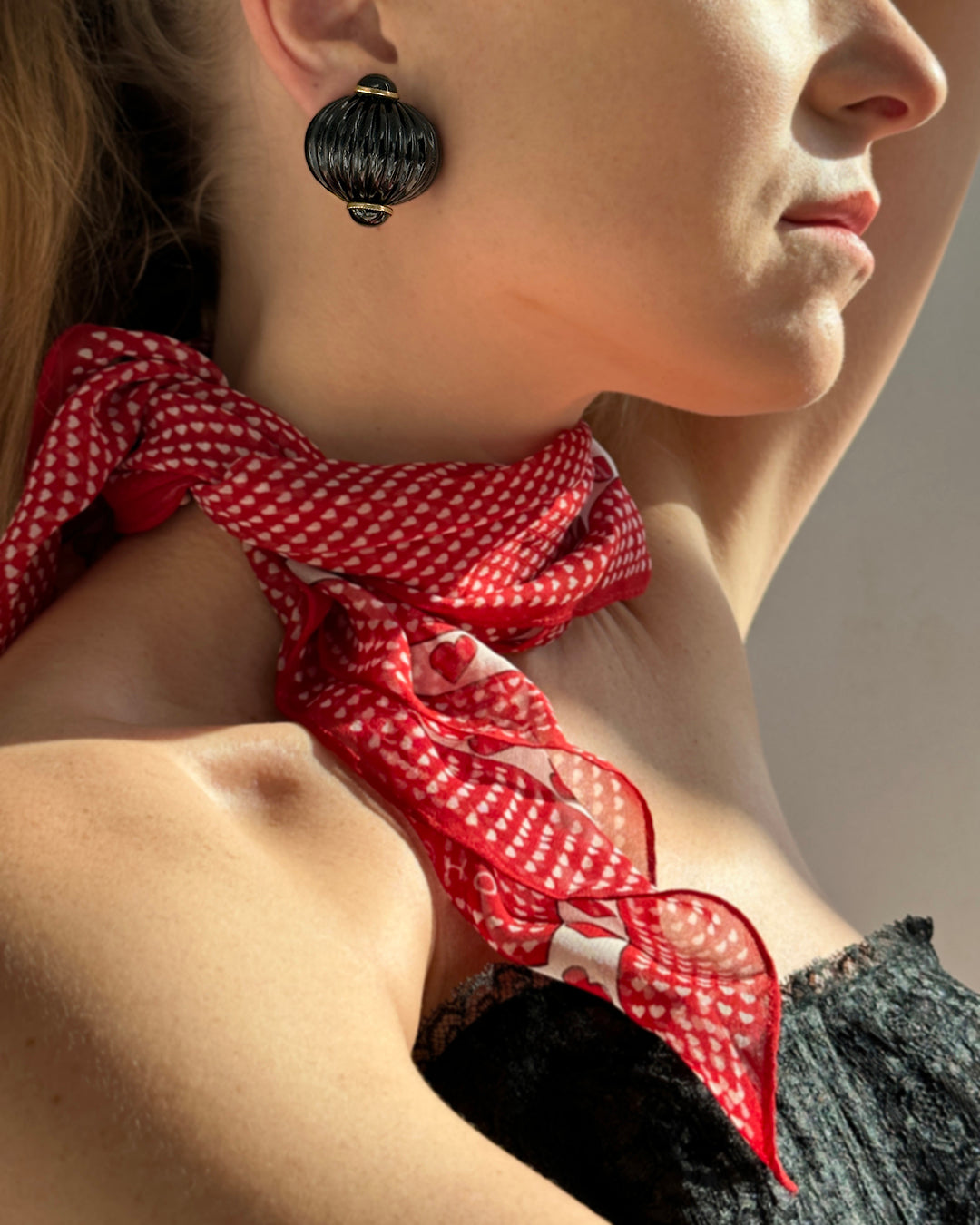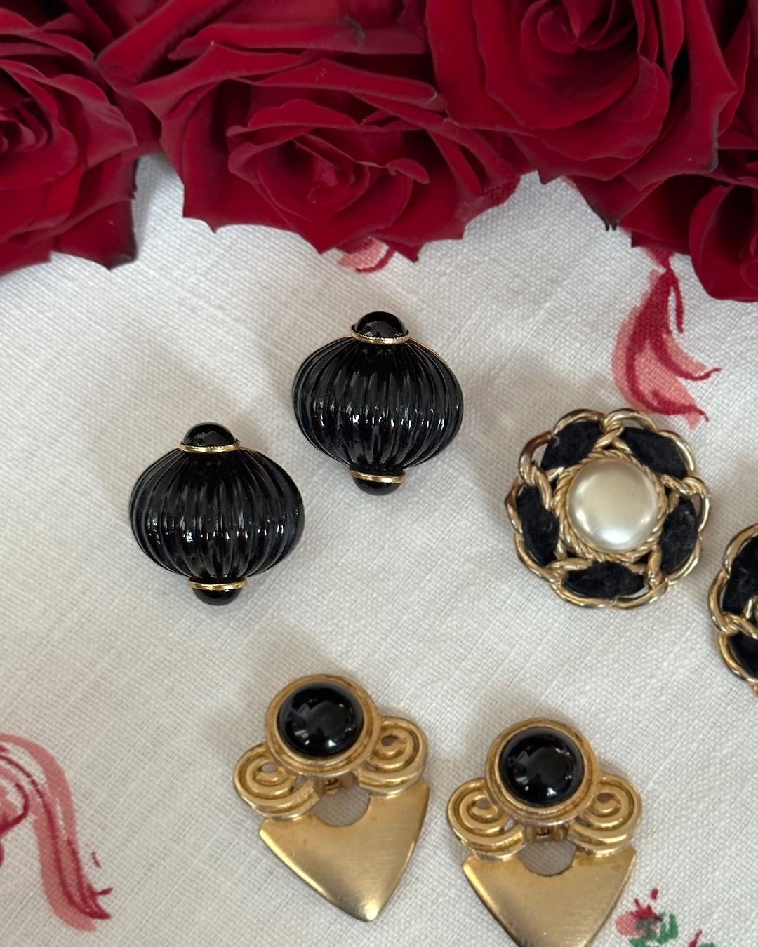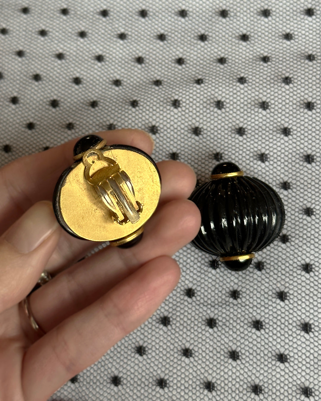 I completely adore these vintage earrings, which remind me of the classic Seaman Schepps shell earrings. I love the juxtaposition of the shell shape with the dark, onyx hue. They are exceptionally well-crafted and as a result are very comfortable to wear. Measures about 3 cm long x 3 cm wide, and finished with a clip-on lever back.
