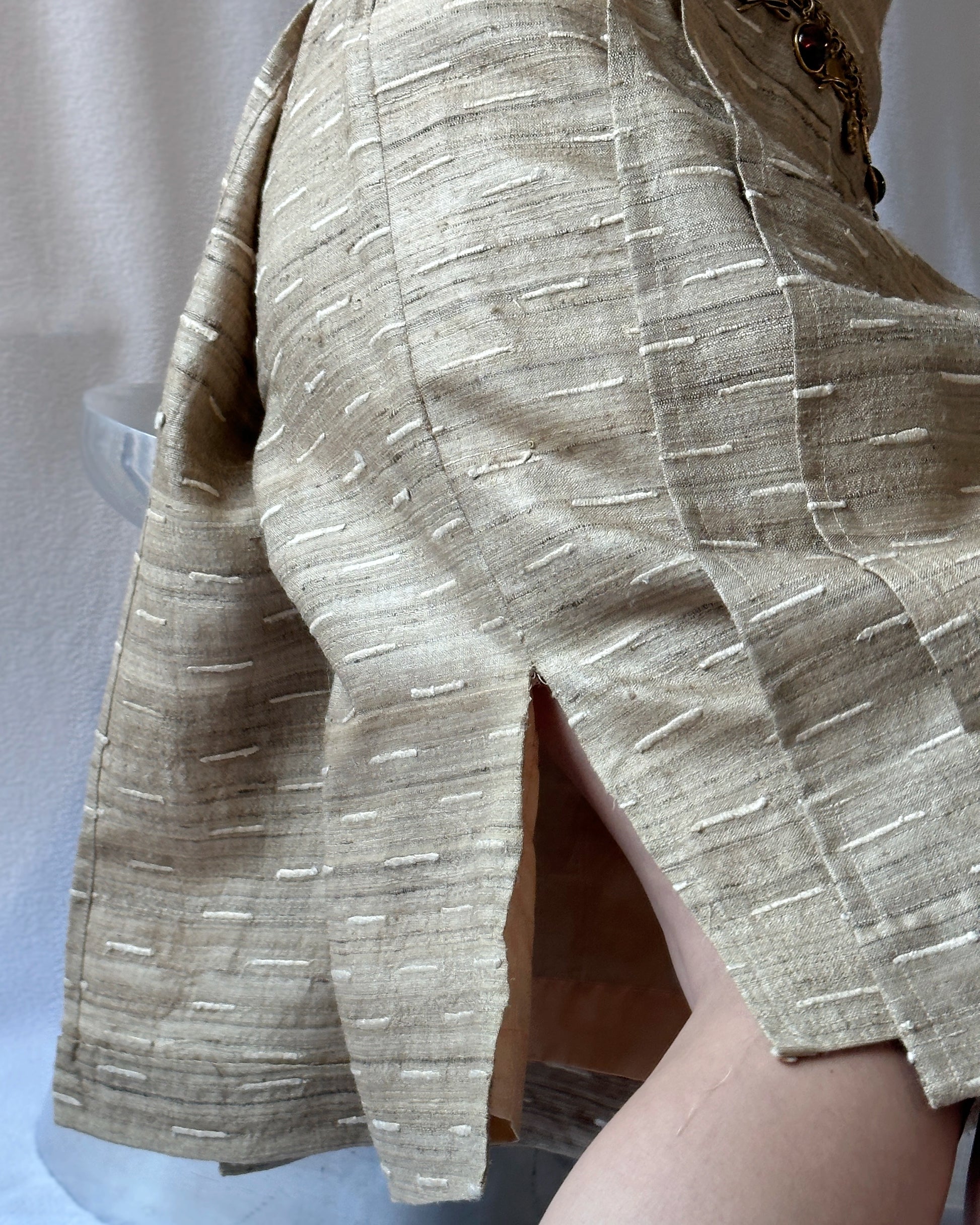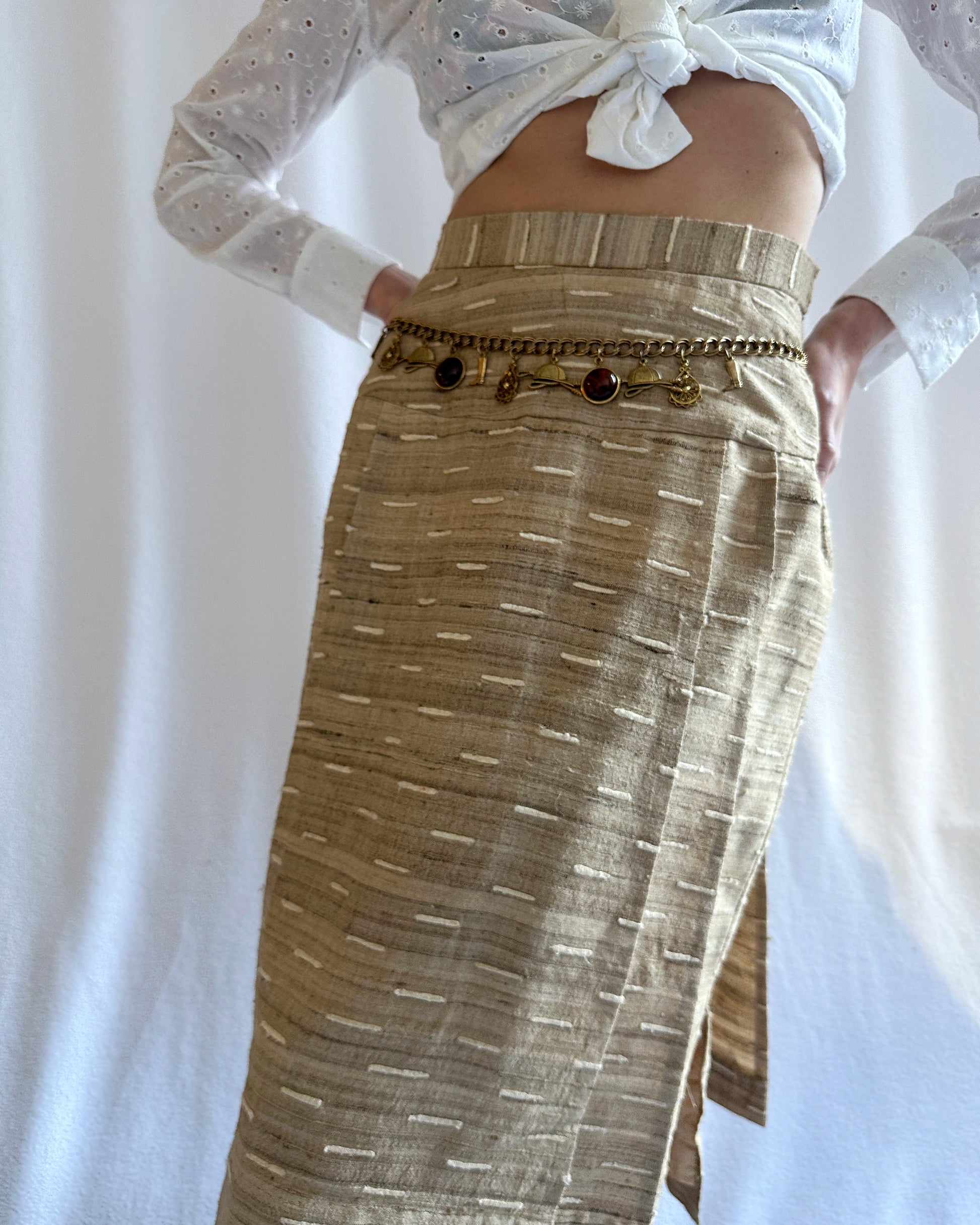 This vintage bouclé skirt features a very interesting, unique kilt shape— i've never seen something quite like it. In a flax color, it has a bouclé texture in what feels to be a linen blend. The skirt has pleats on the side, but the front and back panels are actually a trompe l'oeil flap overlay. It can be worn at the waist, or lower on the hips, so it will fit a range of sizes depending on your desired fit. The Vintage White Eyelet Blouse pictured is also available.