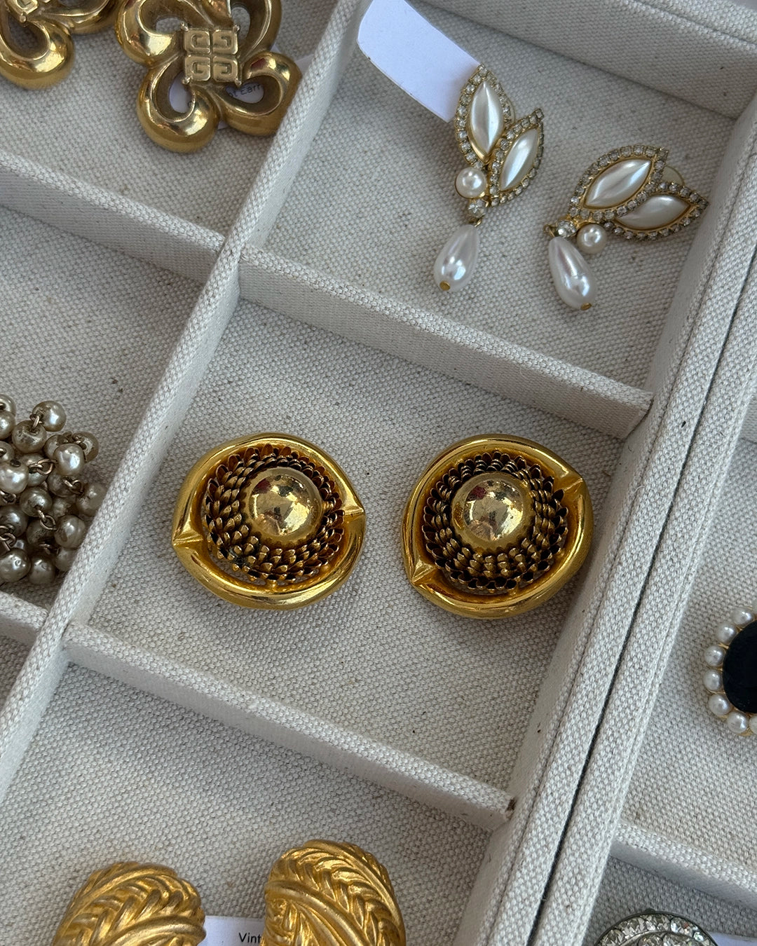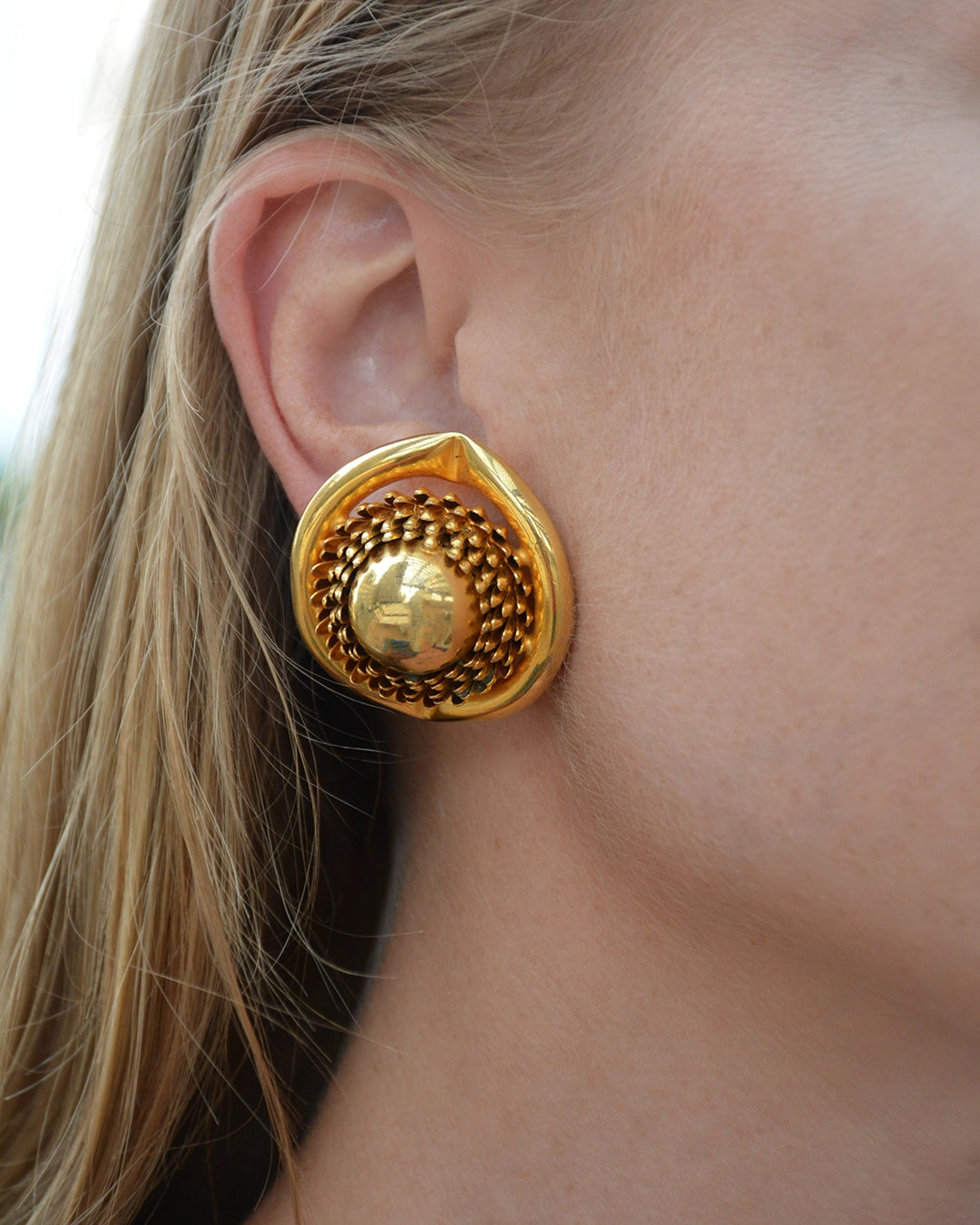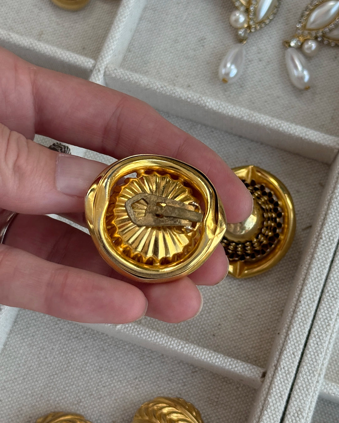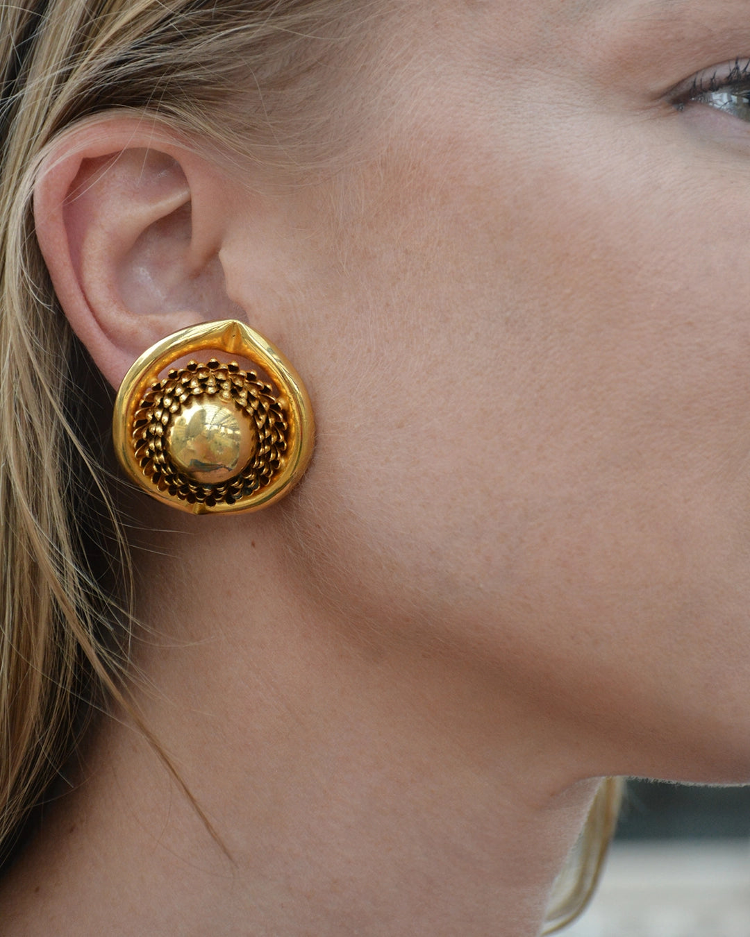 These chunky gold earrings are so unique and striking— they resemble the center of a sunflower, with sculptural, lifelike details. They are finished with a clip-on lever back; vintage clip-ons are so much more comfortable and secure to wear compared to their modern counterparts, largely due to the quality and thought that went into their hand-made construction. They measure about 38 mm long x 35 mm wide.