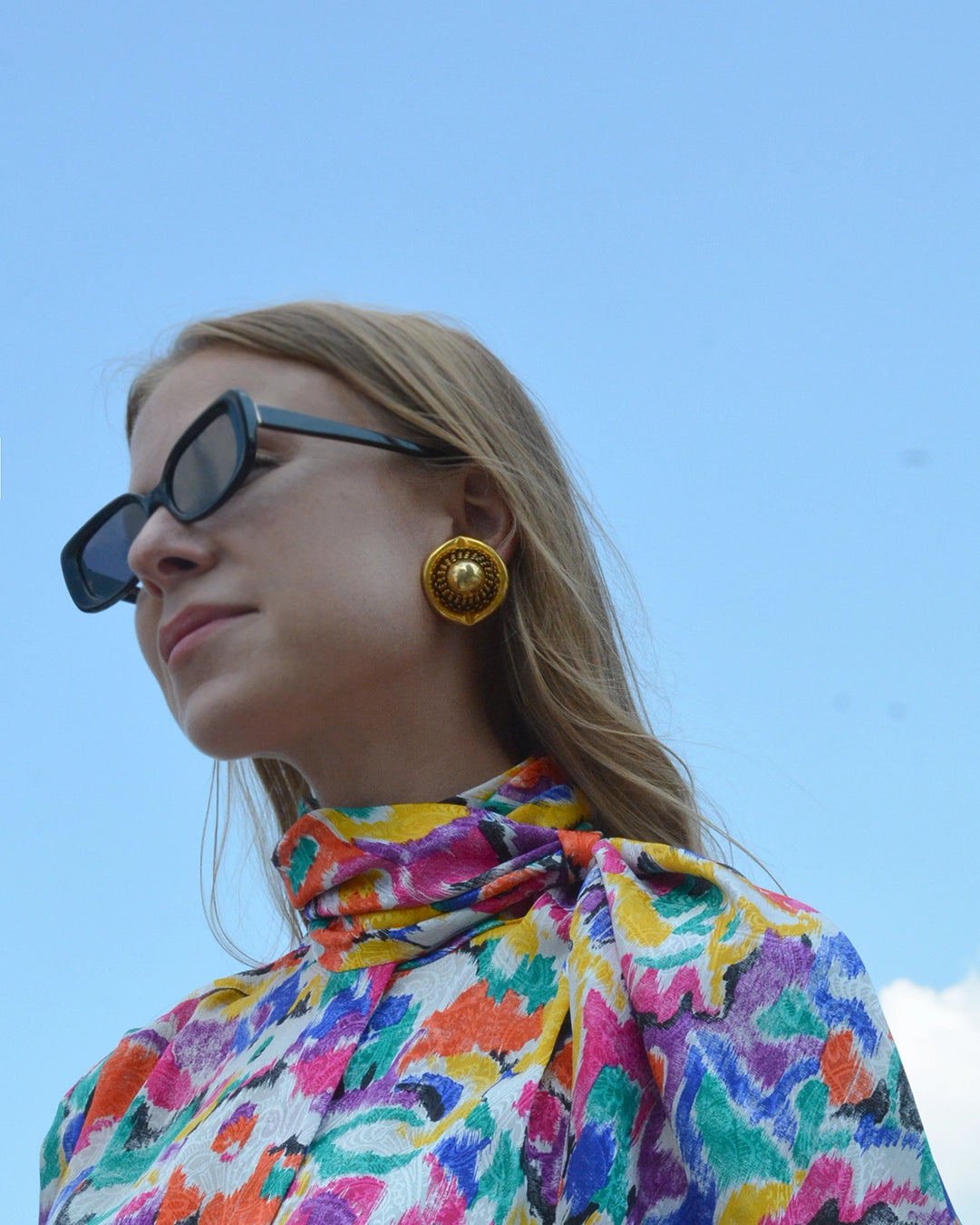 The Vintage Abstract Ikat Print Ascot Blouse and other vintage earrings pictured are also available.