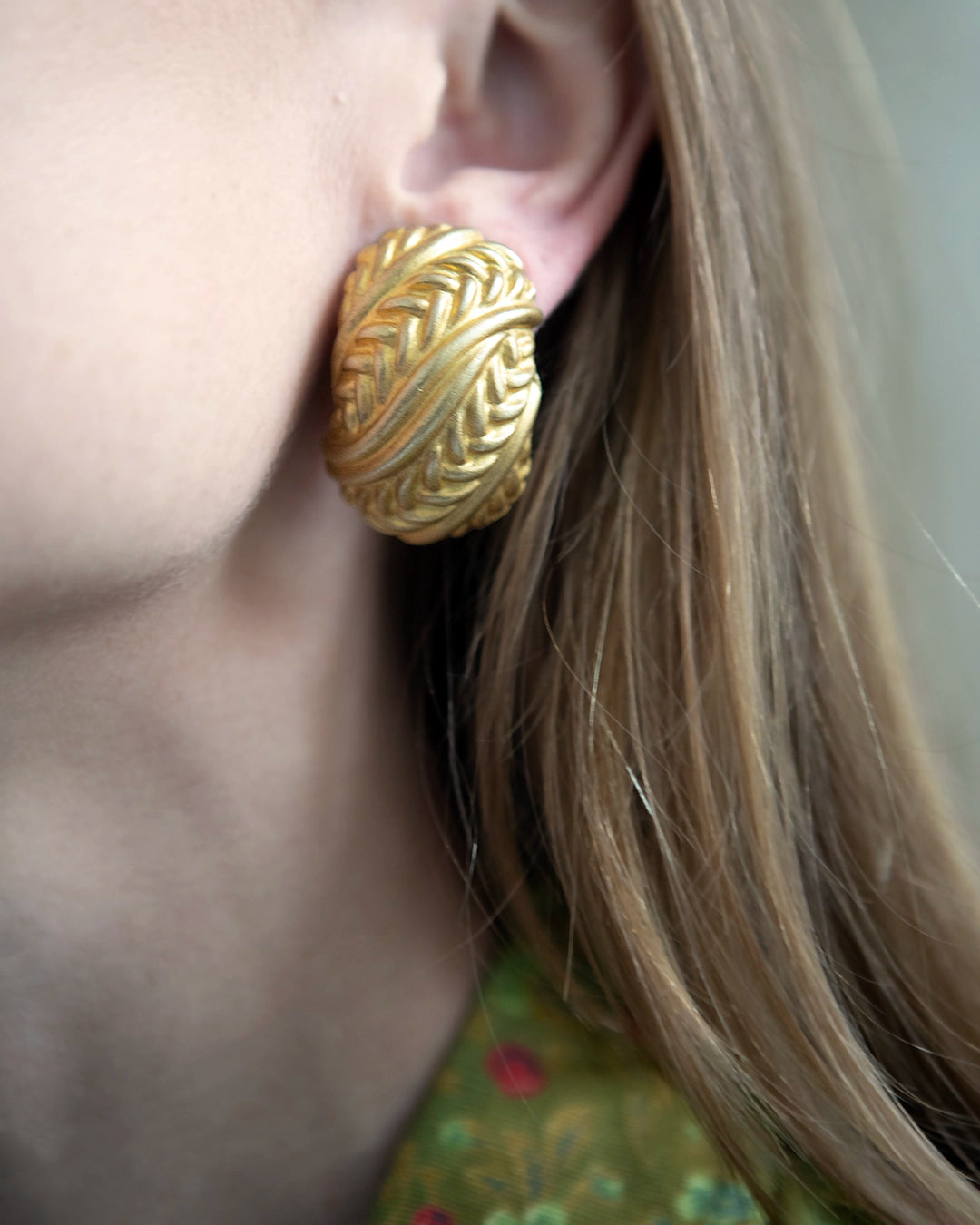 I am absolutely in love with these vintage chunky gold half-hoop earrings. They have a braided texture and a brushed gold finish. They look so expensive and are classic enough to wear with anything, dressed up or down. They are finished with a clip-on lever back; vintage clip-ons are so much more comfortable and secure to wear compared to their modern counterparts, largely due to the quality and thought that went into their hand-made construction.