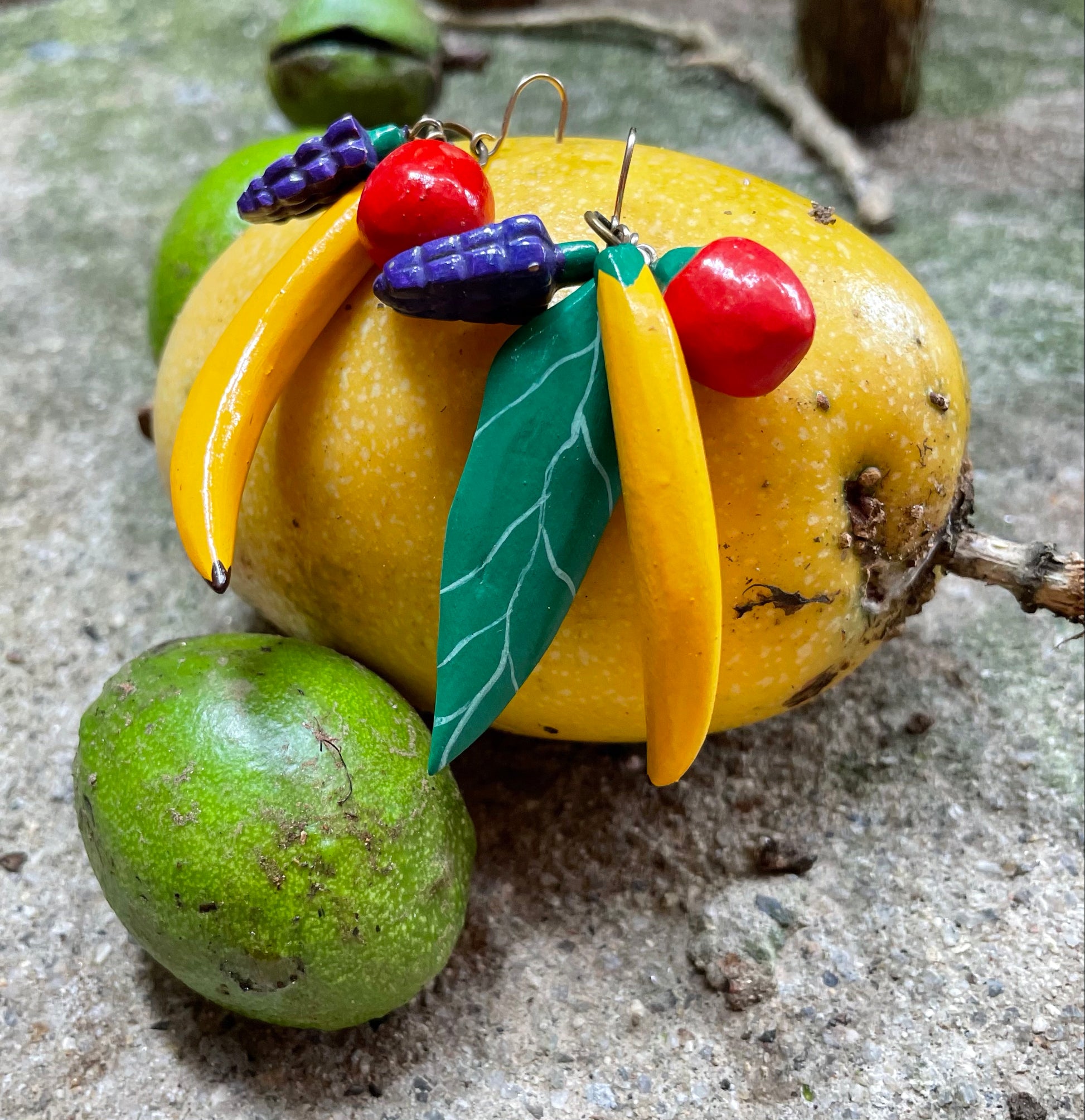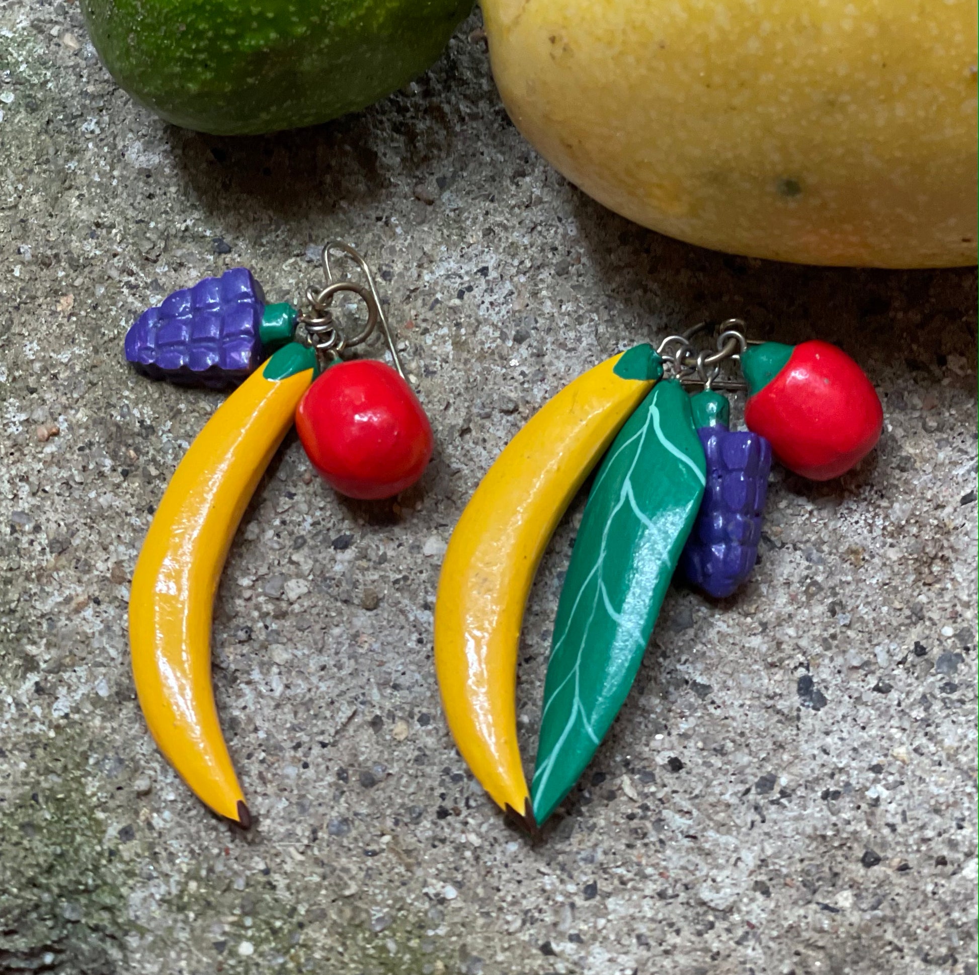 These earrings are so special and totally one-of-a-kind! Made of hand-carved, hand-painted wood in the shape of fruits: a banana, grapes, tomato. They are asymmetrical and one side additionally features a palm leaf. They are super lightweight, and have great movement, because each charm swings independently. These are post-back earrings for pierced ears. Measures 2.75" total drop.